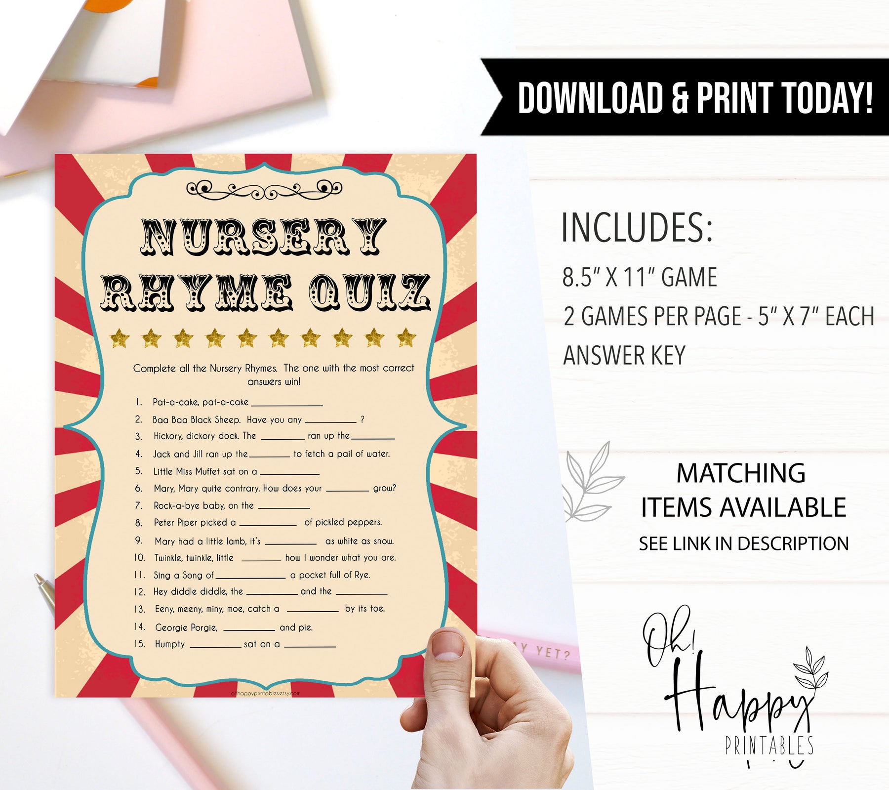 Circus baby nursery rhyme quiz baby shower games, circus baby games, carnival baby games, printable baby games, fun baby games, popular baby games, carnival baby shower, carnival theme