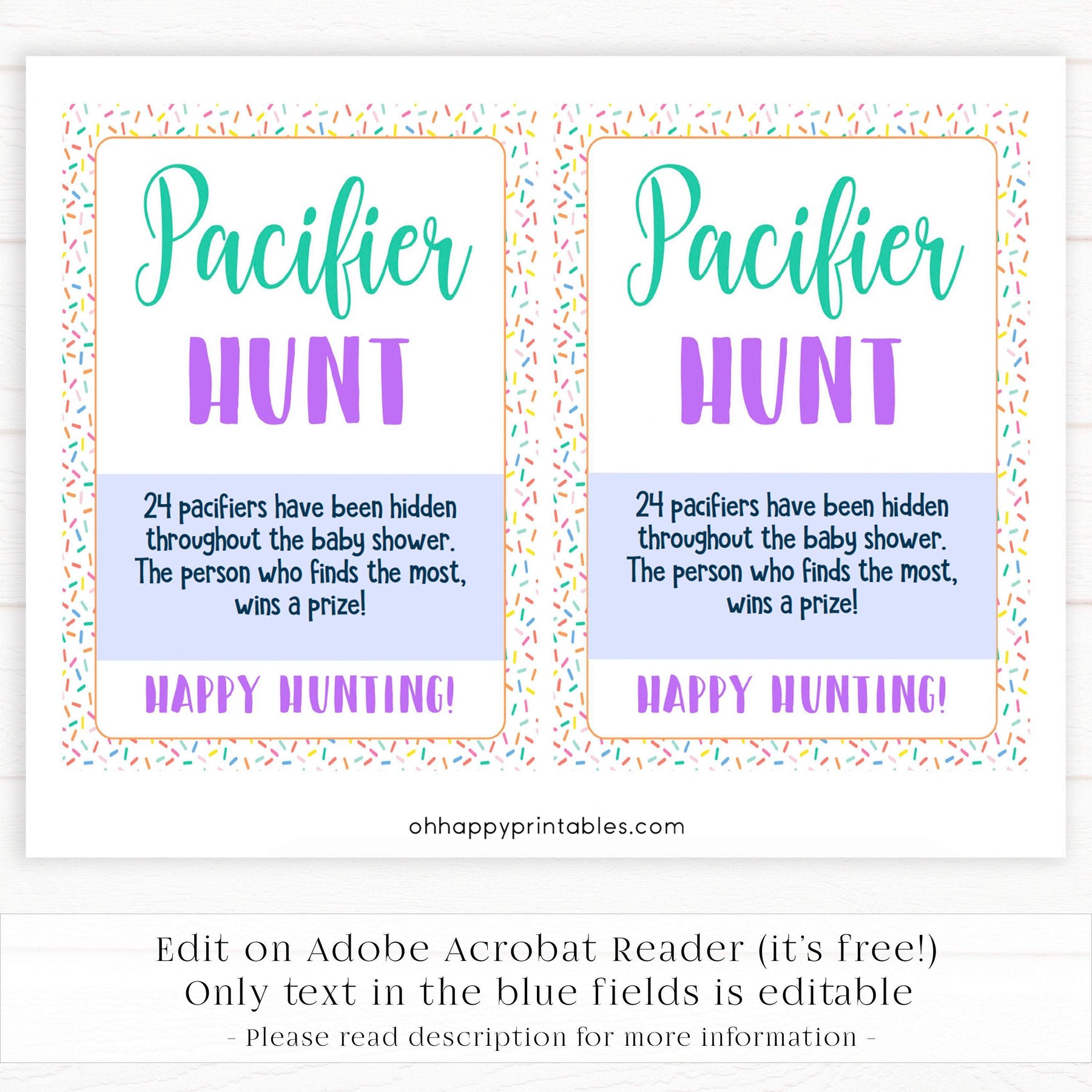 The Pacifier Hunt is a great baby shower game that gets everyone out of their seat and having fun. A twist on the traditional treasure hunt, friends and family have to find the pacifiers that you've hidden around your baby shower party. You can give prizes to winners. Get hunting!