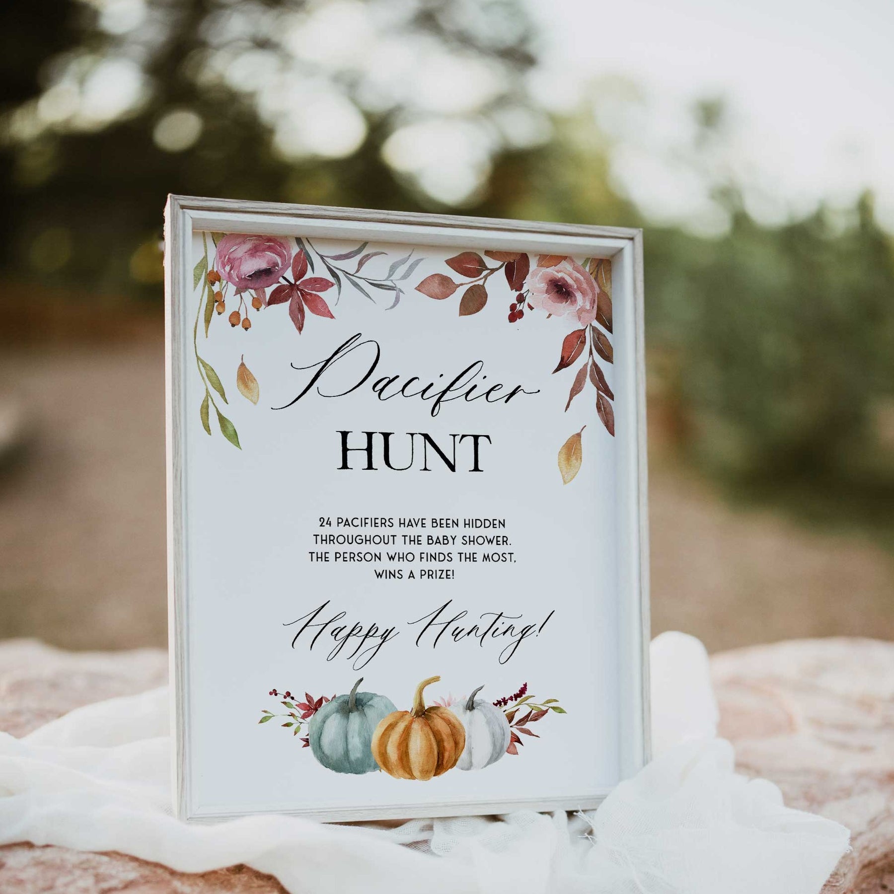 Fully editable and printable baby shower pacifier hunt game with a fall pumpkin design. Perfect for a Fall Pumpkin baby shower themed party