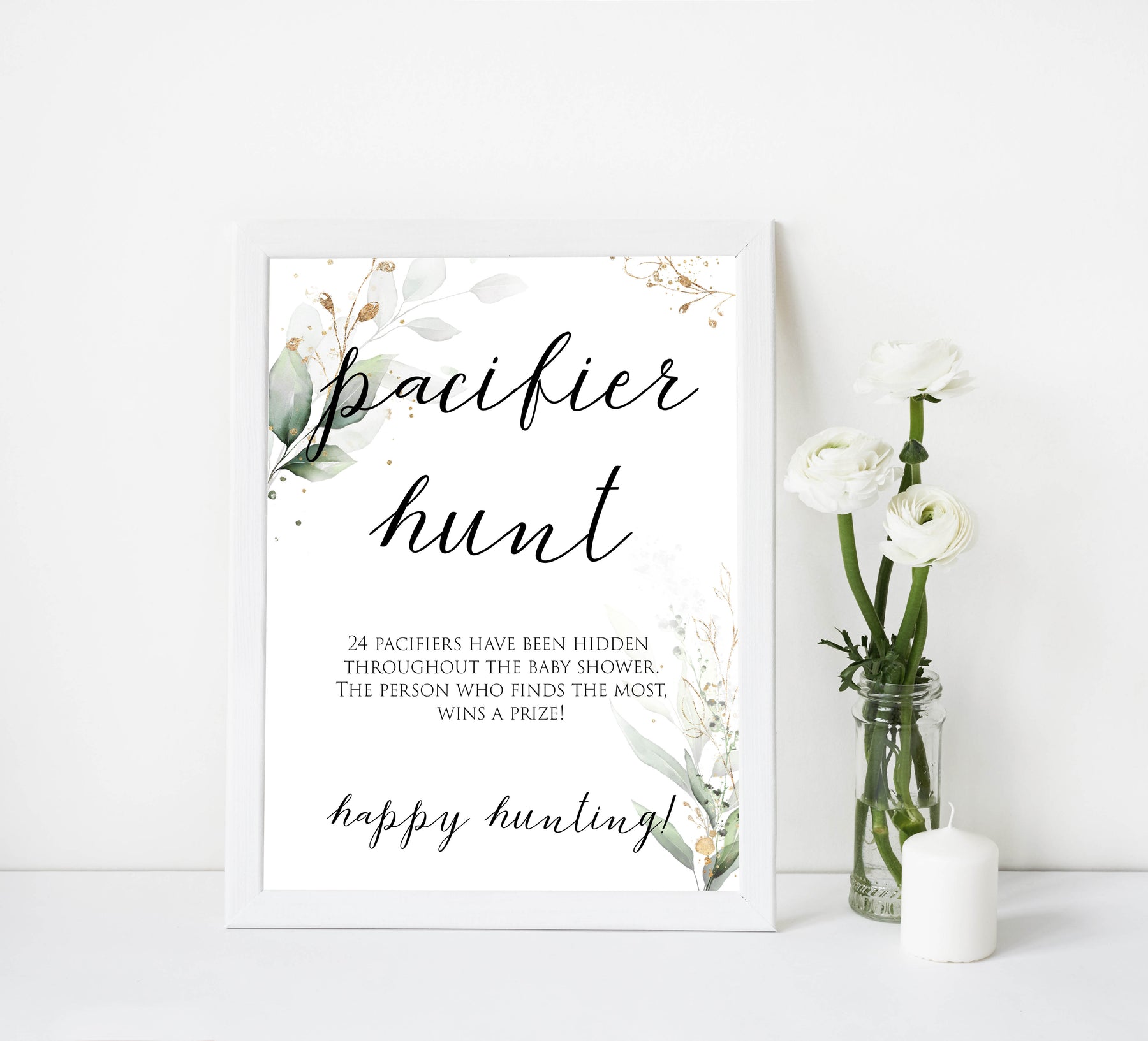 Gold green leaf baby games, pacifier hunt, printable baby games, fun baby games, top baby games to play, gold leaf baby shower, greenery baby shower ideas