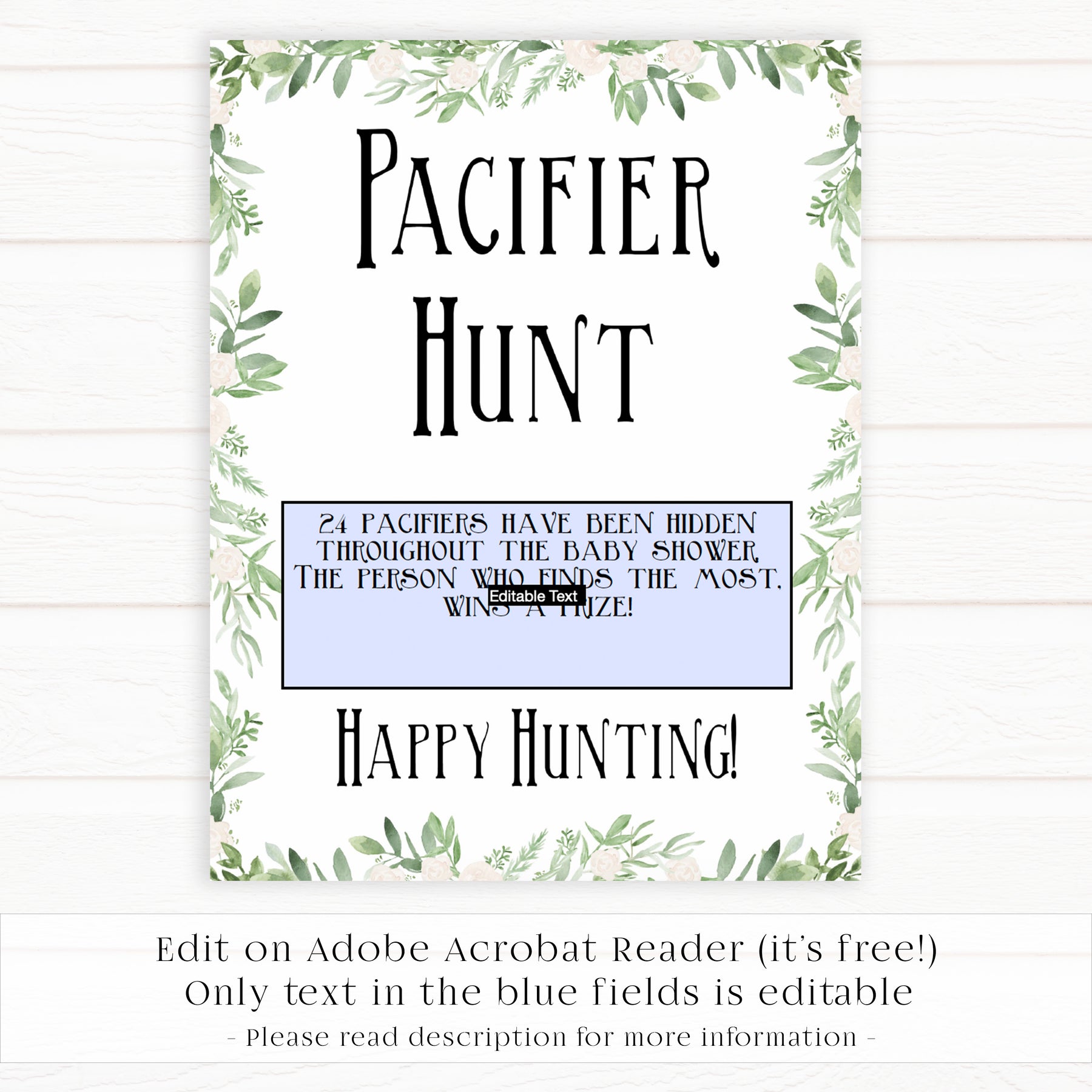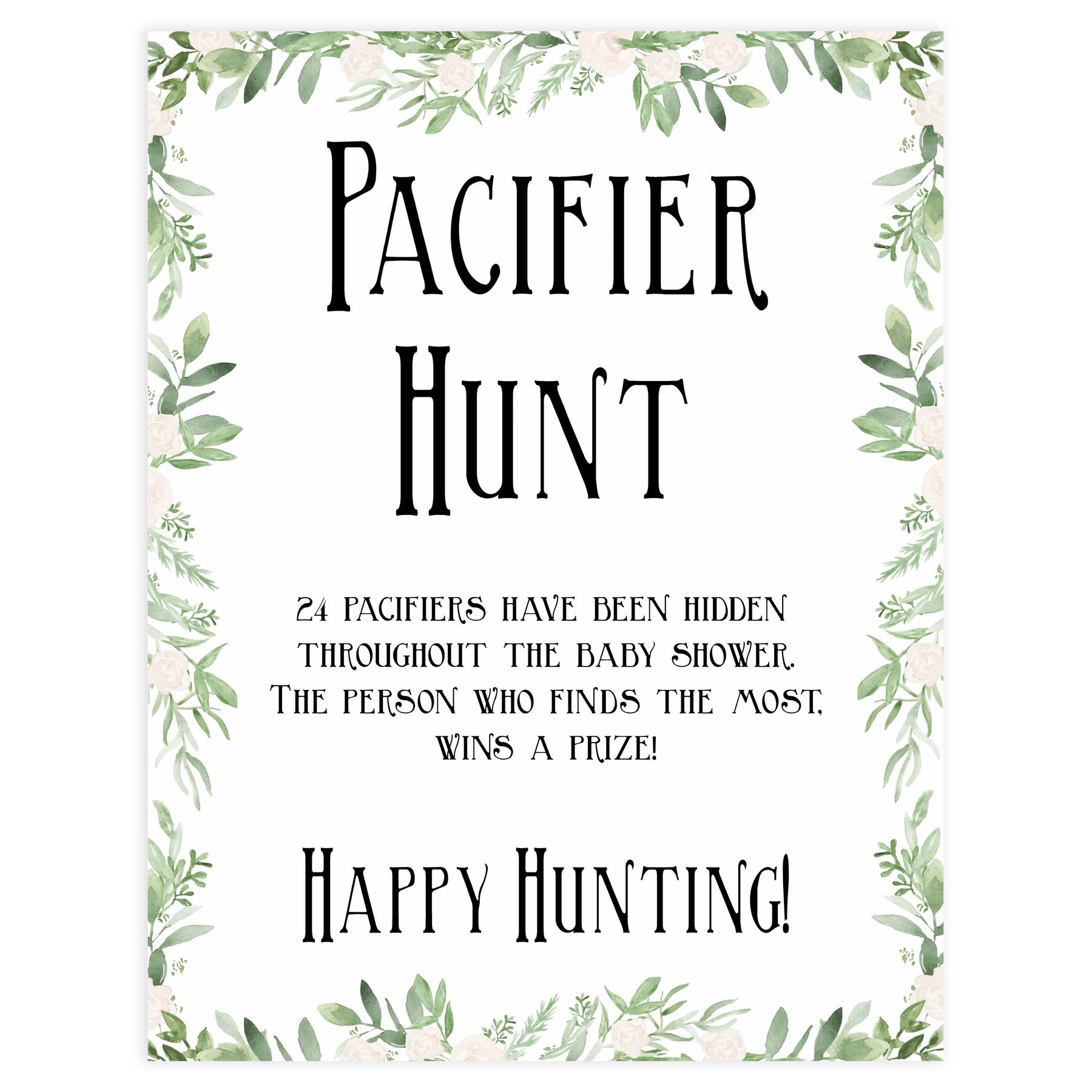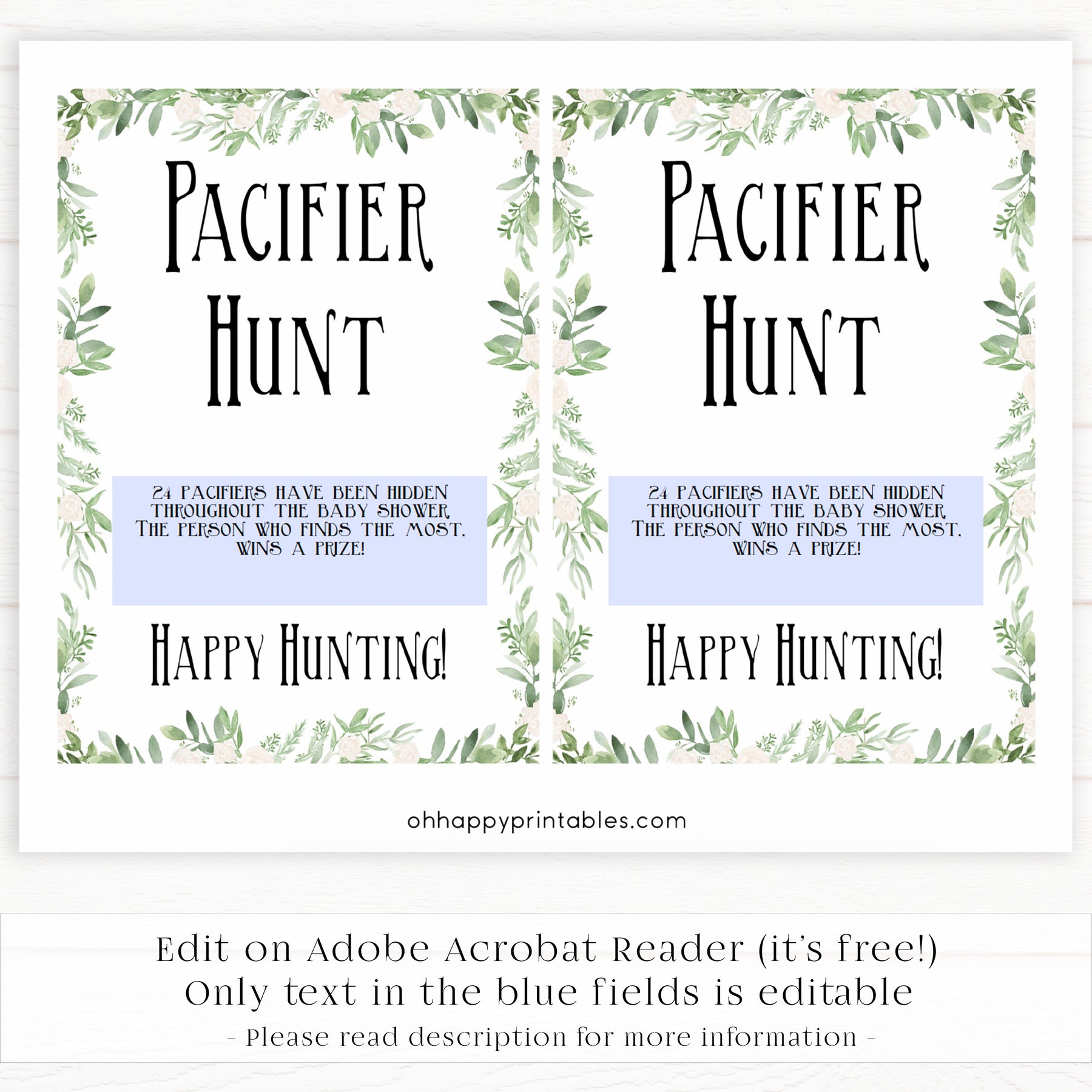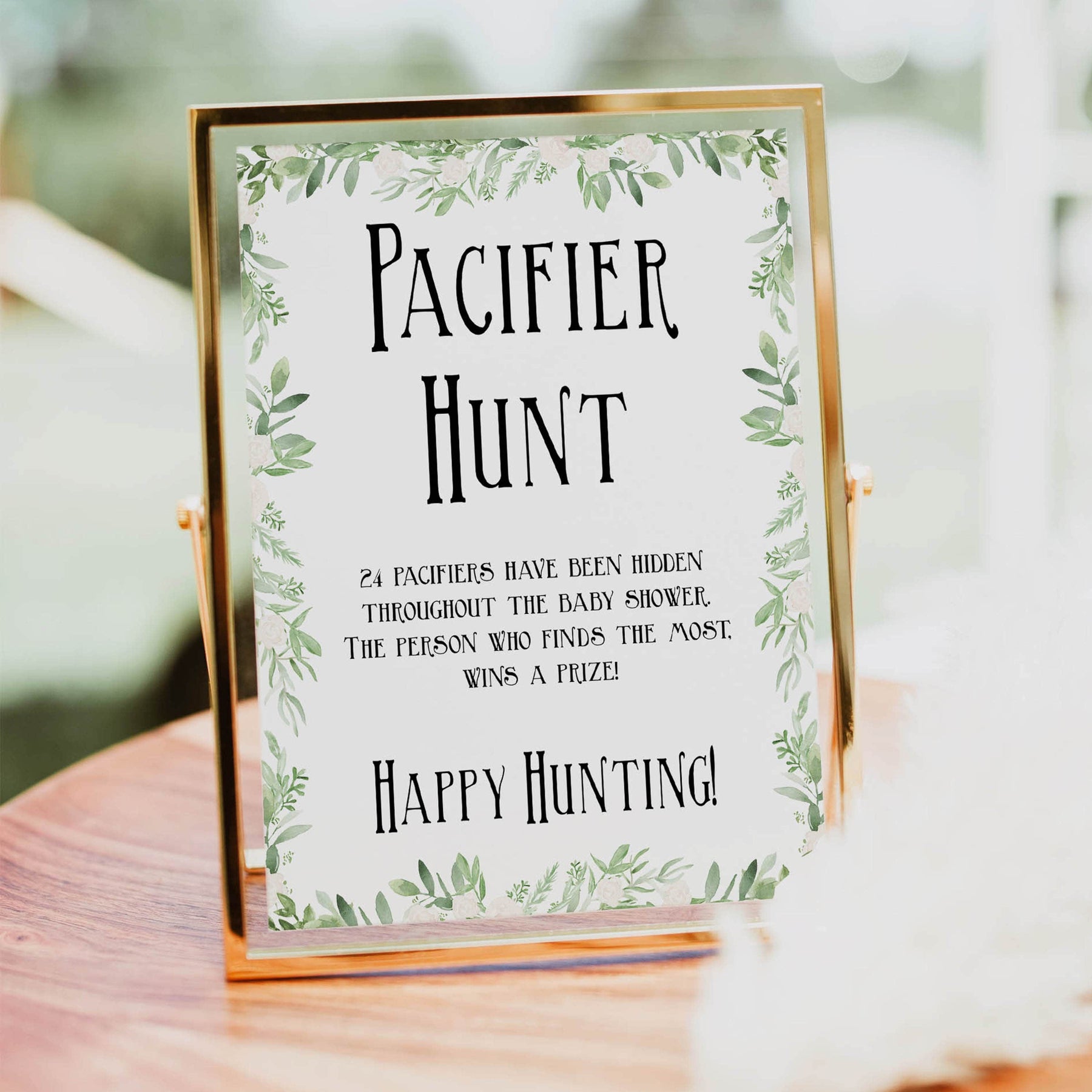 Pacifier hunt baby game, Printable baby shower games, greenery baby shower games, fun floral baby games, botanical baby shower games,
