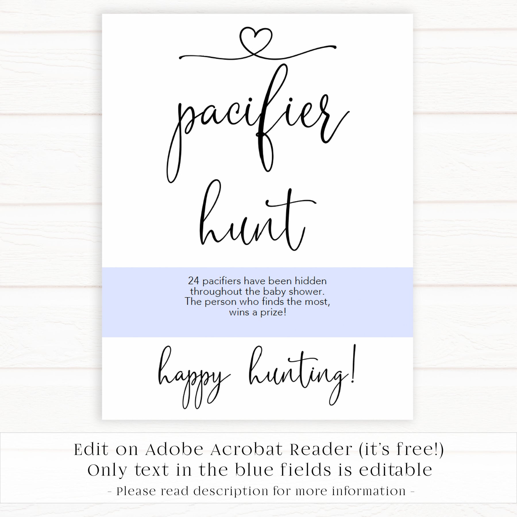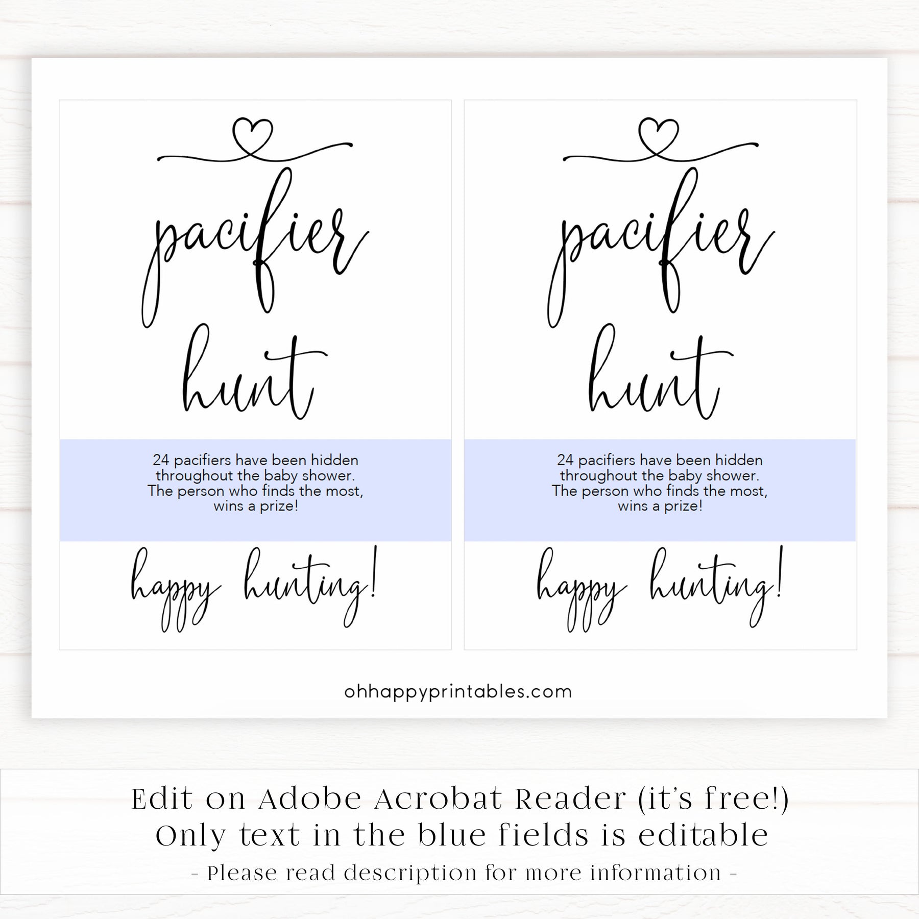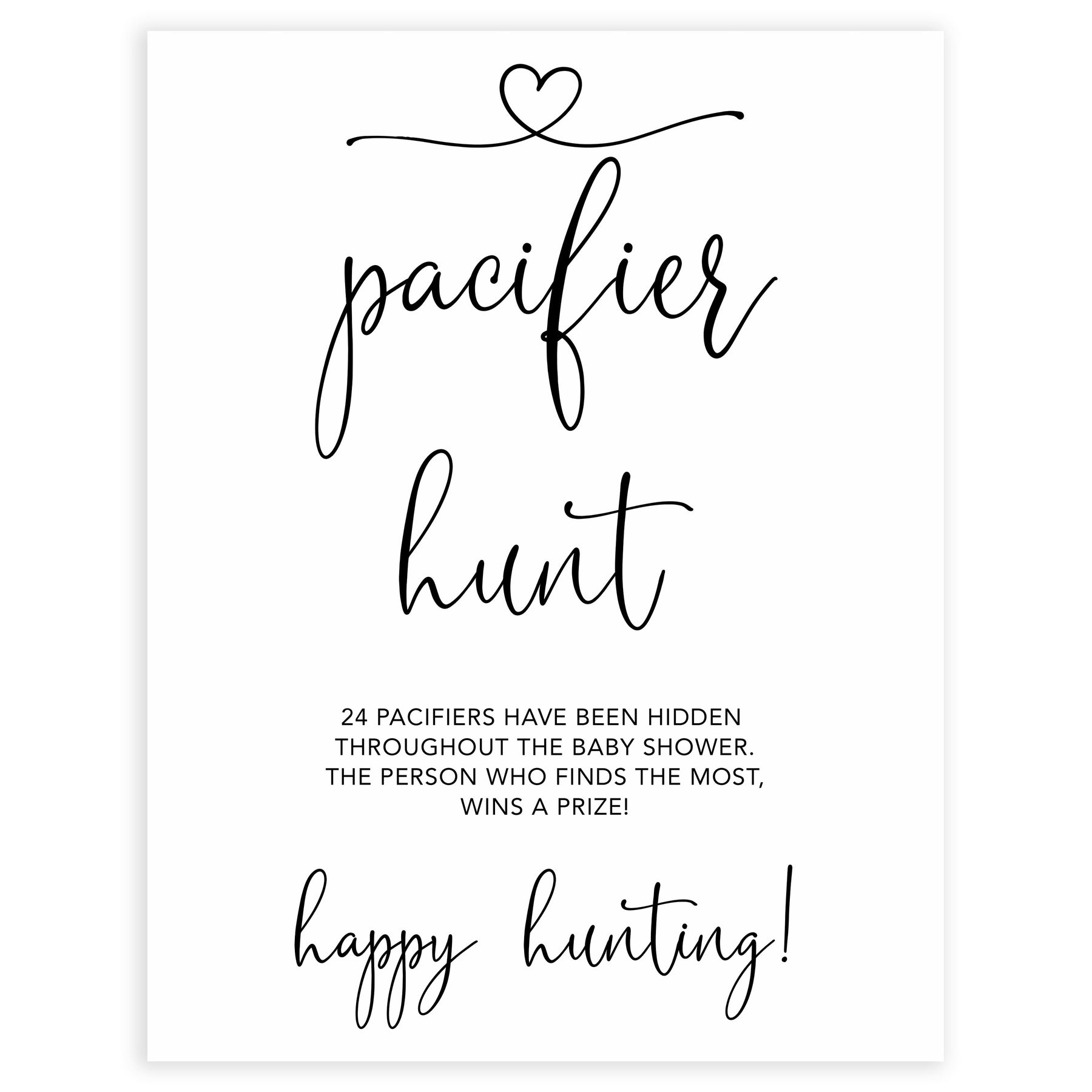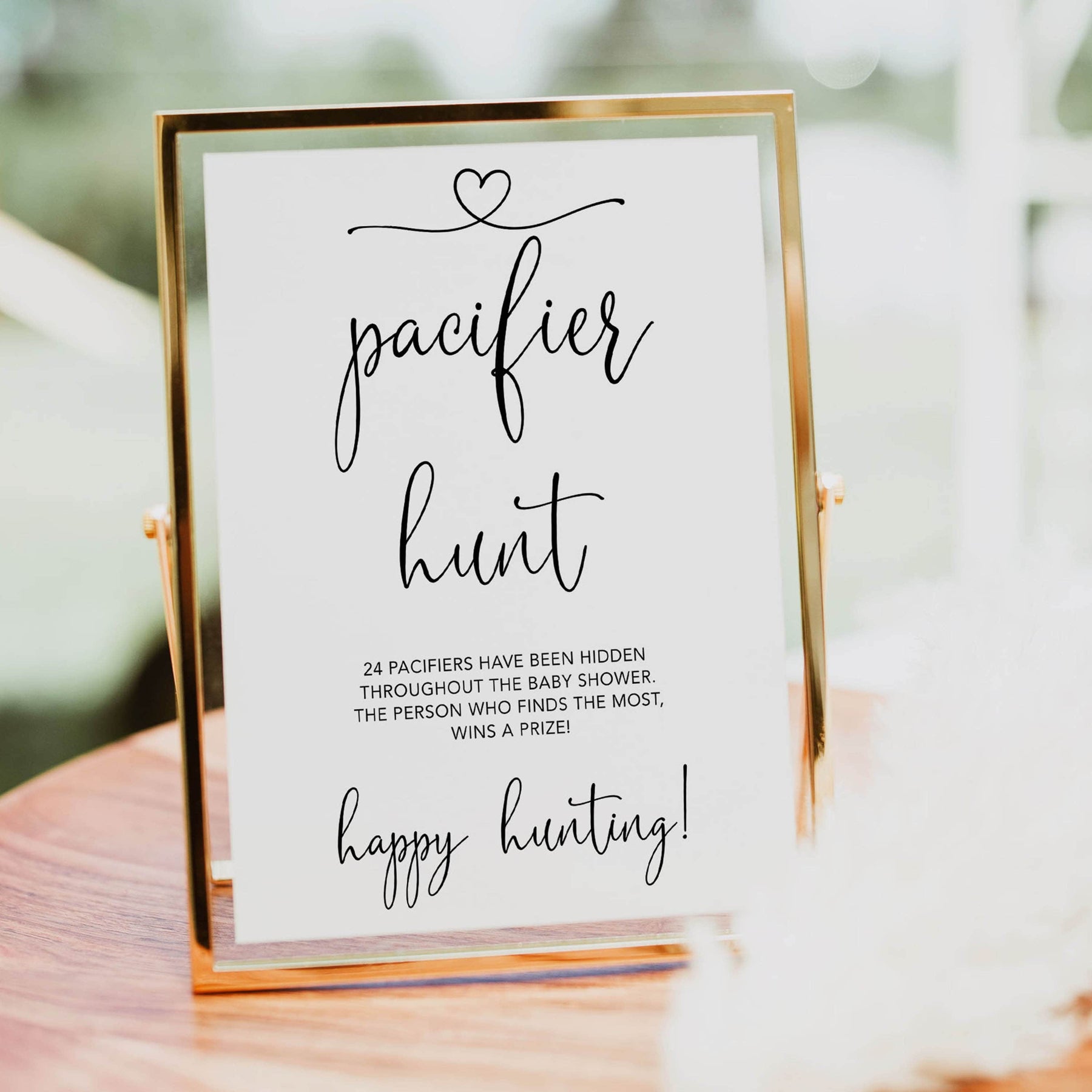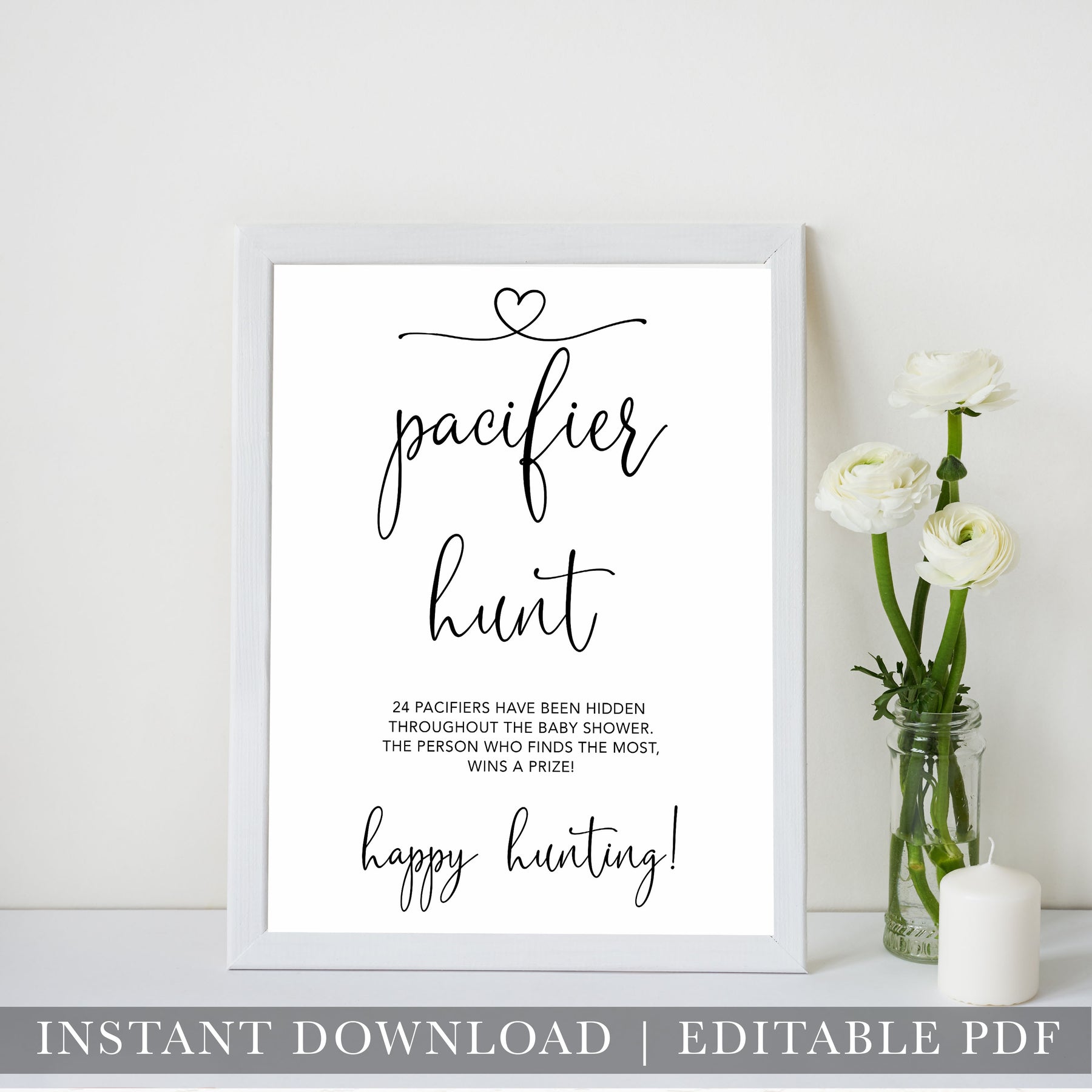 The Pacifier Hunt is a great baby shower game that gets everyone out of their seat and having fun. A twist on the traditional treasure hunt, friends and family have to find the pacifiers that you've hidden around your baby shower party. You can give prizes to winners. Get hunting!