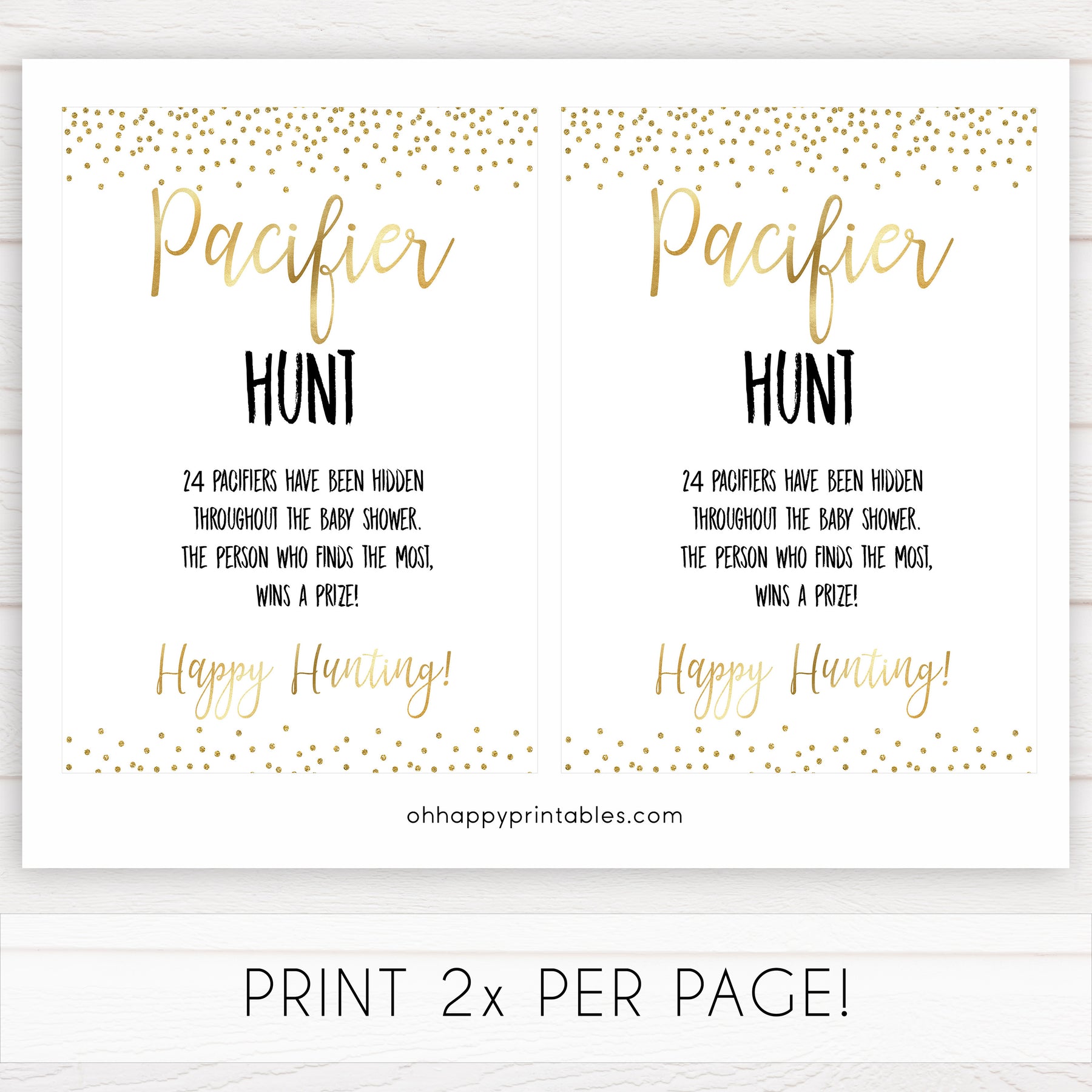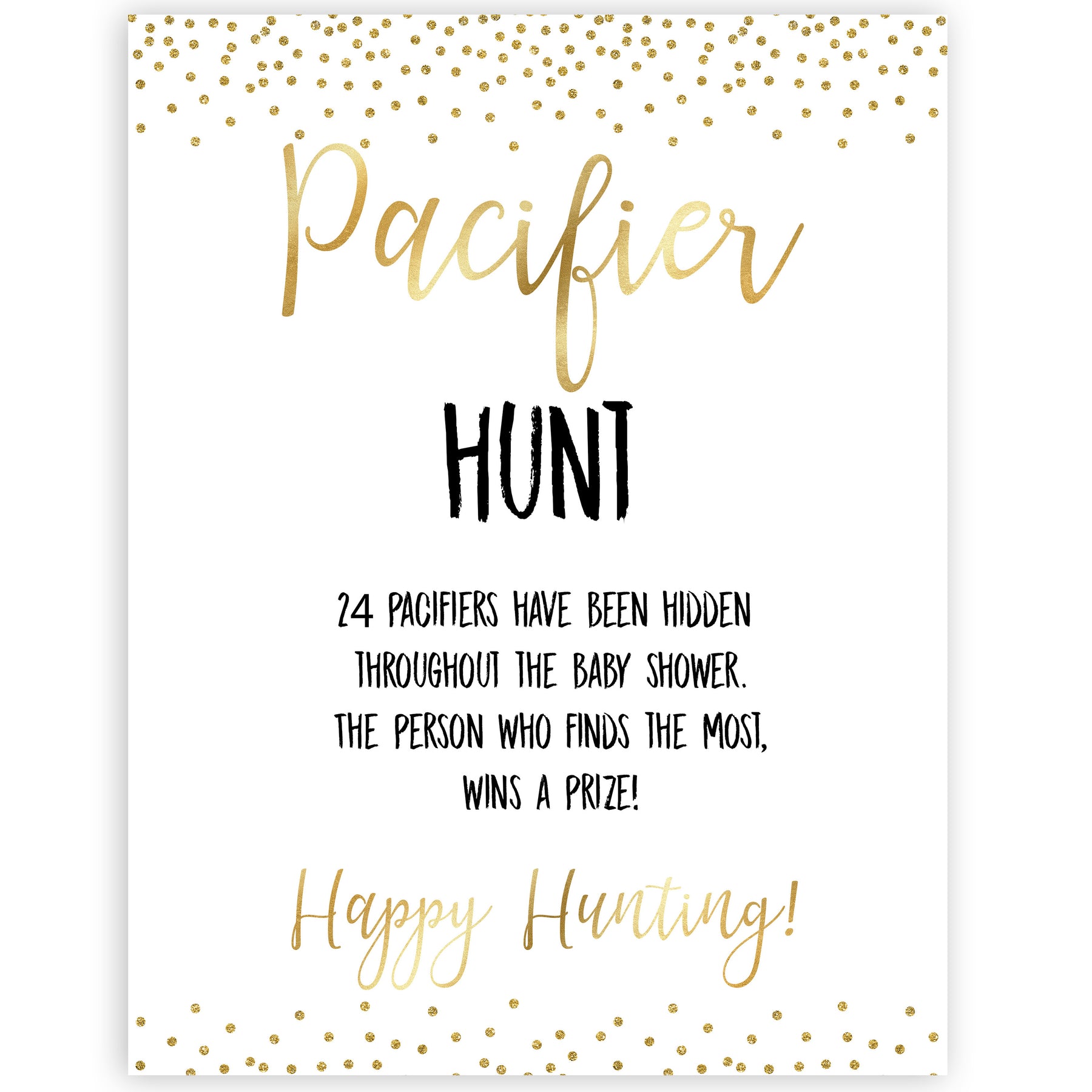 The Pacifier Hunt is a great baby shower game that gets everyone out of their seat and having fun. A twist on the traditional treasure hunt, friends and family have to find the pacifiers that you've hidden around your baby shower party. You can give prizes to winners. Get hunting!