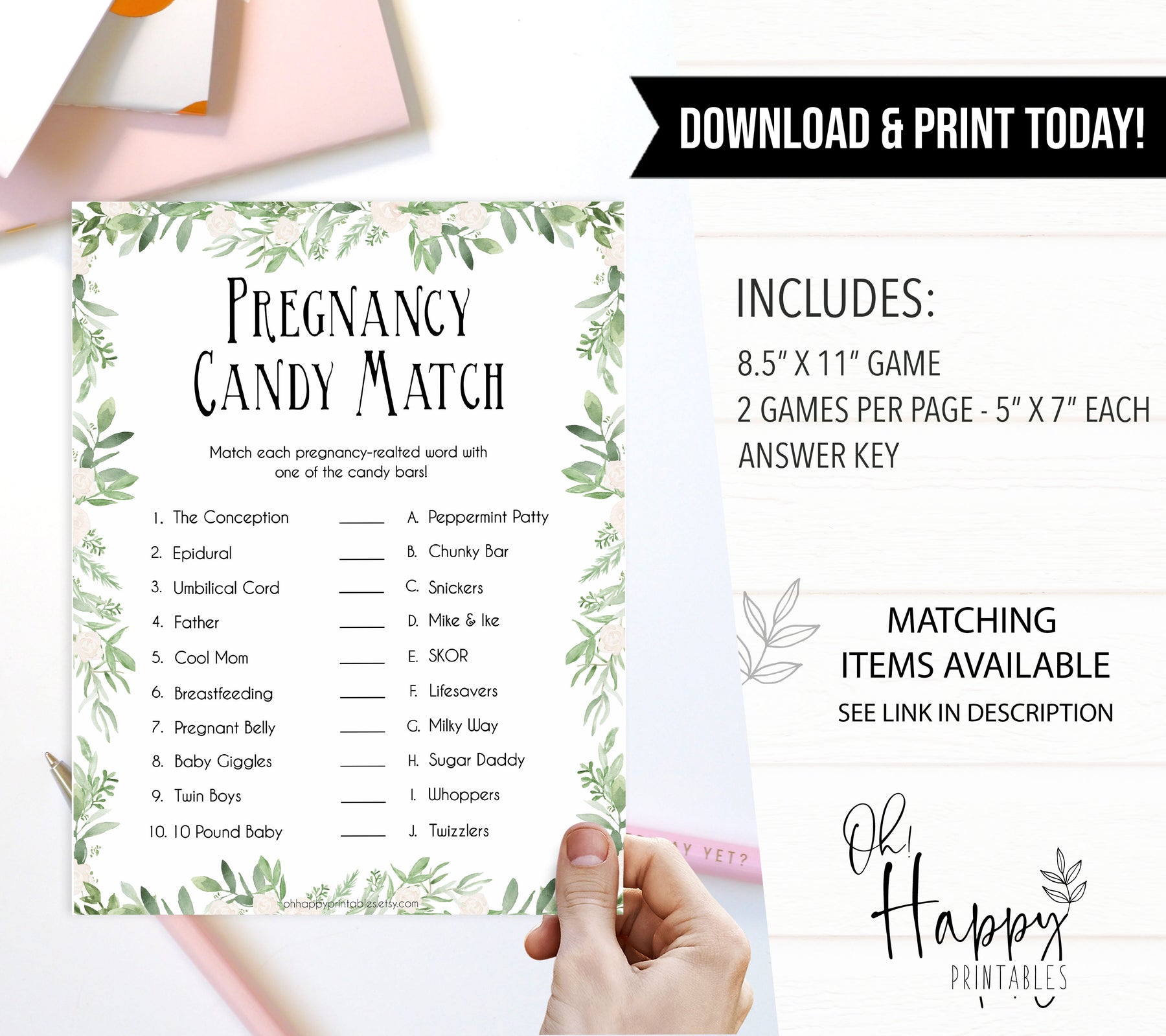 Pregnancy Candy Match Game, Greenery Baby Shower Games, Botanical Candy Match Baby Game, Fun Baby Shower Games, Pregnancy Candy Match, fun baby shower games, printable baby shower games
