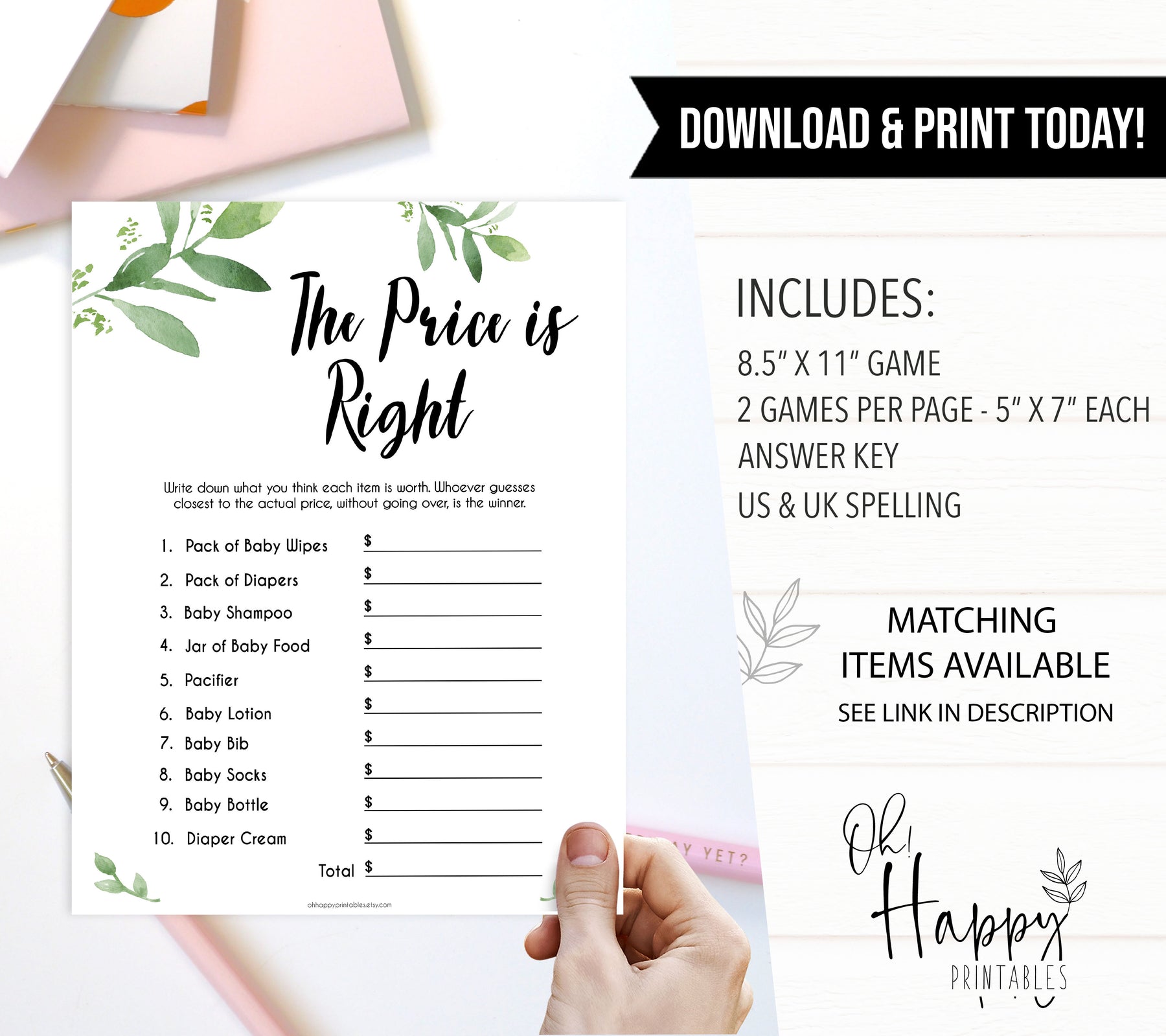 Botanical Price Is Right Baby Shower Game, Gold Guess The Price Games, Eucalyptus Baby Shower Price Games, Green Price Is Right Game