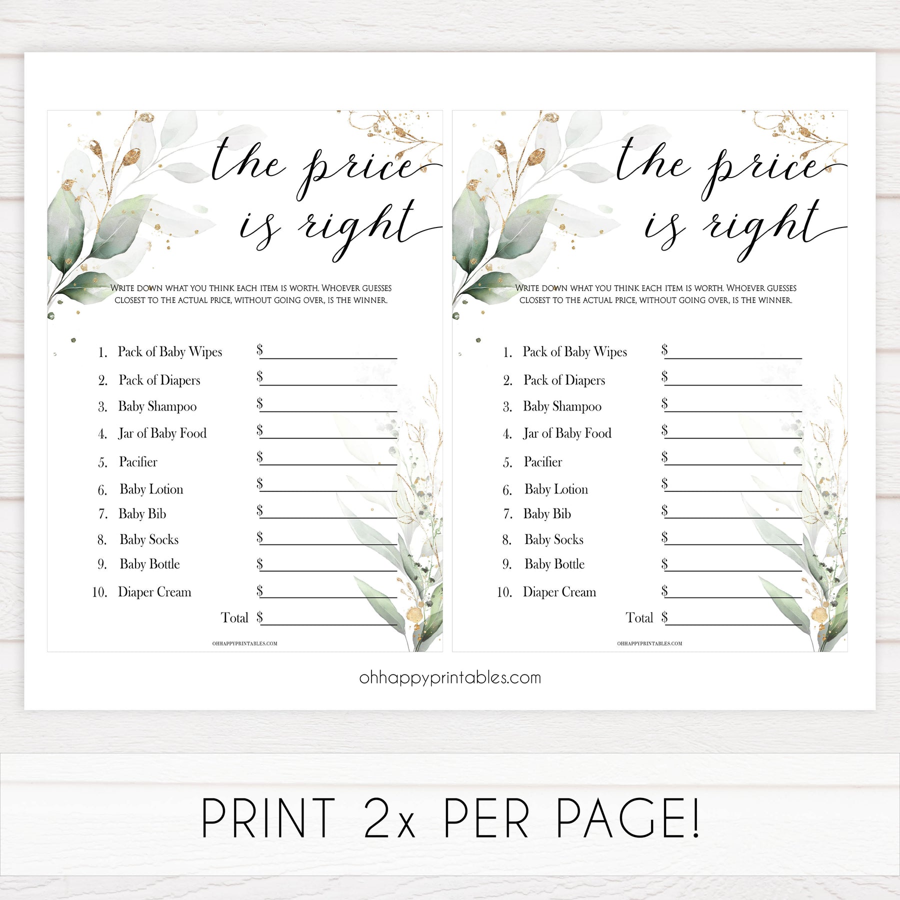 This Baby Shower Price is Right game contains 10 must have baby items. All the guests have to guess what the cost of each item was. The hostess purchases the items prior to the Baby Shower, keeping the receipt. With the products on display, guests fill out their cards and overall total. When everyone is finished, the hostess reveals the individual costs and total from the receipt. The one with the closest answer wins.
