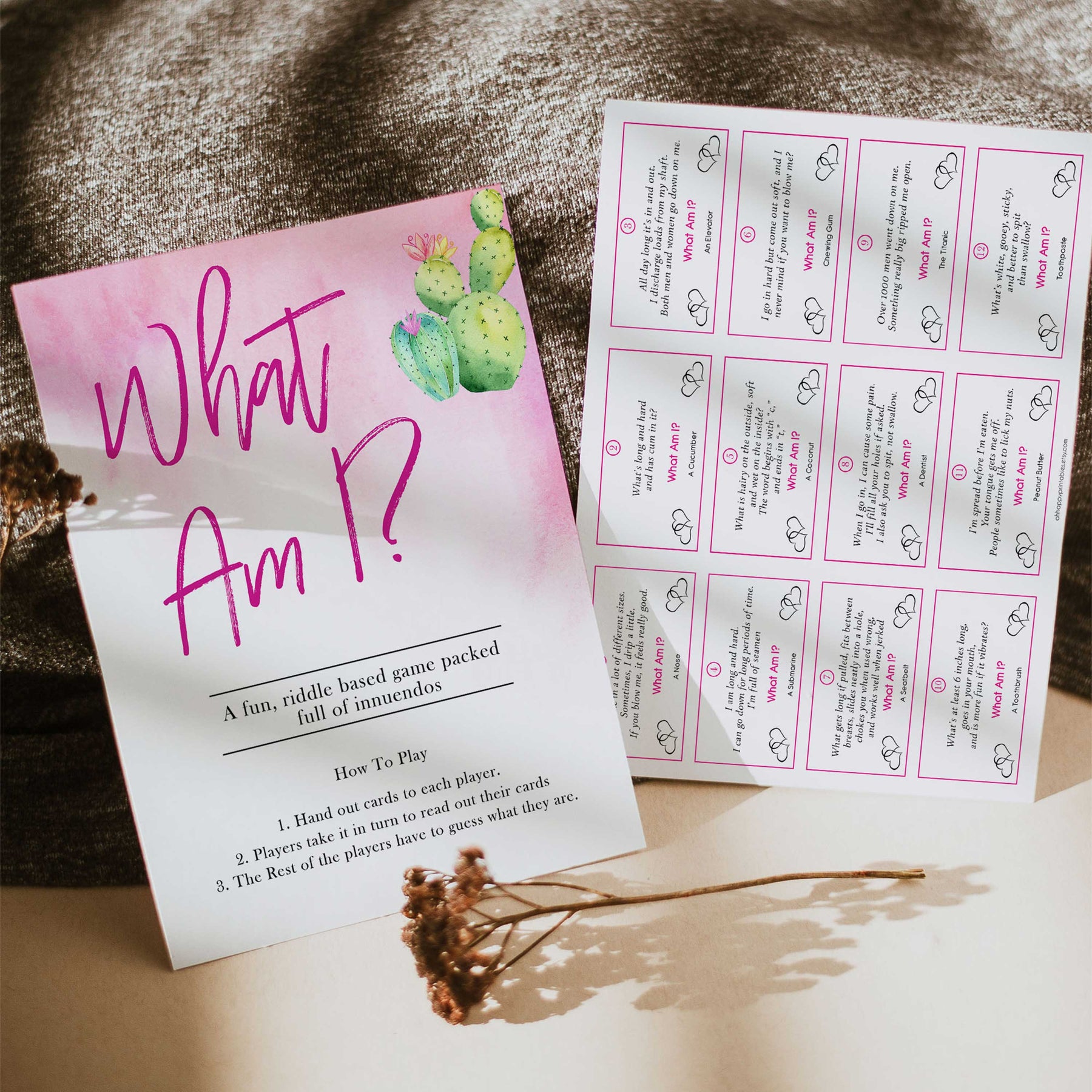 3 files to print including the 2 pages of 12 innuendo riddles, 24 in total, and 1 rules page.