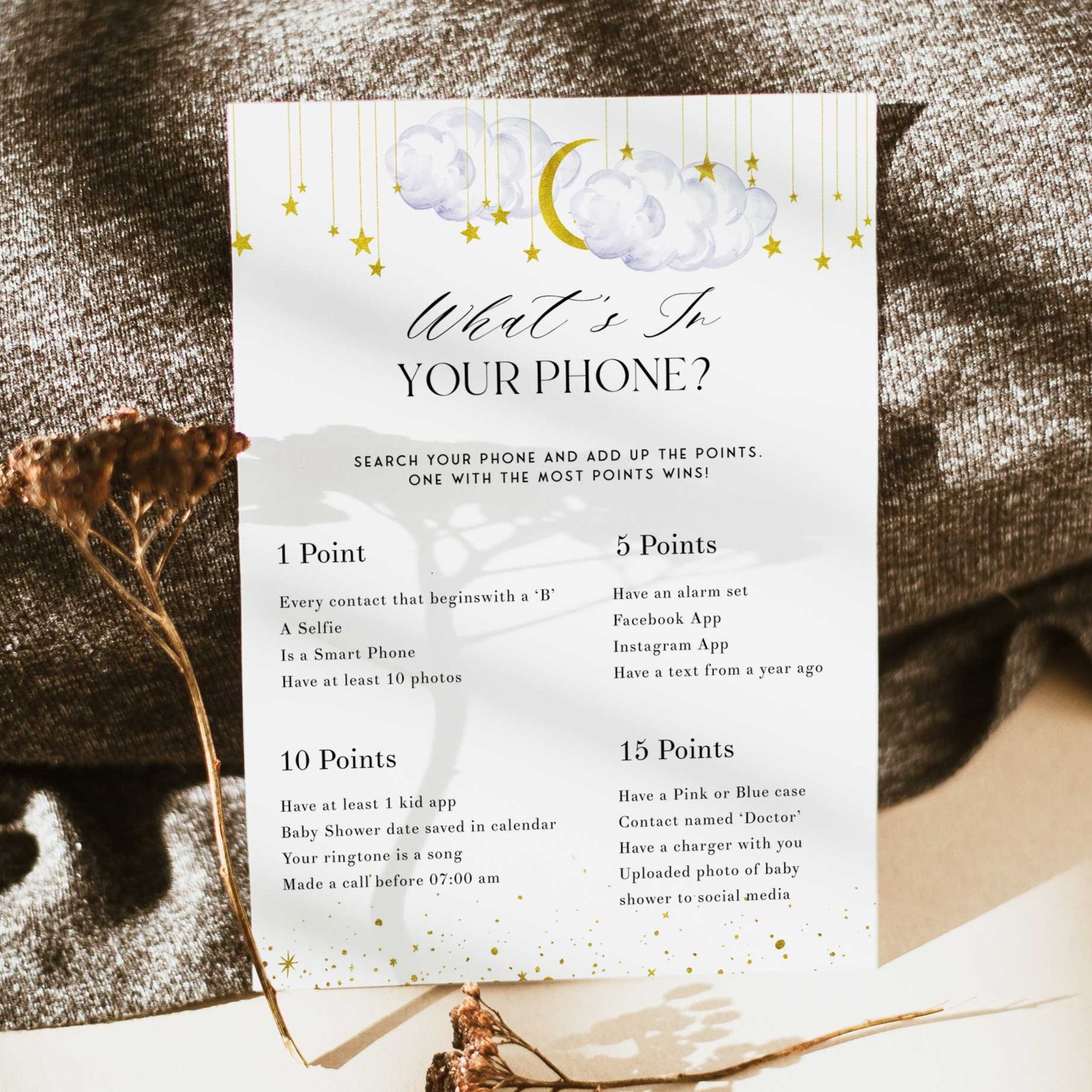 Fully editable and printable baby shower what's in the phone game with a little star design. Perfect for a Twinkle Little Star baby shower themed party