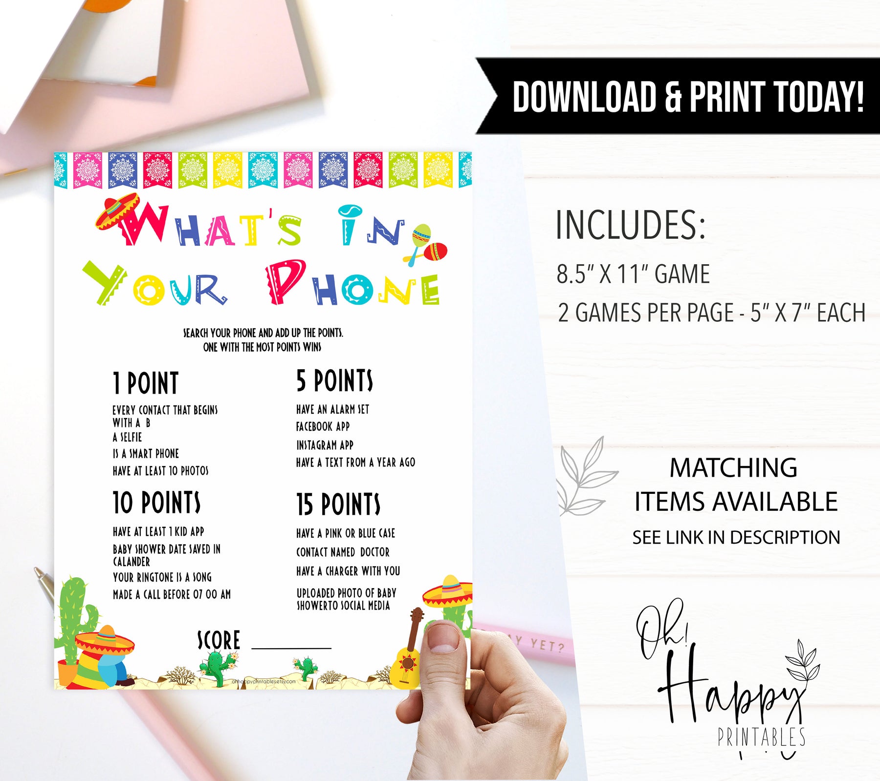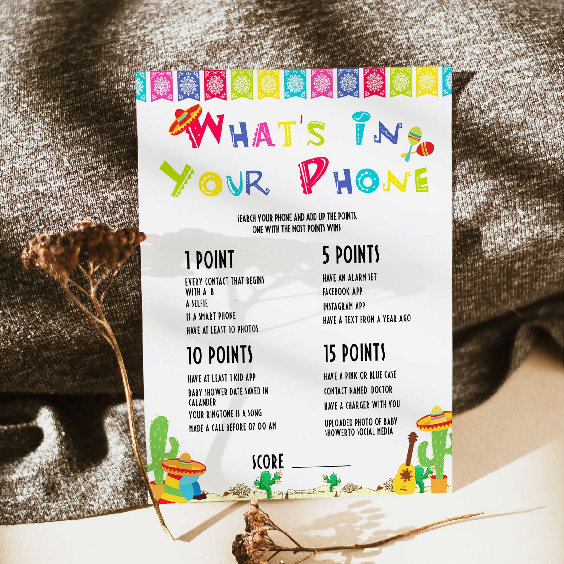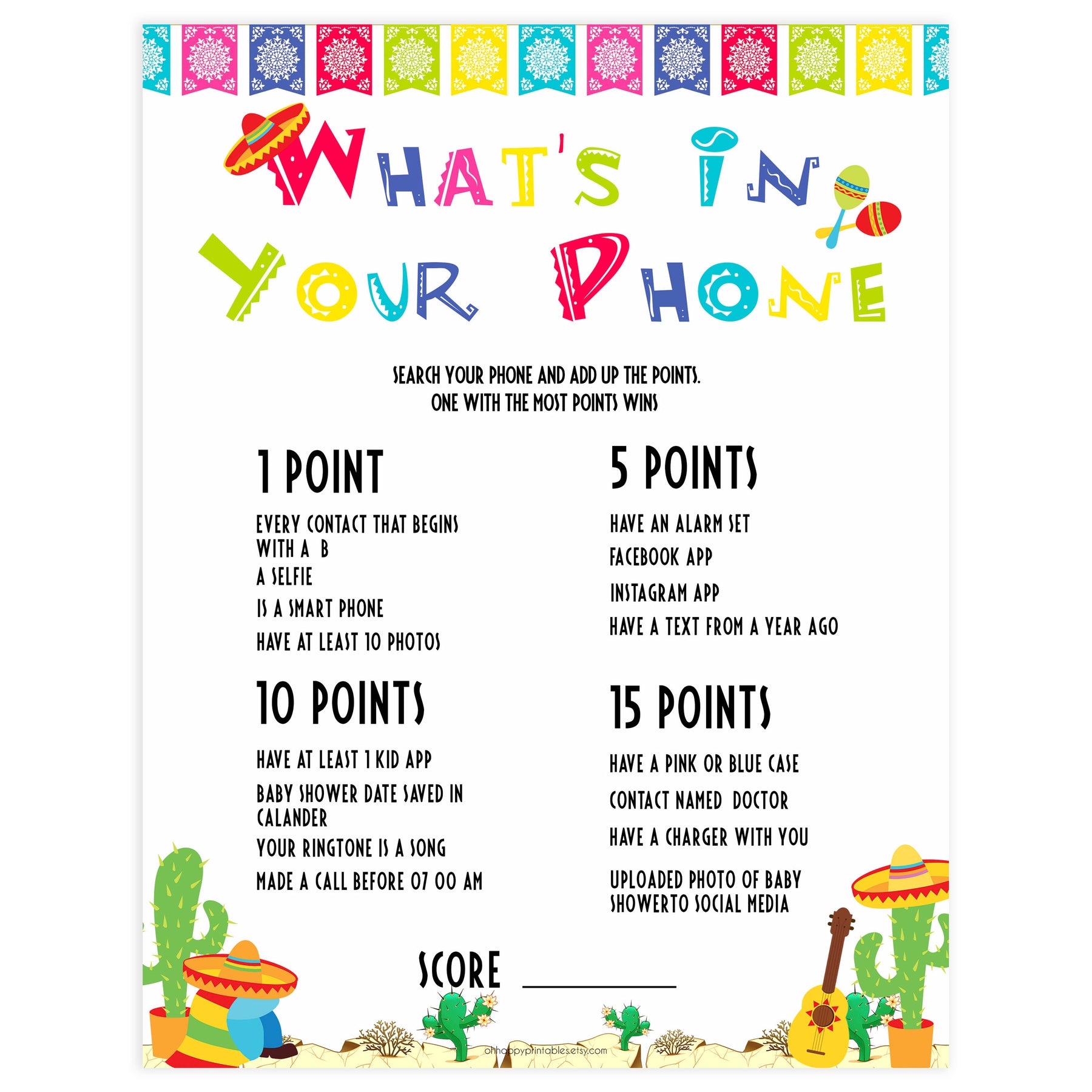 This is a fun game to play with your friends. Each friend will search their phones and get points for the items that they have. Whoever has the most points wins! Simply download and print at home!