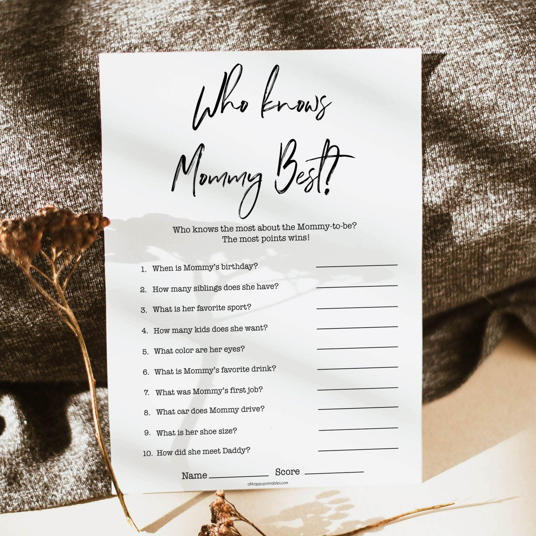 White Gender Neutral Who Knows Mommy Best Quiz, Baby Shower Games, Knows Mummy Games, Neutral Baby Shower Games, Fun Baby Shower Games, popular baby games