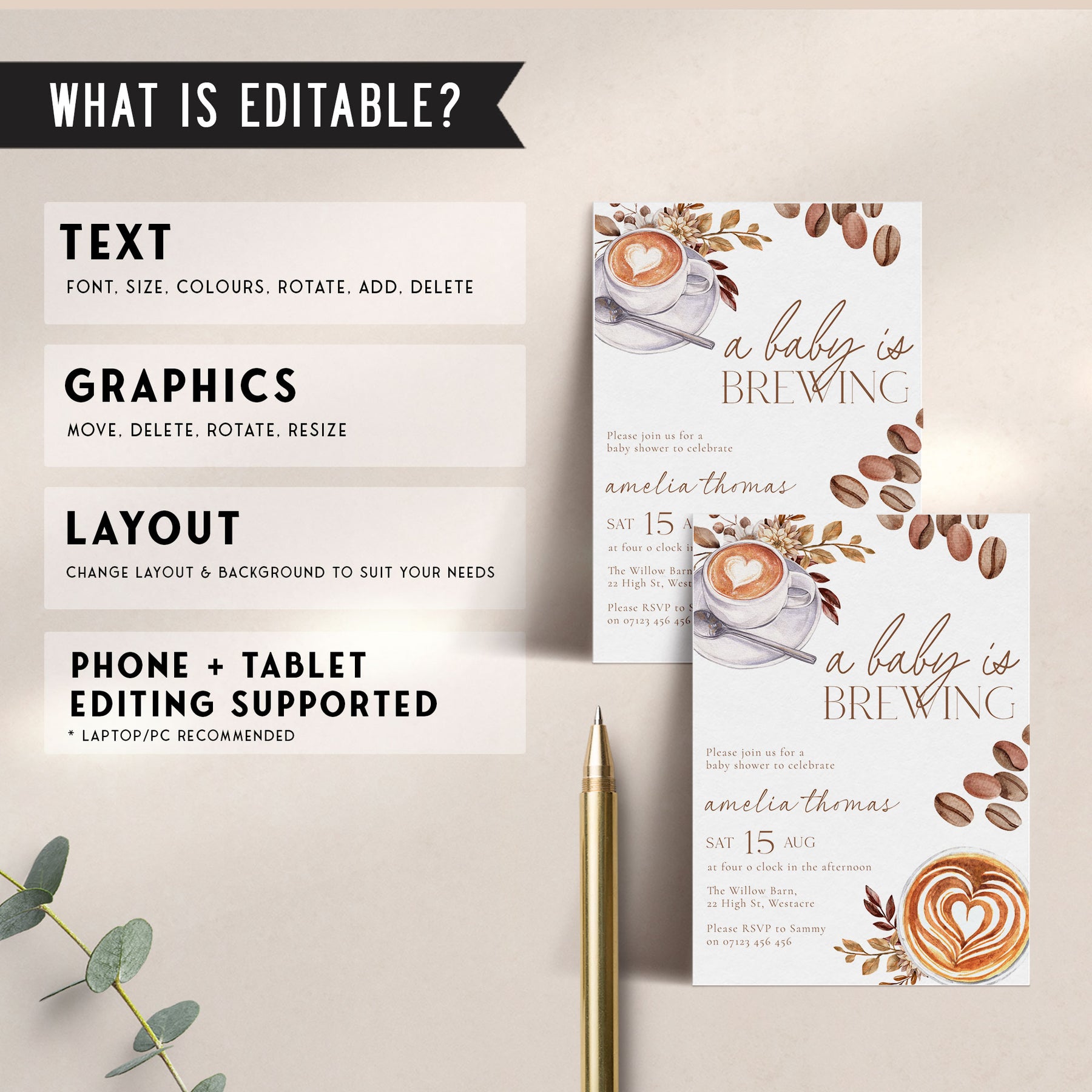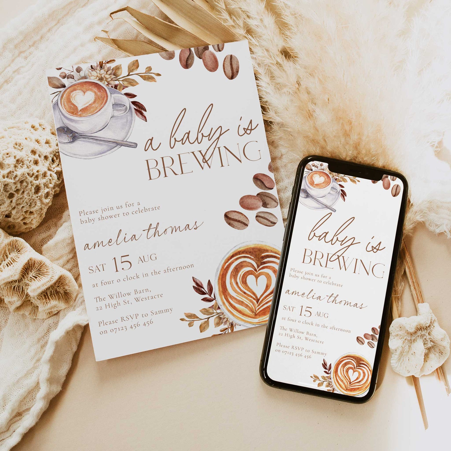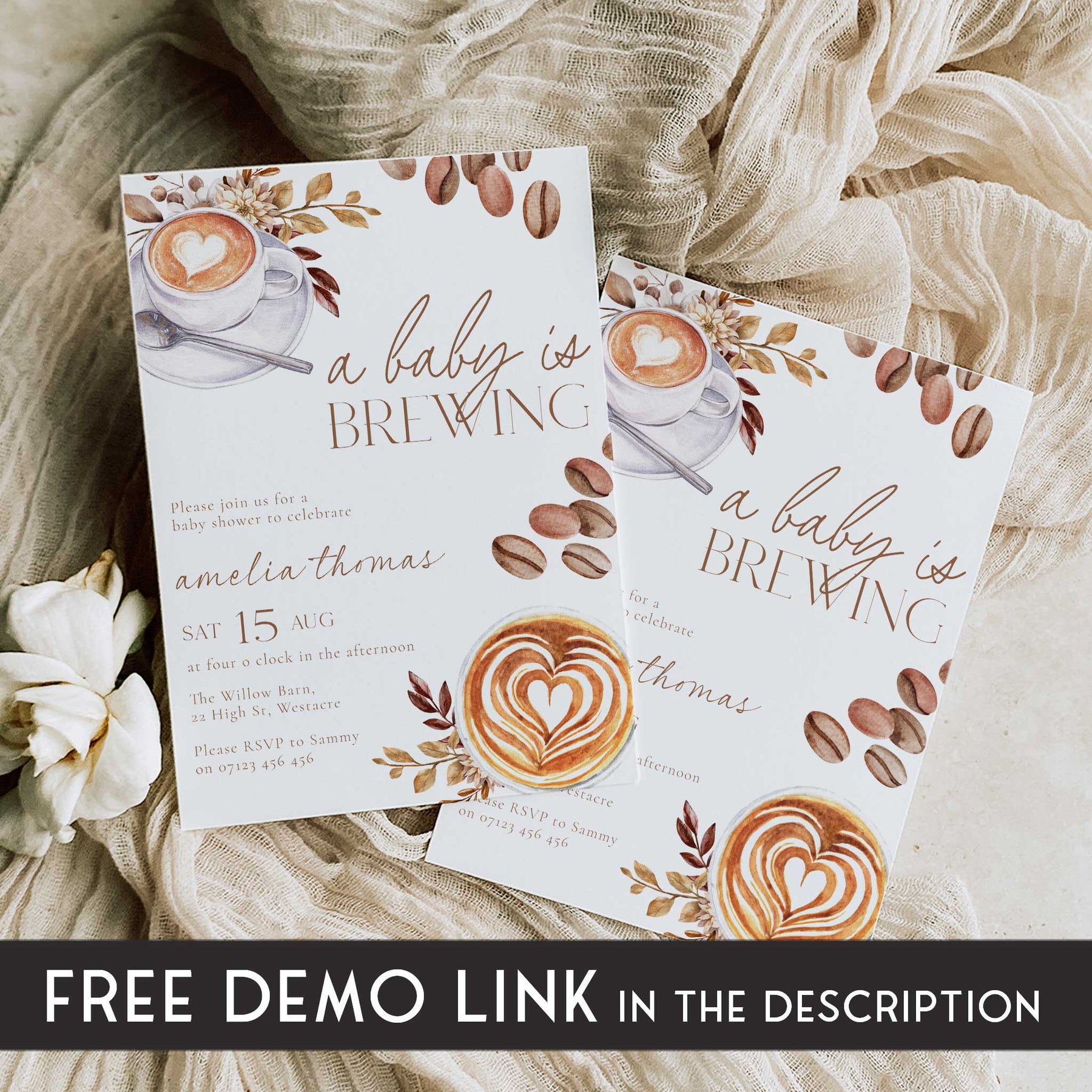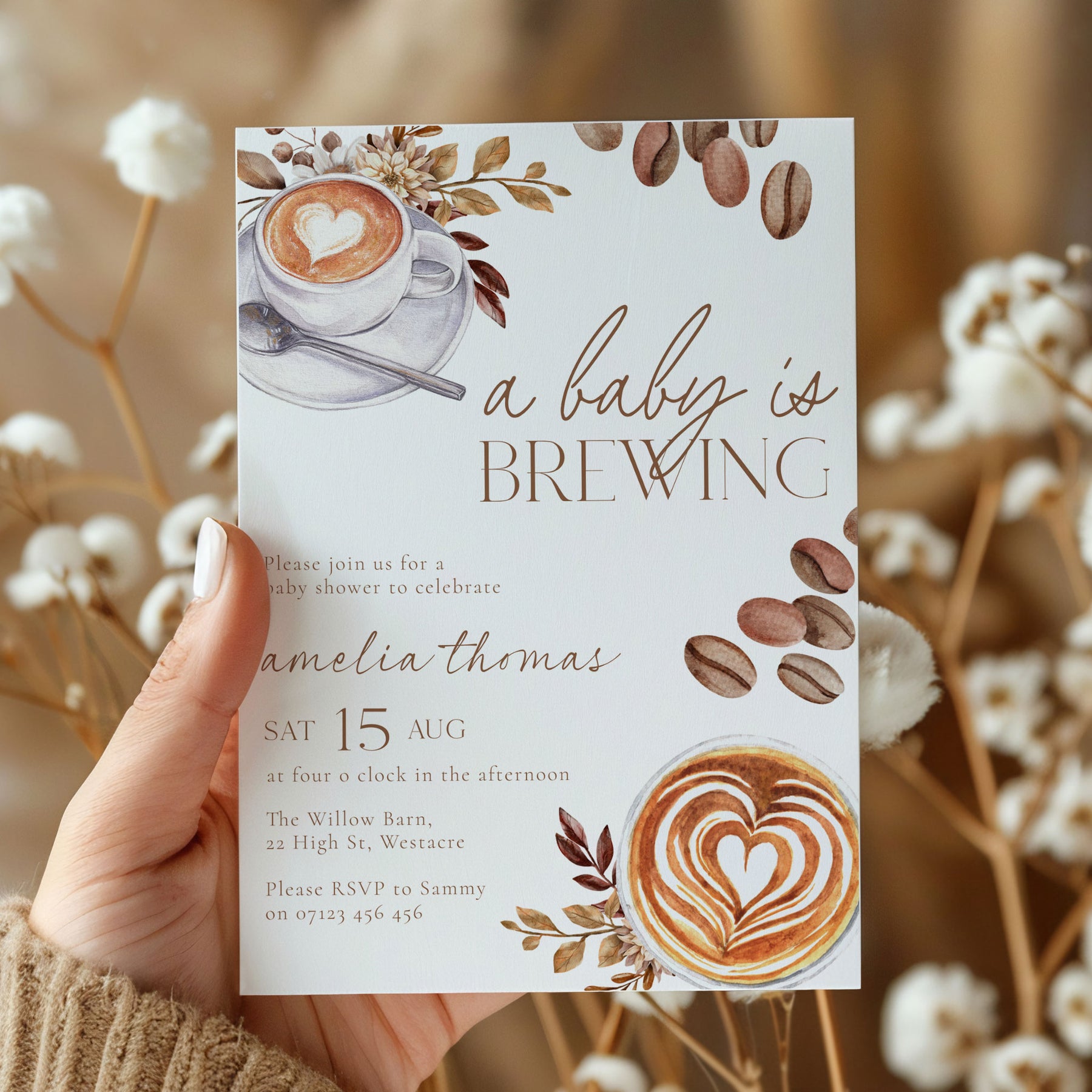 Celebrate the sweetest new arrival with our "A Baby is Brewing" baby shower invitation – a charming, coffee-themed design perfect for modern moms and cozy gatherings! Customise effortlessly and print today, it couldn't be easier.