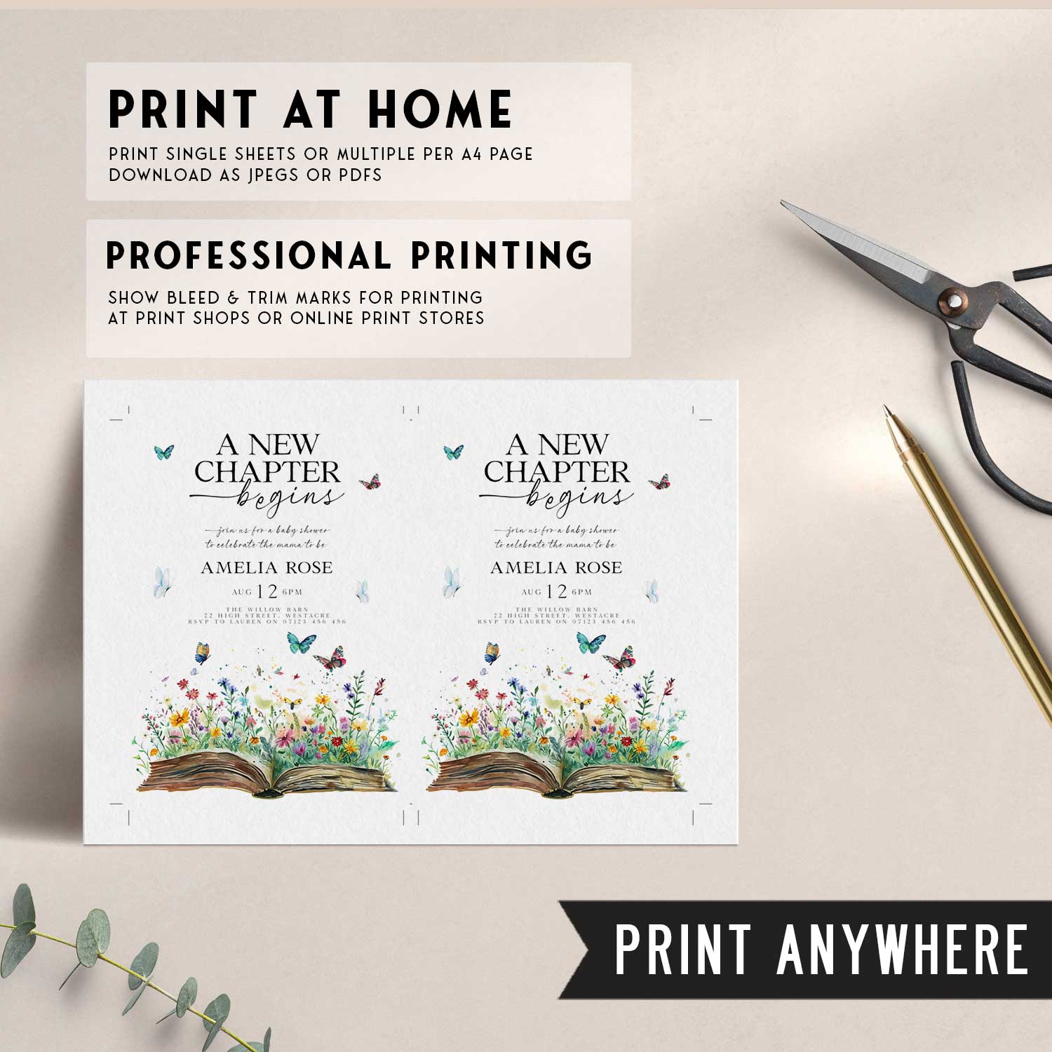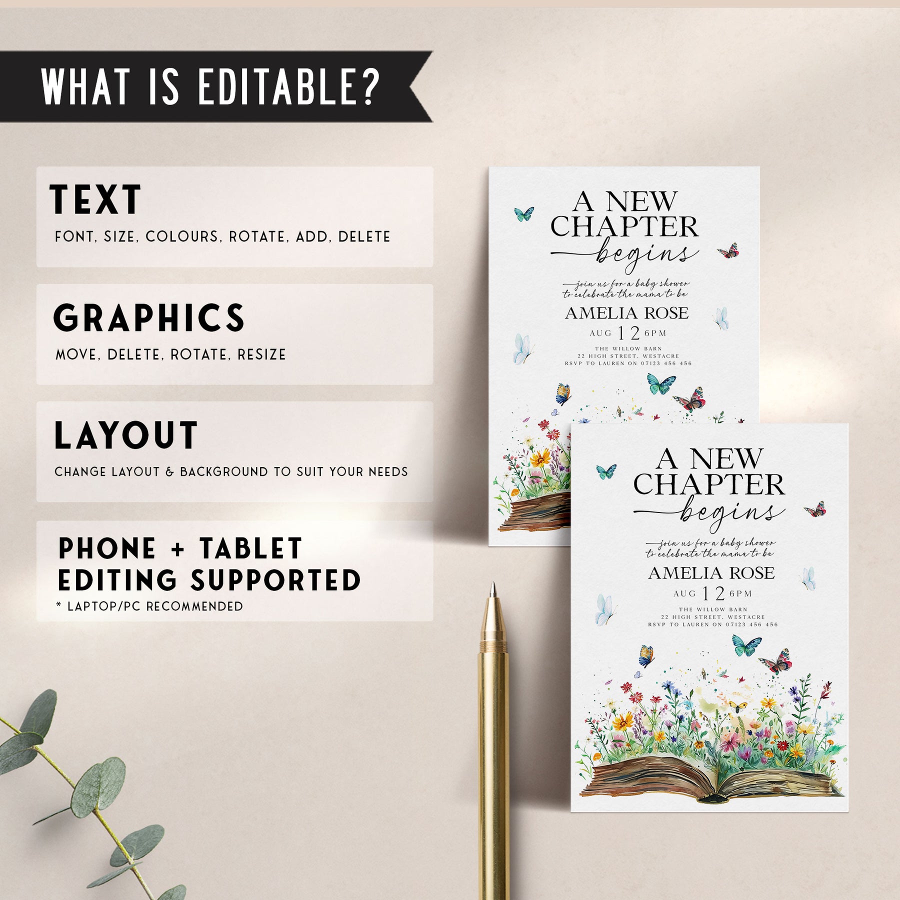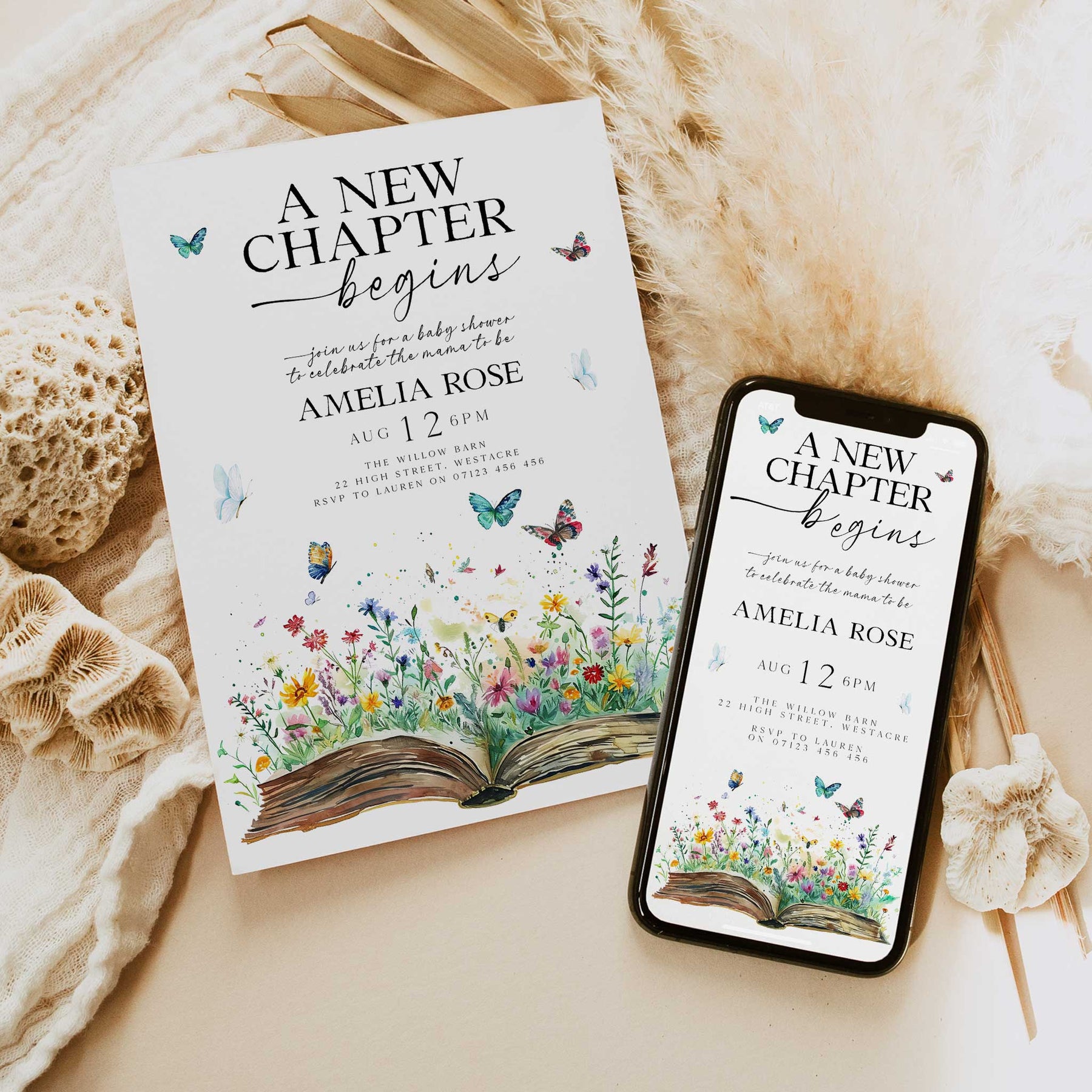 Introducing our 'A New Chapter Begins' editable baby shower invitation set, designed to brighten up your special day with beautiful florals, books and elegant font This set features both 5x7 invitation and a mobile-friendly version, enabling you to effortlessly share the joyful news with friends and family. With its delightful New Chapter Begins theme, this invitation set is the perfect way to celebrate the arrival of your little one and ensure a memorable baby shower.