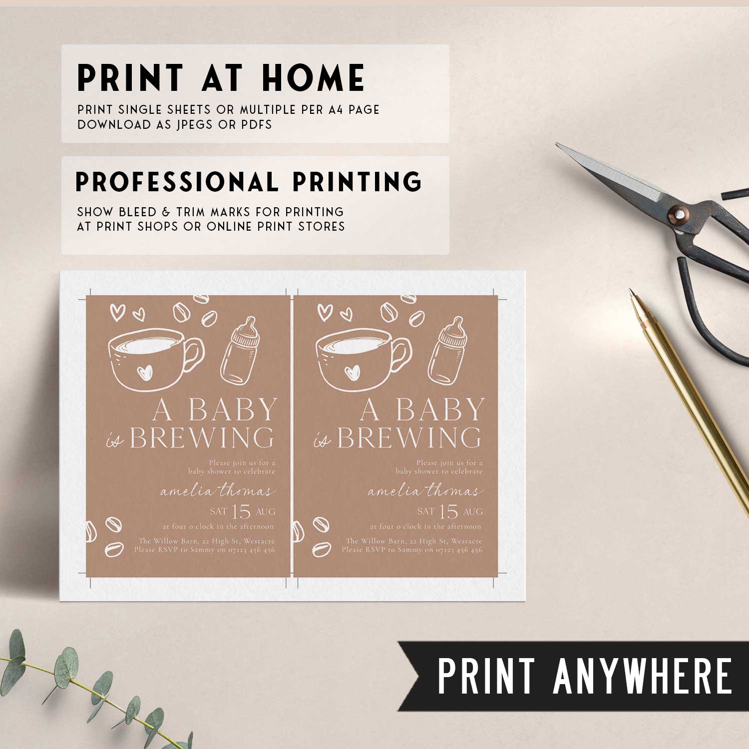 Celebrate the sweetest new arrival with our "A Baby is Brewing" baby shower invitation – a charming, coffee-themed design perfect for modern moms and cozy gatherings! Customise effortlessly and print today, it couldn't be easier.