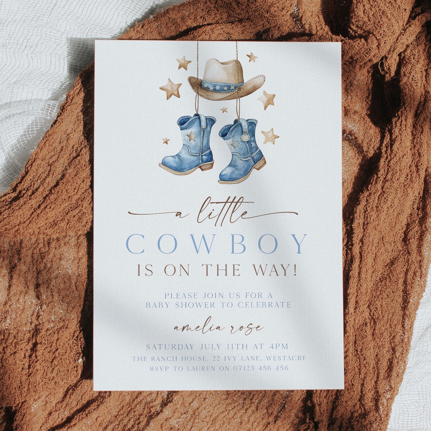 Introducing our 'A Little Cowboy' editable baby shower invitation set, designed to brighten up your special day. This set features both 5x7 invitation and a mobile-friendly version, enabling you to effortlessly share the joyful news with friends and family.
