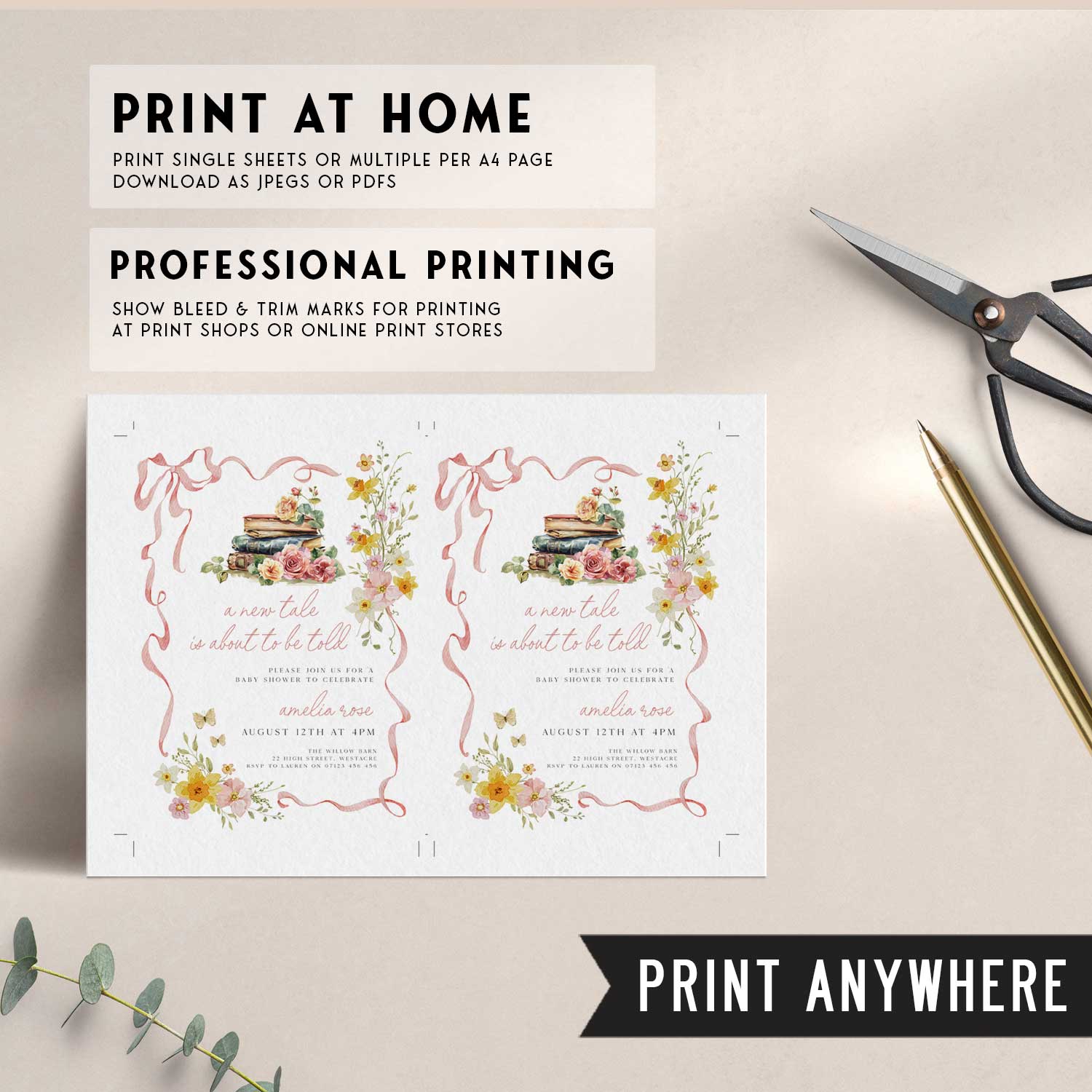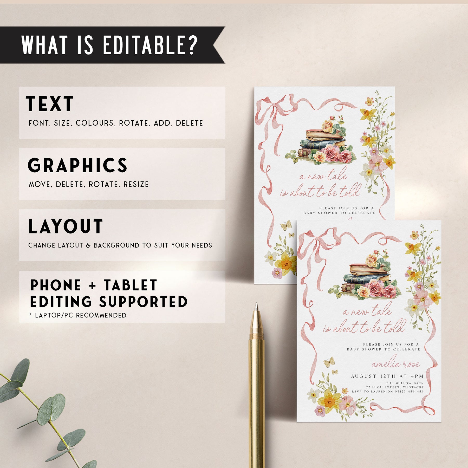 Introducing our 'A New Chapter Begins' editable baby shower invitation set, designed to brighten up your special day with beautiful watercolor style florals, books and elegant font This set features both 5x7 invitation and a mobile-friendly version, enabling you to effortlessly share the joyful news with friends and family. With its delightful New Chapter Begins theme, this invitation set is the perfect way to celebrate the arrival of your little one and ensure a memorable baby shower.