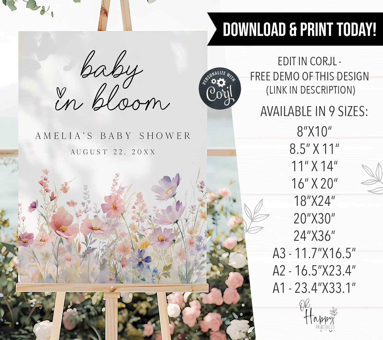 Introducing our editable Baby In Bloom Baby Shower Welcome Sign. This is the perfect addition to your little girl baby shower. This fully editable sign can be customised to fit your unique style and preferences, allowing you to add your own text, change the font, and layout.