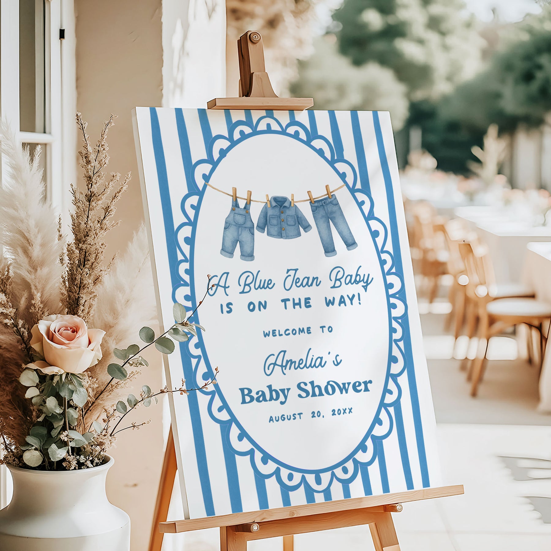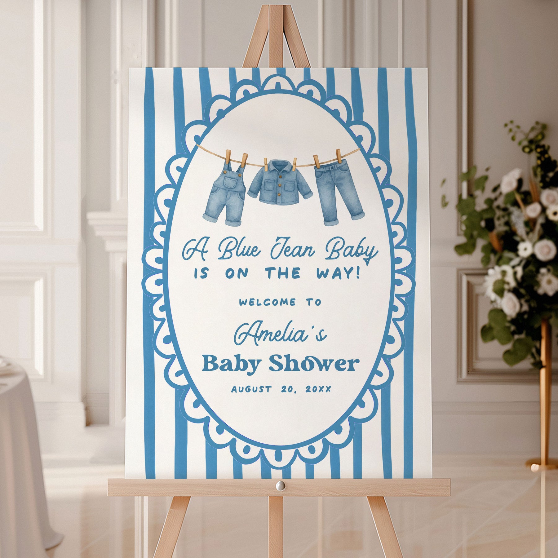 Introducing our editable Blue Jean Baby Baby Shower Welcome Sign editable template. This is the perfect addition to your denim themed baby shower. This fully editable sign can be customised to fit your unique style and preferences, allowing you to add your own text, change the font, and layout.
