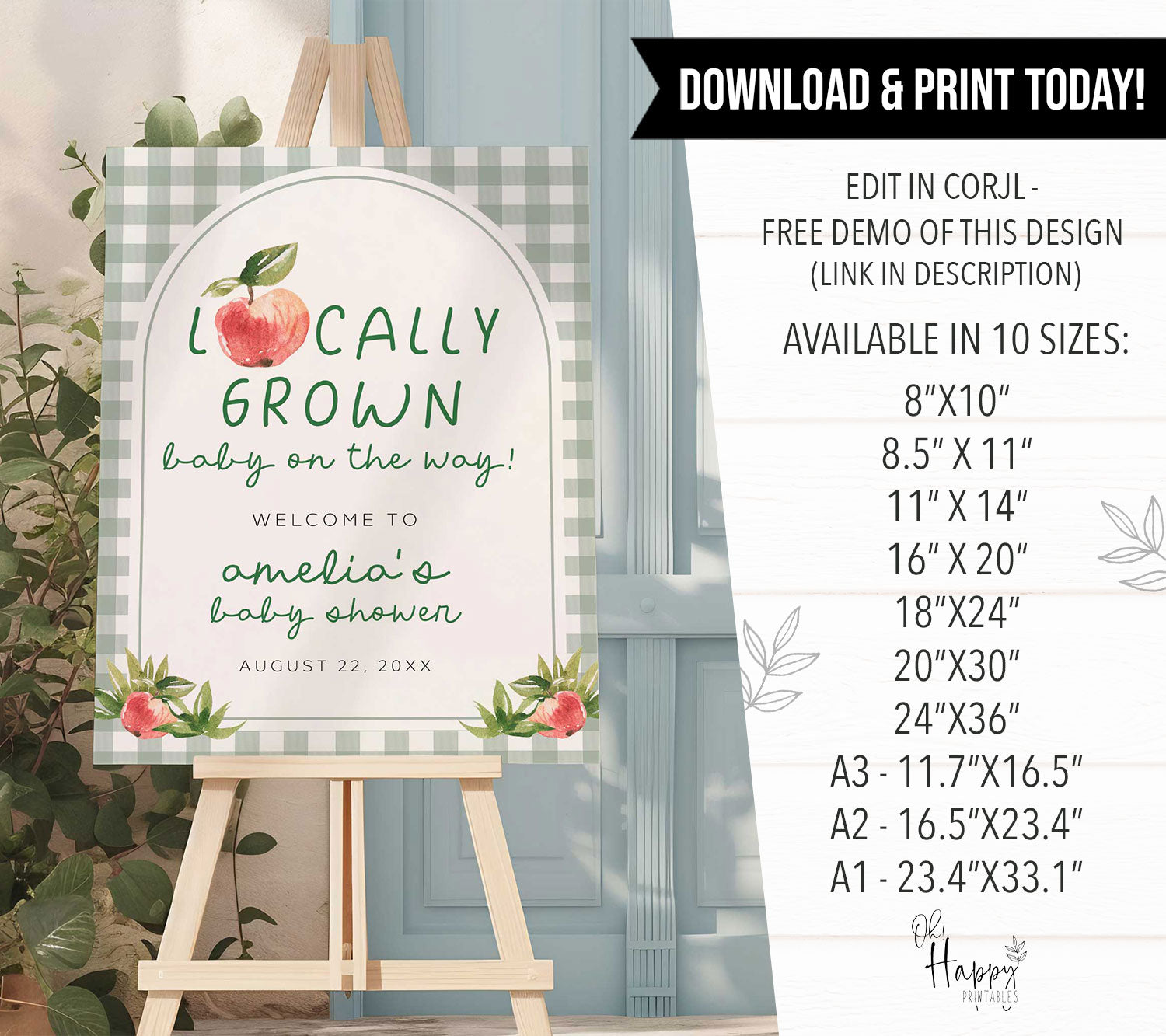 Introducing our editable Locally Grown Baby Shower welcome sign template. This is the perfect addition to your baby shower This editable sign can be customised to fit your unique style and preferences, allowing you to add your own text, change the font, and layout.