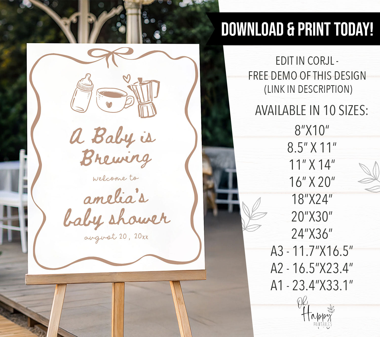 Introducing our editable A Baby Is Brewing Baby Shower Welcome Sign editable template. This is the perfect addition to your little ones baby shower. This fully editable sign can be customised to fit your unique style and preferences, allowing you to add your own text, change the font, and layout.