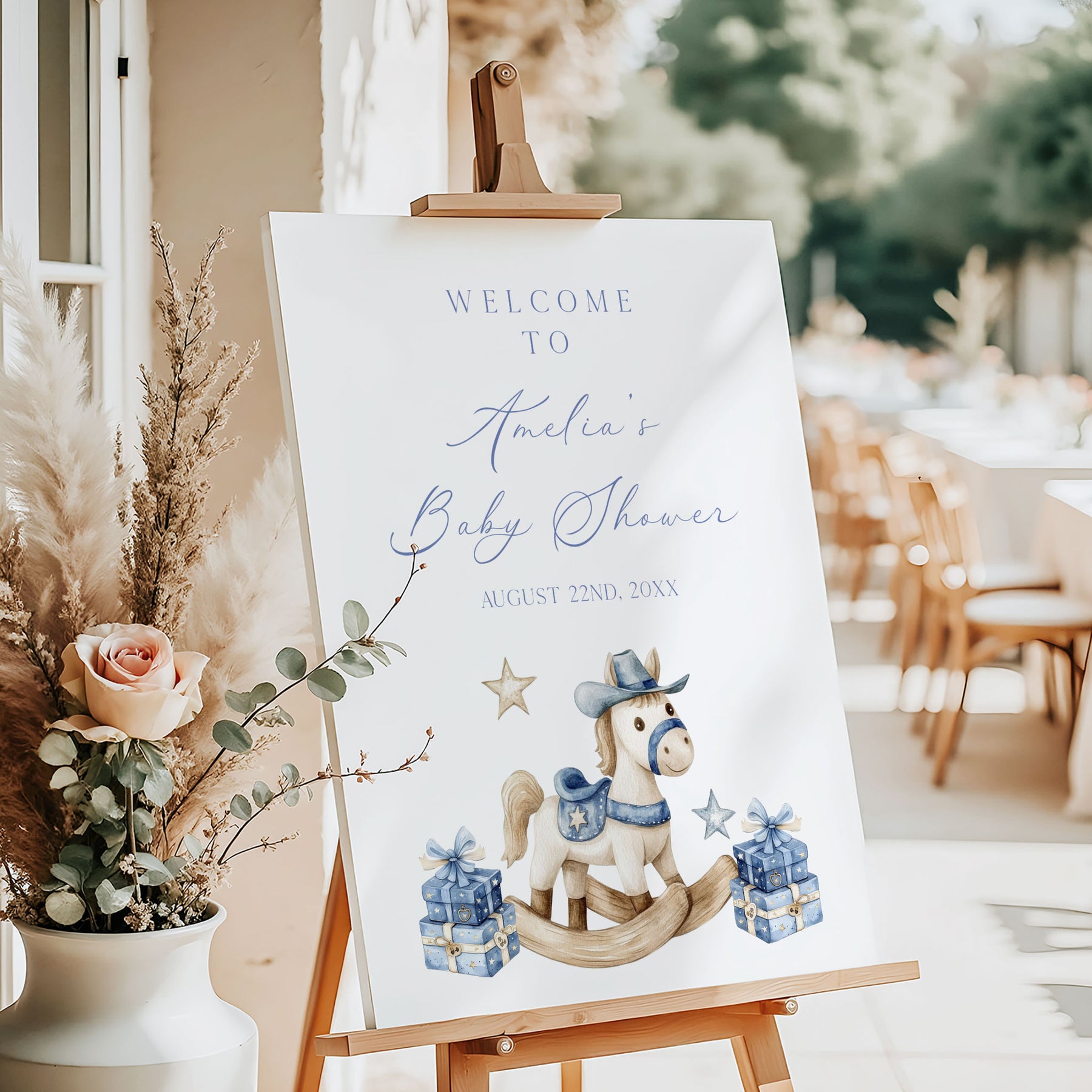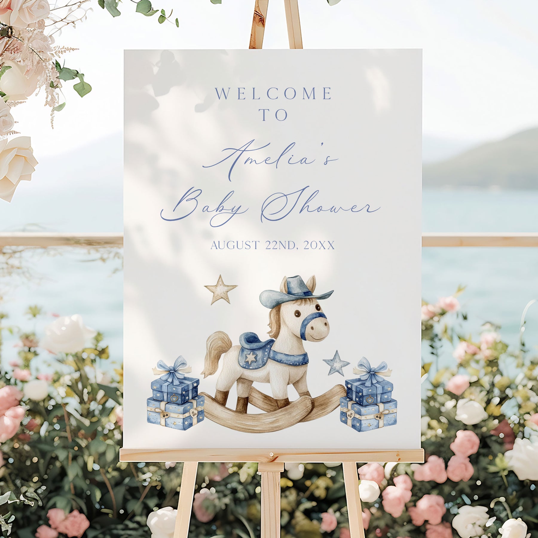 Introducing our editable Little Cowboy Baby Shower welcome sign template. This is the perfect addition to your baby shower This editable sign can be customised to fit your unique style and preferences, allowing you to add your own text, change the font, and layout.