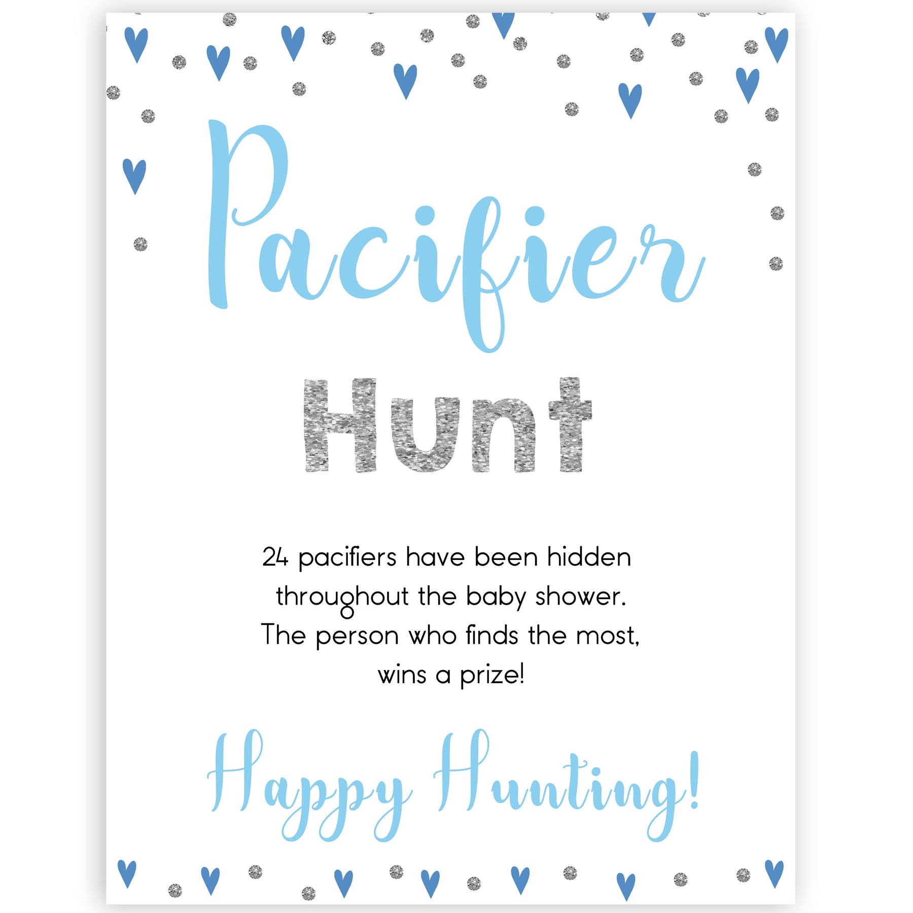 The Pacifier Hunt is a great baby shower game that gets everyone out of their seat and having fun. A twist on the traditional treasure hunt, friends and family have to find the pacifiers that you've hidden around your baby shower party. You can give prizes to winners. Get hunting!