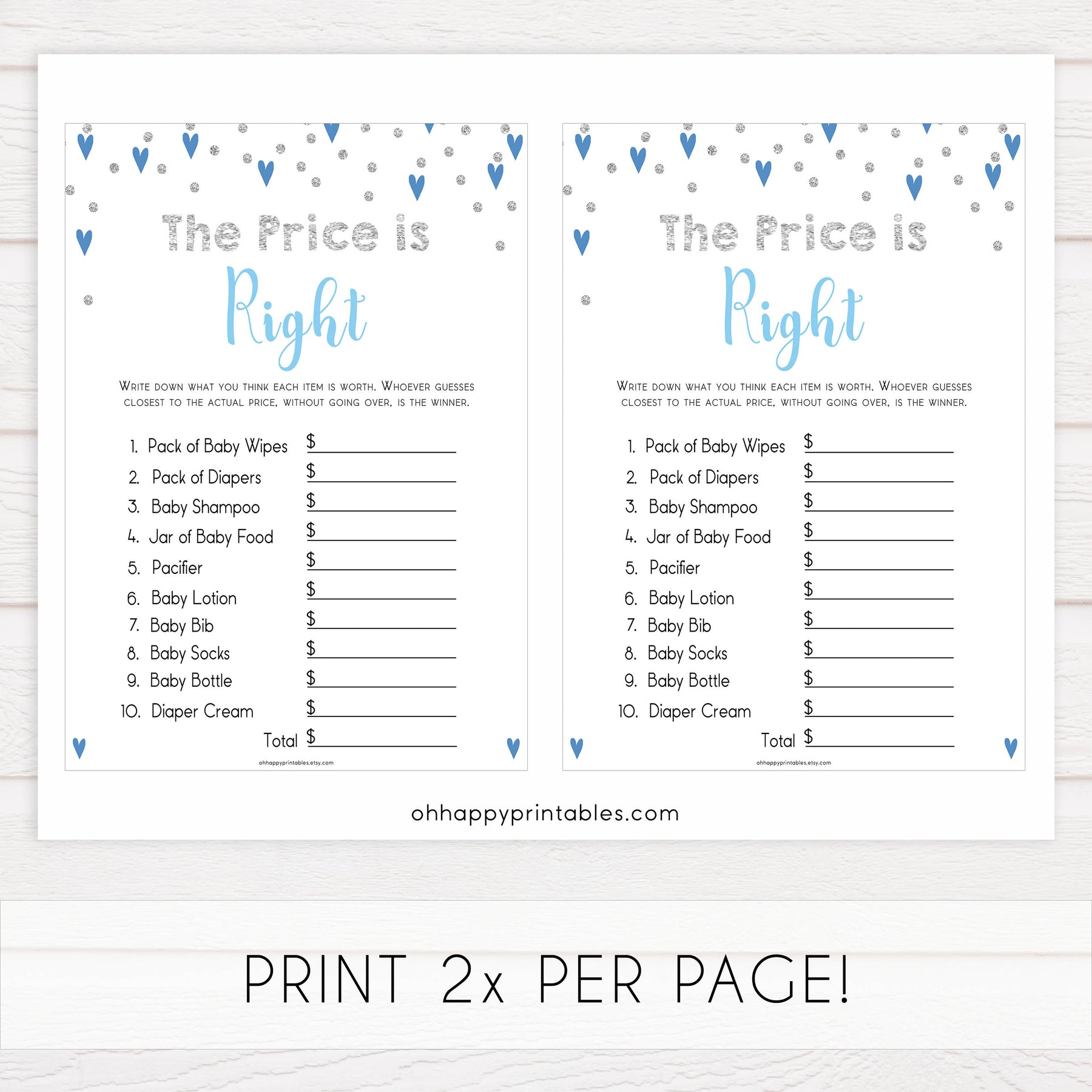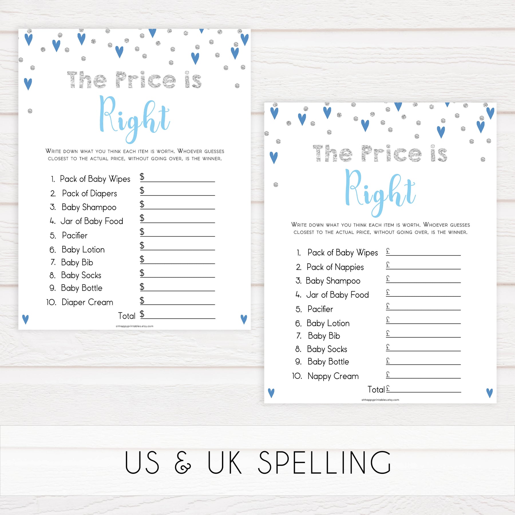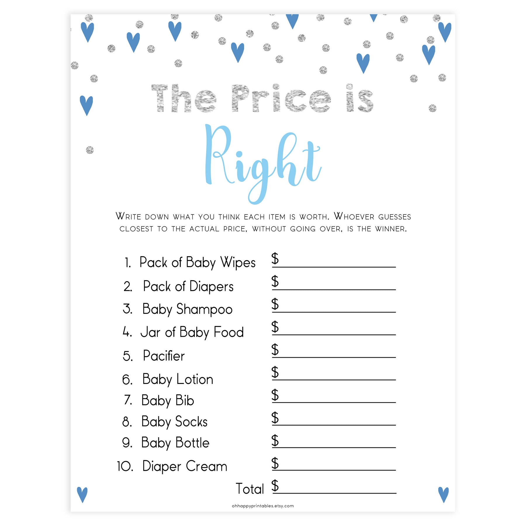 This Baby Shower Price is Right game contains 10 must have baby items. All the guests have to guess what the cost of each item was. The hostess purchases the items prior to the Baby Shower, keeping the receipt. With the products on display, guests fill out their cards and overall total. When everyone is finished, the hostess reveals the individual costs and total from the receipt. The one with the closest answer wins.