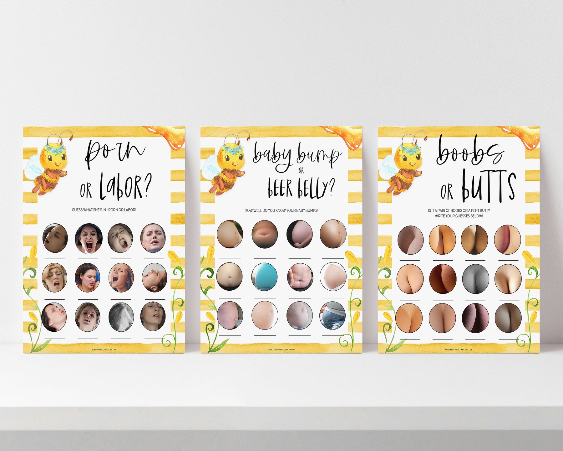 Get three of our most popular baby shower games, Porn or Labor, Baby Bump or Beer Belly, and Boobs or Butts in this amazing triple pack.
