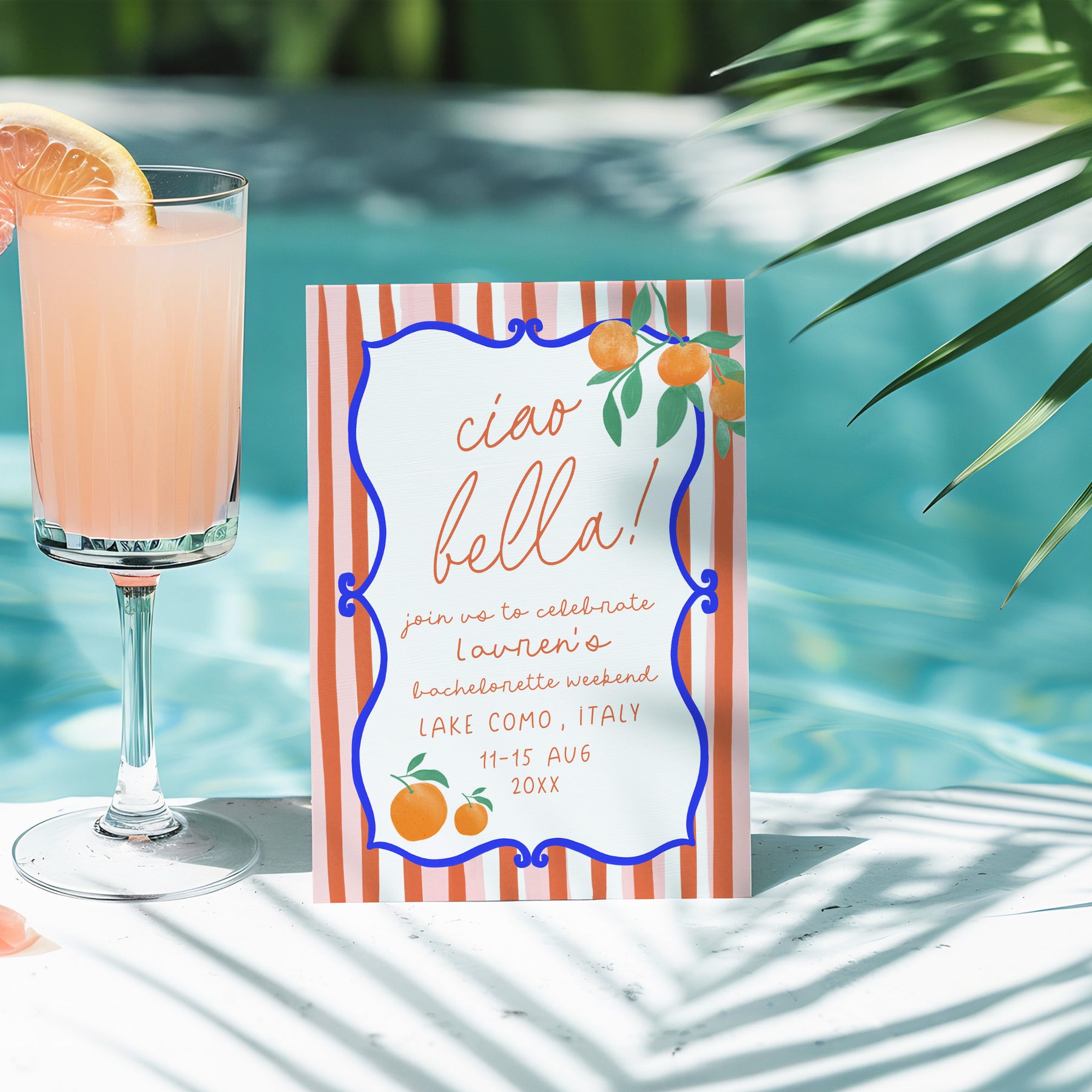 Celebrate your bachelorette party in style with our 'Ciao Bella' bachelorette party invite and itinerary! This editable invitation sets the perfect tone for a your special day. Personalise and send today! It couldn't be easier.