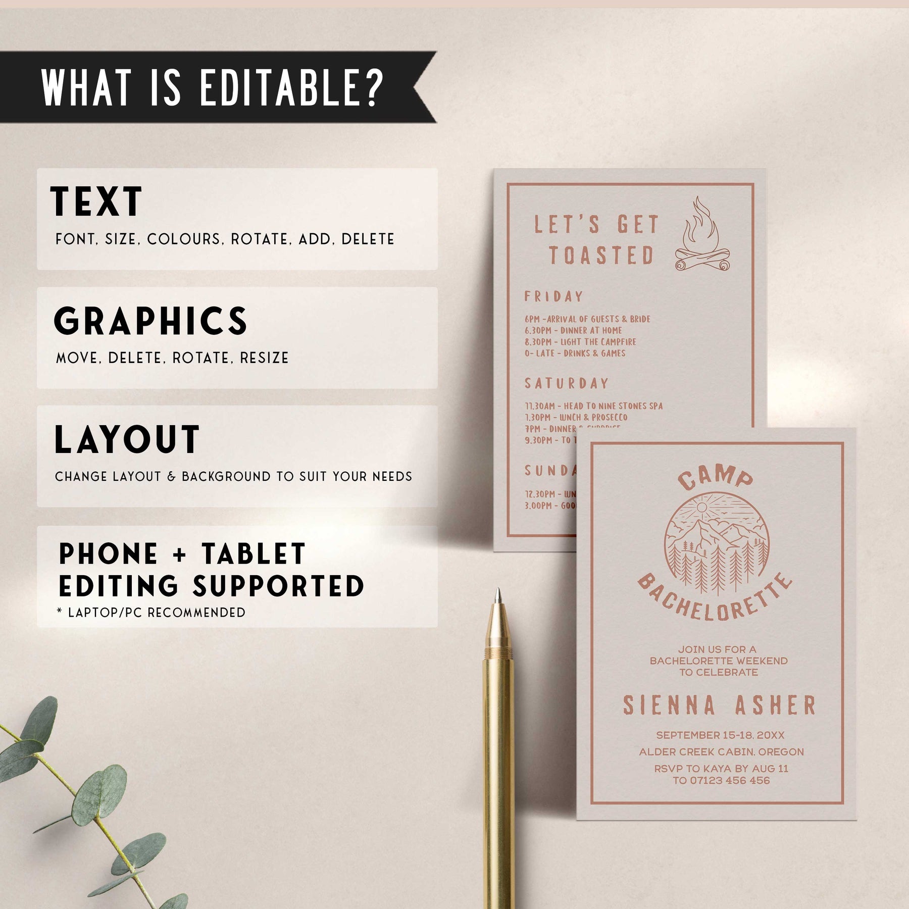 Fully editable and printable bachelorette invitations with a pine cabin design. Perfect for a cabin adventure Bachelorette themed party