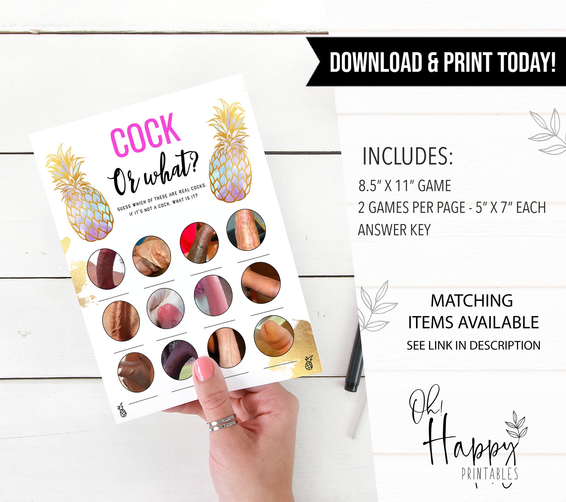 A hilarious bridal shower game that's great for brides who like to have a bit of fun! Guess whether the photo is a cock - or something a little more innocent! This printable game comes with a photo reveal answer key, and is available in two sizes.