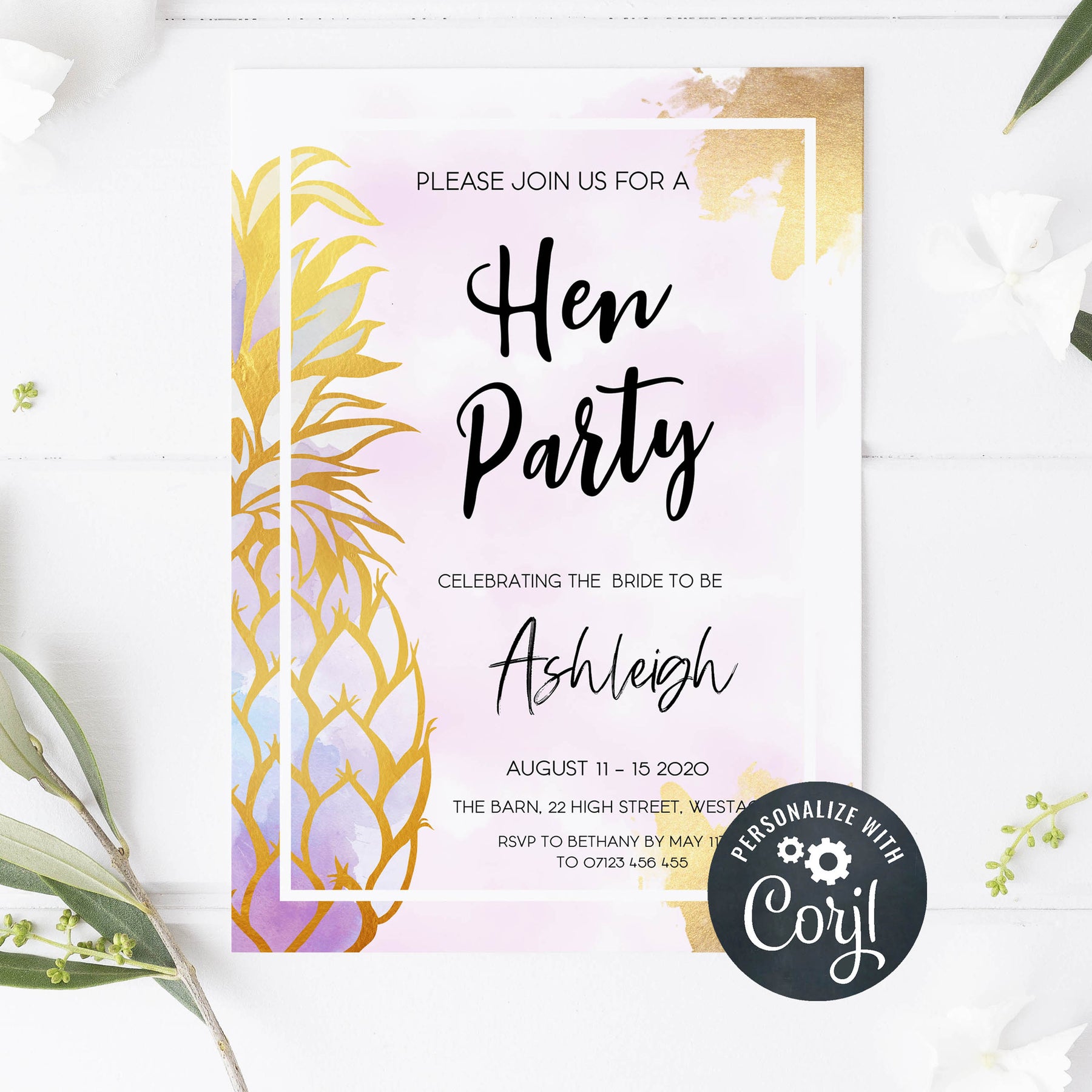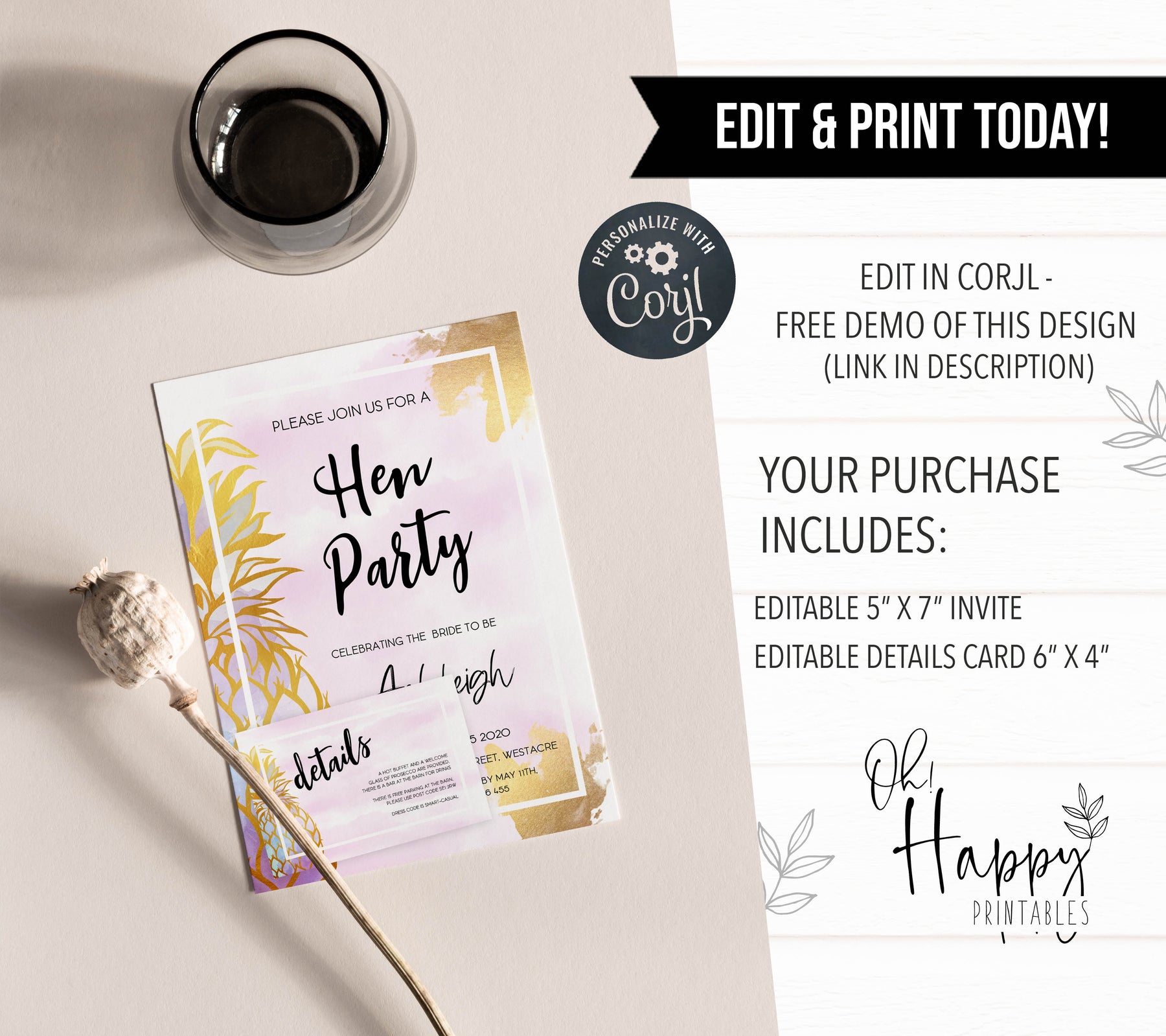 From our Gold Pineapple bridal collection, this invite is the perfect start to your bridal celebrations. Download immediately and edit yourself, it couldn't be simpler! This invitation set also includes a matching details card.