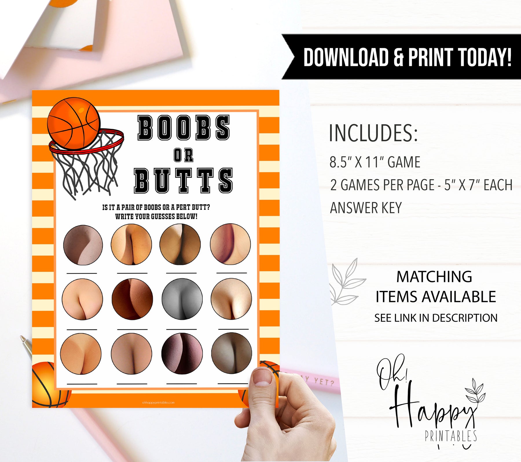 Our printable Boobs or Butts game is a hilarious baby shower game that's perfect for those who like to have a bit of fun! Guess whether the picture is a pair of womans boobs or a butt. Our printable Boobs or Butts game comes complete with answer sheet. All you need to do is download and print at home, it couldn't be easier.