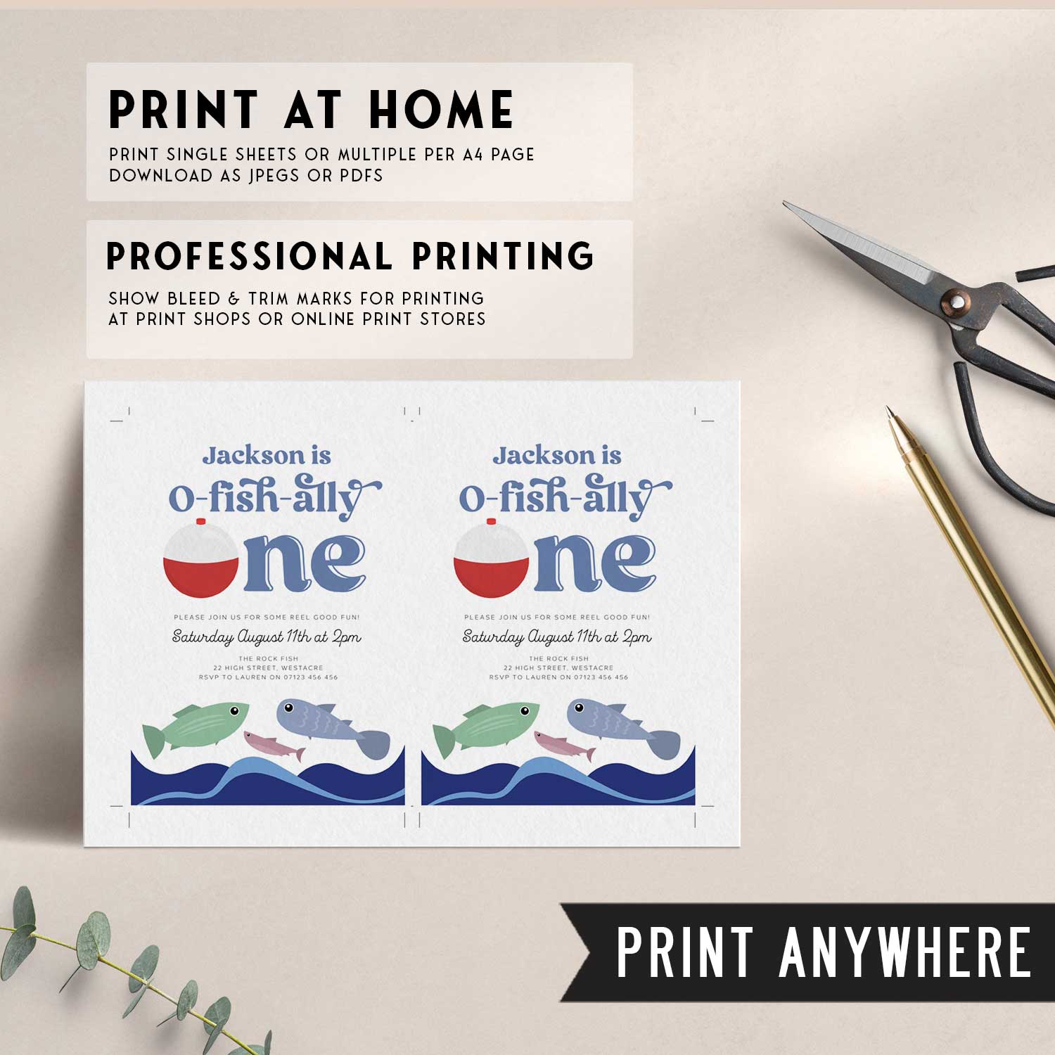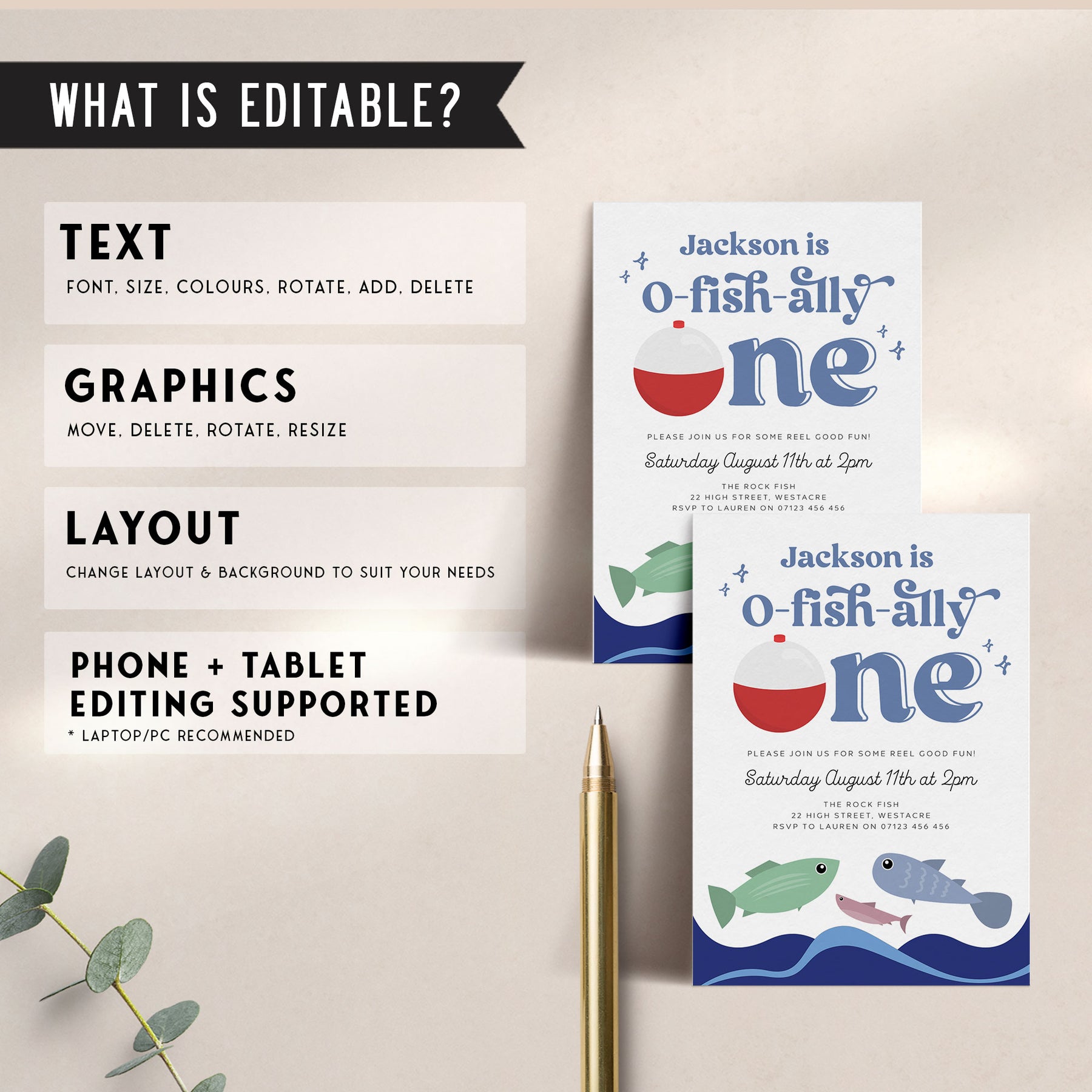 Make your little one's first birthday extra special with our Editable O-Fish-Ally One First Birthday Invitation Set. This set includes both 5x7 printable invitations and mobile-friendly version, with adorable fishing illustration. Customise the text to add your child's name and birthday details. Whether you choose to print or share digitally, our invitations gives you ease and flexibility. Let our editable O-Fish-Ally-One First Birthday invitation Set set the perfect tone for a memorable celebration honouring your little ones first birthday.
