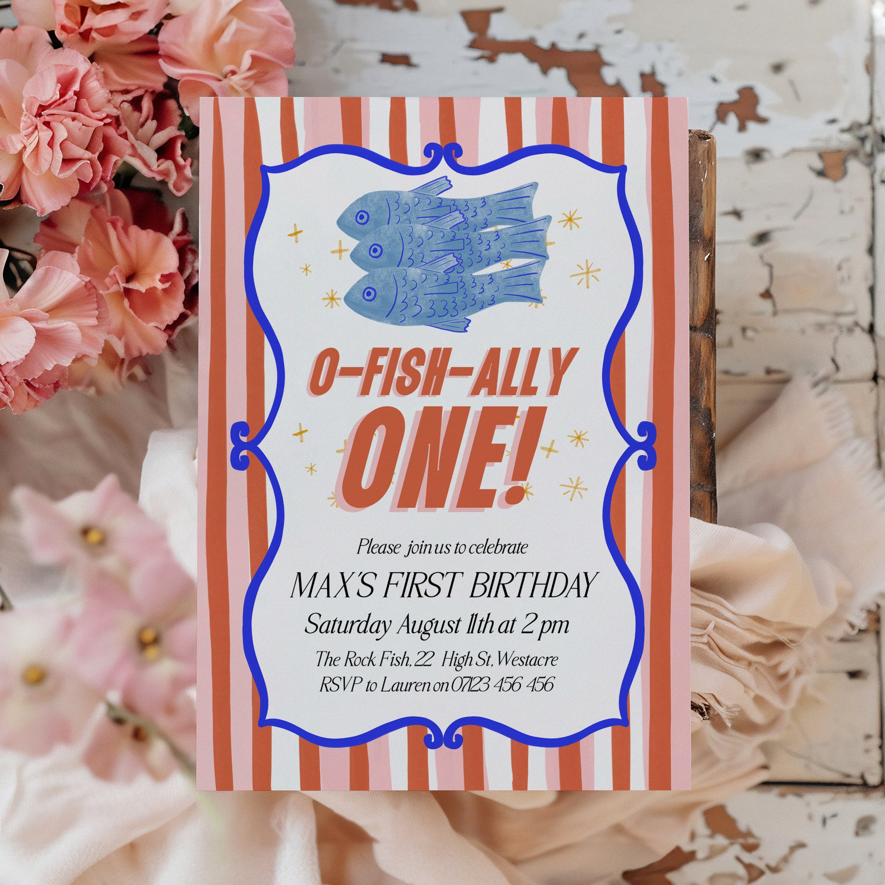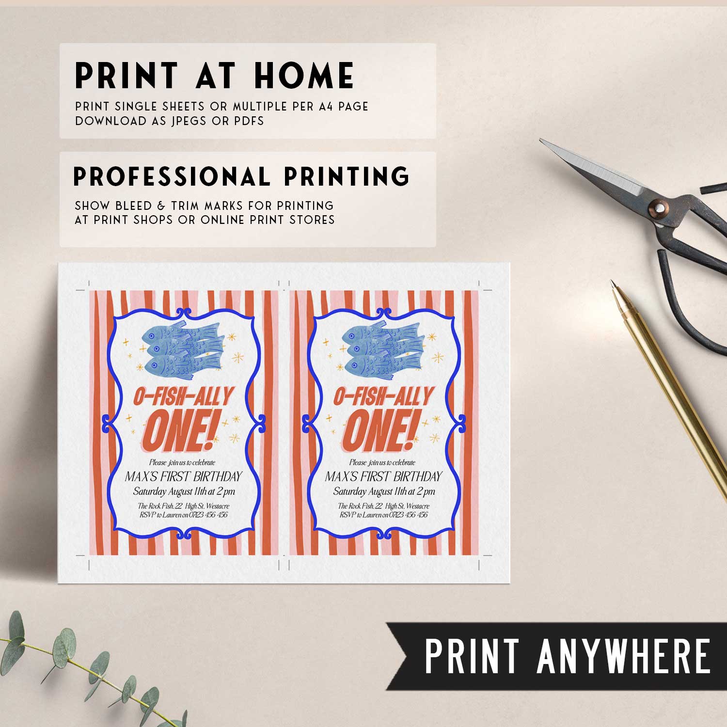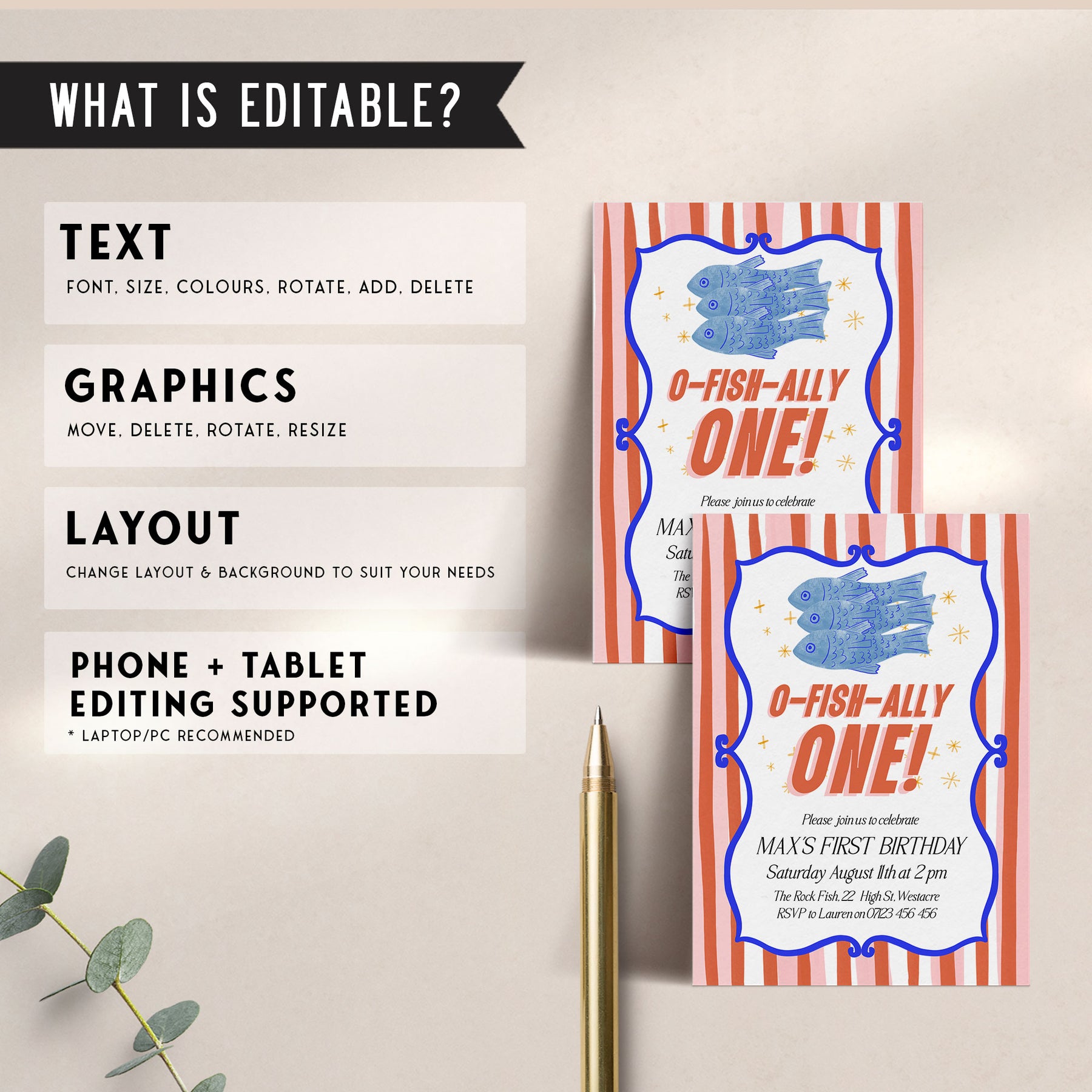 Make your little one's first birthday extra special with our Editable O-Fish-Ally One First Birthday Invitation Set. This set includes both 5x7 printable invitations and mobile-friendly version, with adorable fishing illustration. Customise the text to add your child's name and birthday details. Whether you choose to print or share digitally, our invitations gives you ease and flexibility. Let our editable O-Fish-Ally-One First Birthday invitation Set set the perfect tone for a memorable celebration honouring your little ones first birthday.