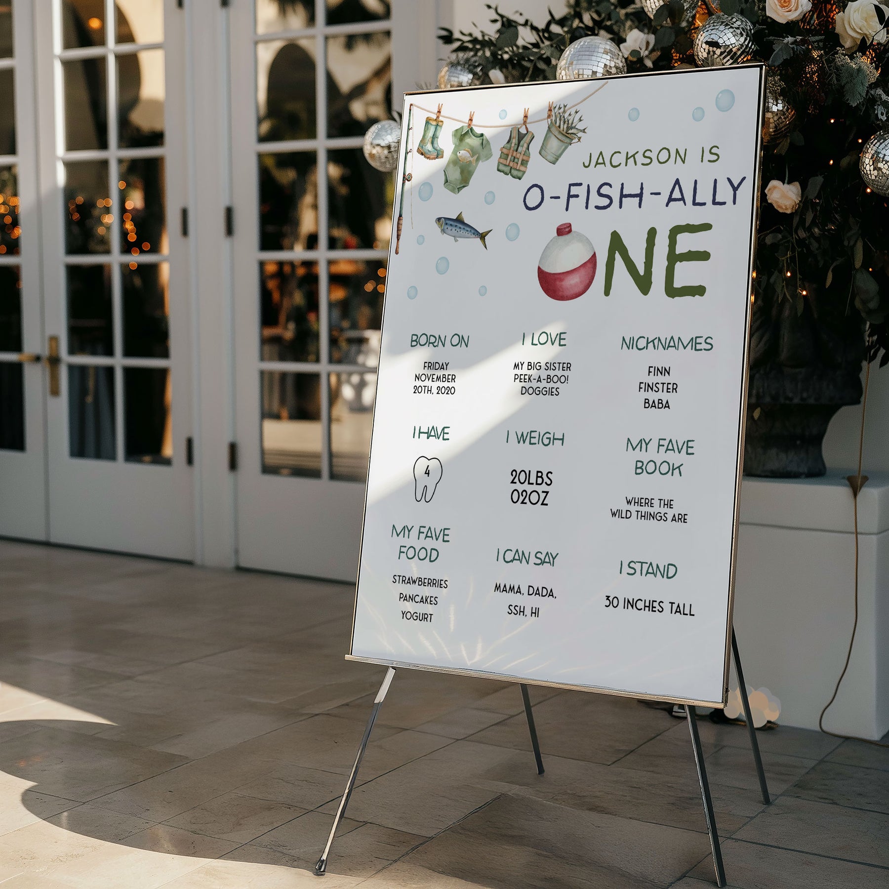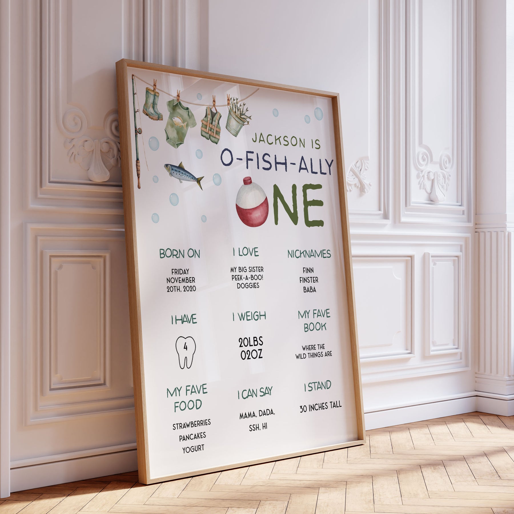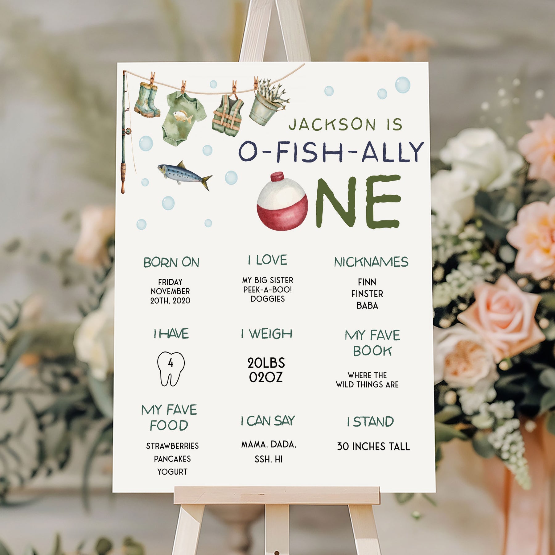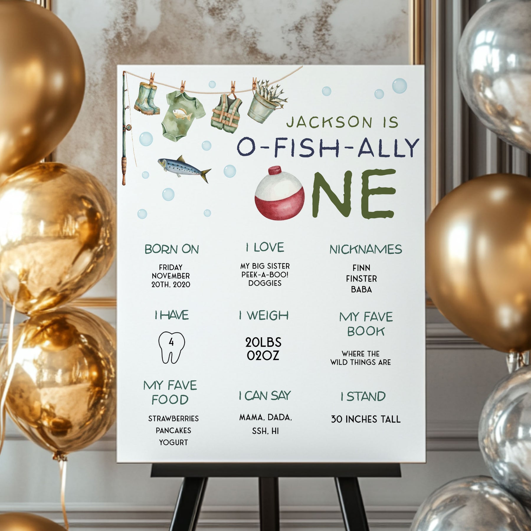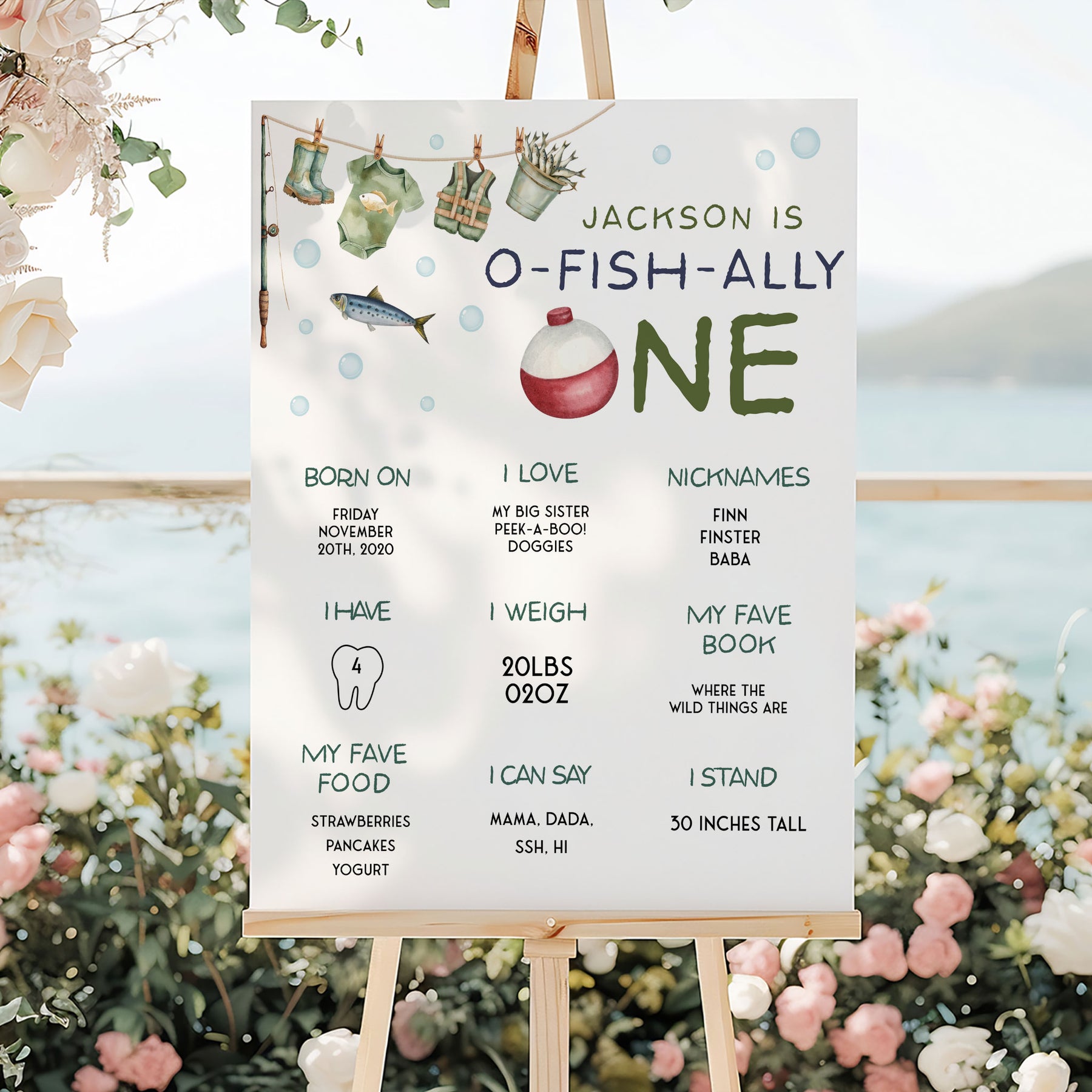 Introducing our O-Fish-Ally One 1st Birthday Poster, the ideal addition to celebrate your little one milestone! This personalised My First Year Birthday Milestone Board captures all the unforgettable moments of your little ones first year. With a fishing-themed design, this editable template allows you to customise the stats and details, making it a unique keepsake. Displaying your little one's growth, from his first steps to his favorite team, this poster serves as a delightful centrepiece for your little ones birthday party.