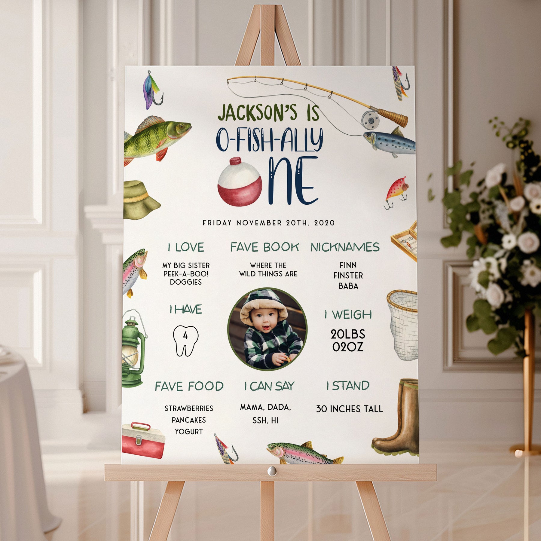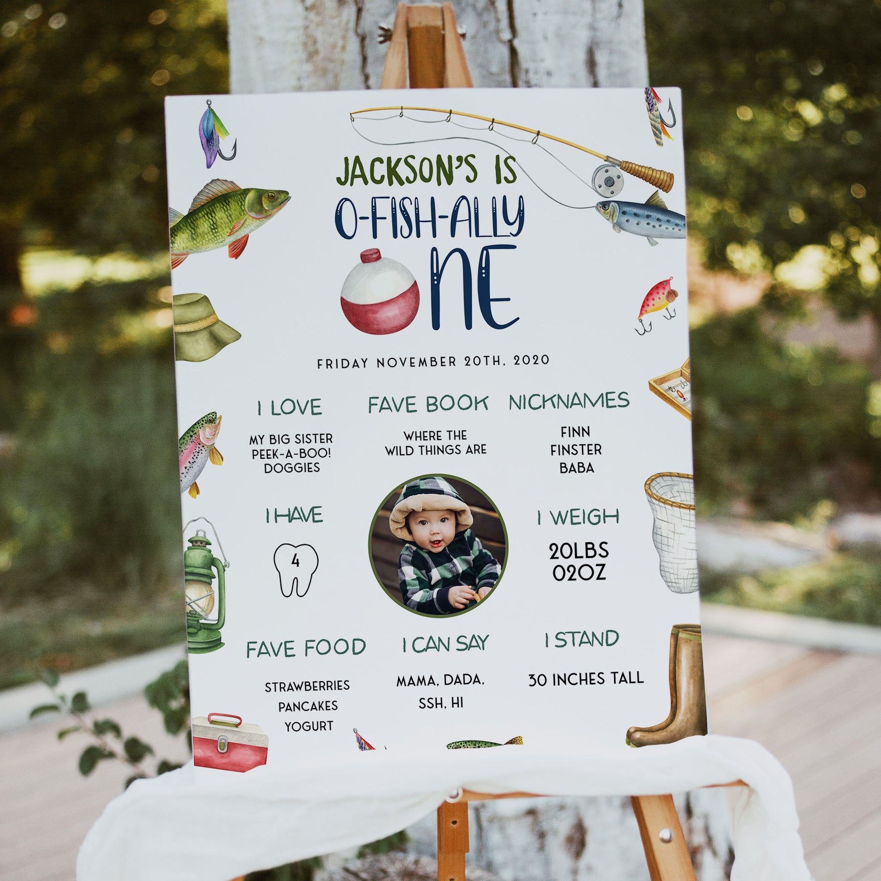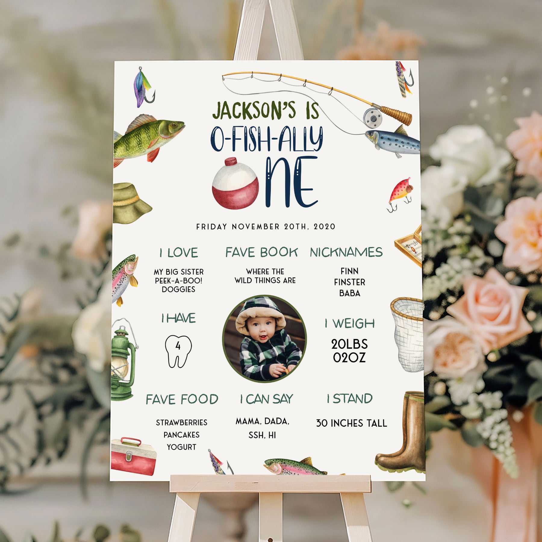 Introducing our O-Fish-Ally One 1st Birthday Poster, the ideal addition to celebrate your little one milestone! This personalised My First Year Birthday Milestone Board captures all the unforgettable moments of your little ones first year. With a fishing-themed design, this editable template allows you to customise the stats and details, making it a unique keepsake. Displaying your little one's growth, from his first steps to his favorite team, this poster serves as a delightful centrepiece for your little ones birthday party.