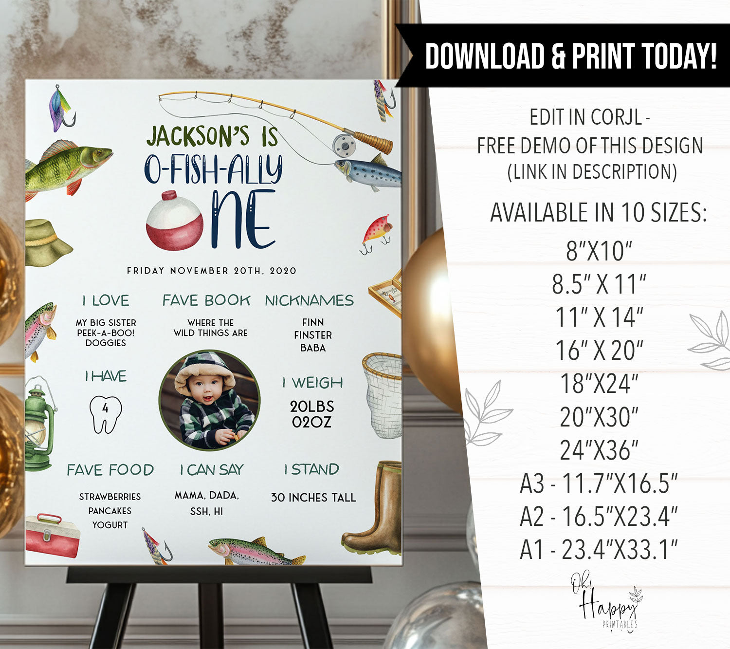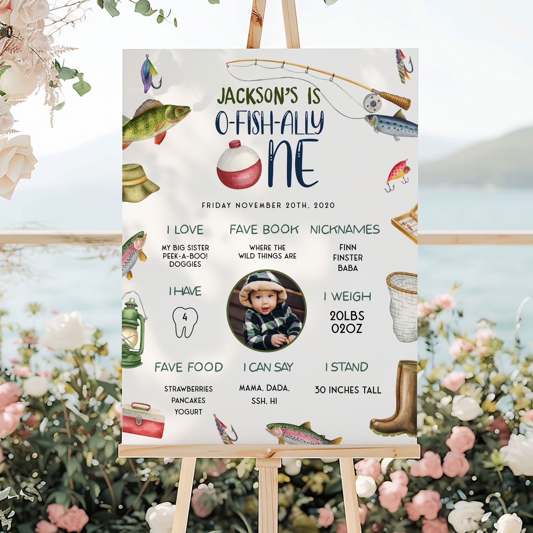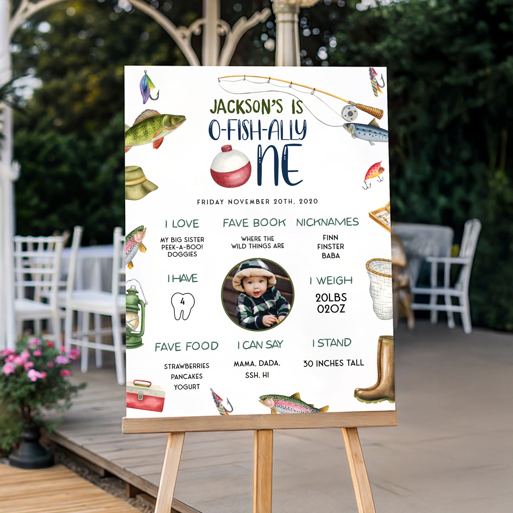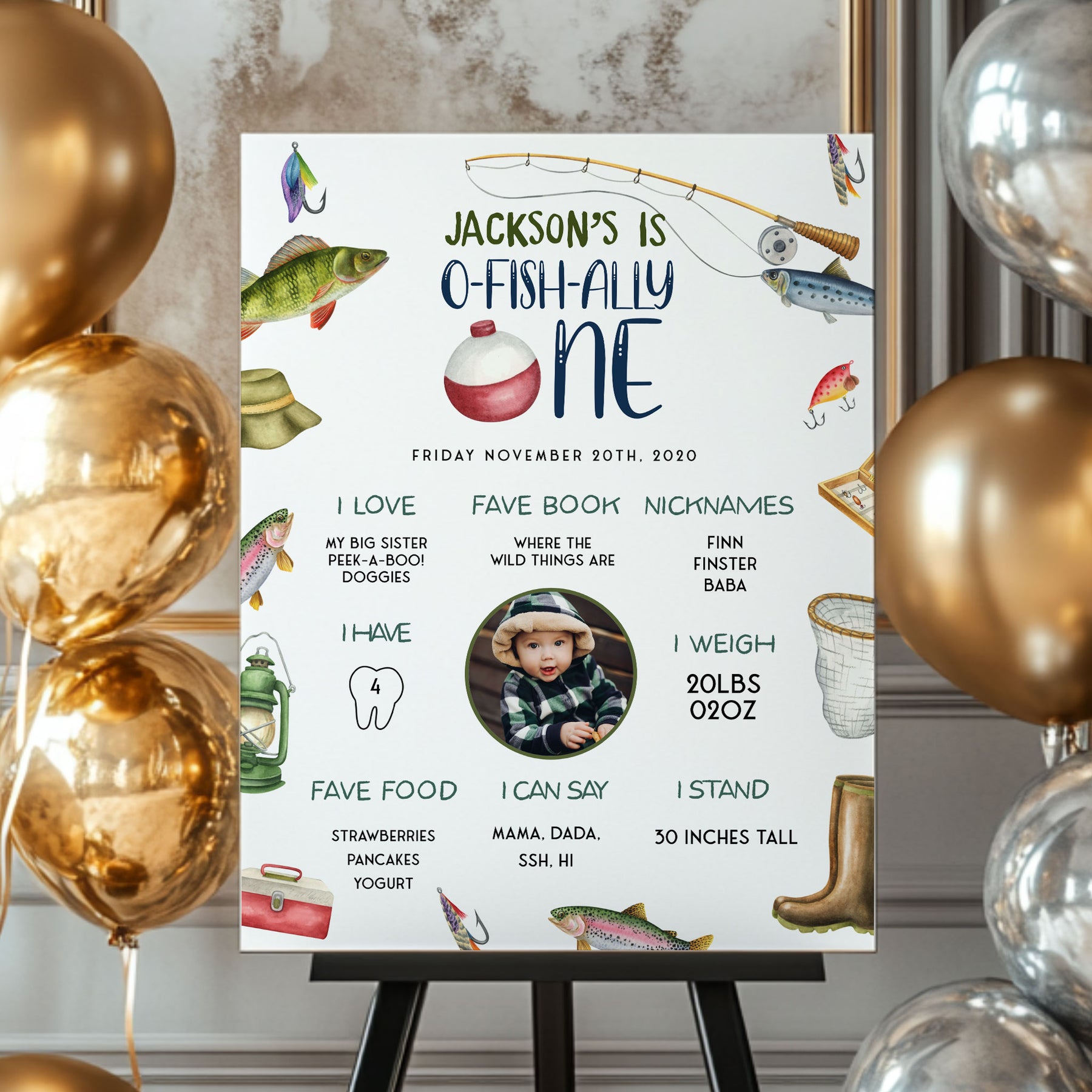 Introducing our O-Fish-Ally One 1st Birthday Poster, the ideal addition to celebrate your little one milestone! This personalised My First Year Birthday Milestone Board captures all the unforgettable moments of your little ones first year. With a fishing-themed design, this editable template allows you to customise the stats and details, making it a unique keepsake. Displaying your little one's growth, from his first steps to his favorite team, this poster serves as a delightful centrepiece for your little ones birthday party.