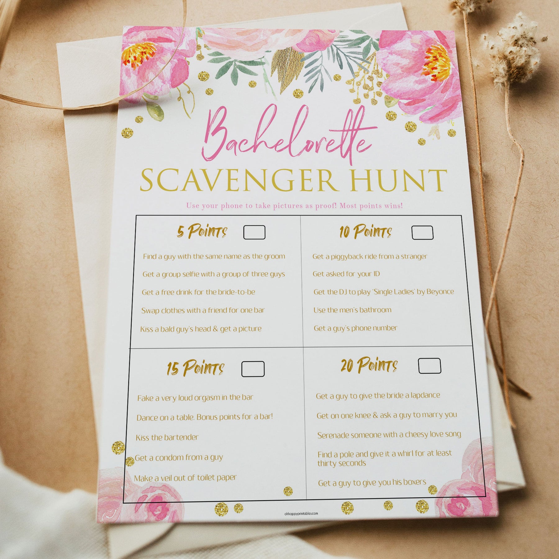 A scavenger hunt is an essential for any fun and wild Bachelorette party! Our printable scavenger hunt is the perfect addition to your night. Featuring a variety of challenges and dares, see who can get the most points by the end of the night. The harder the dare, the more points you earn!