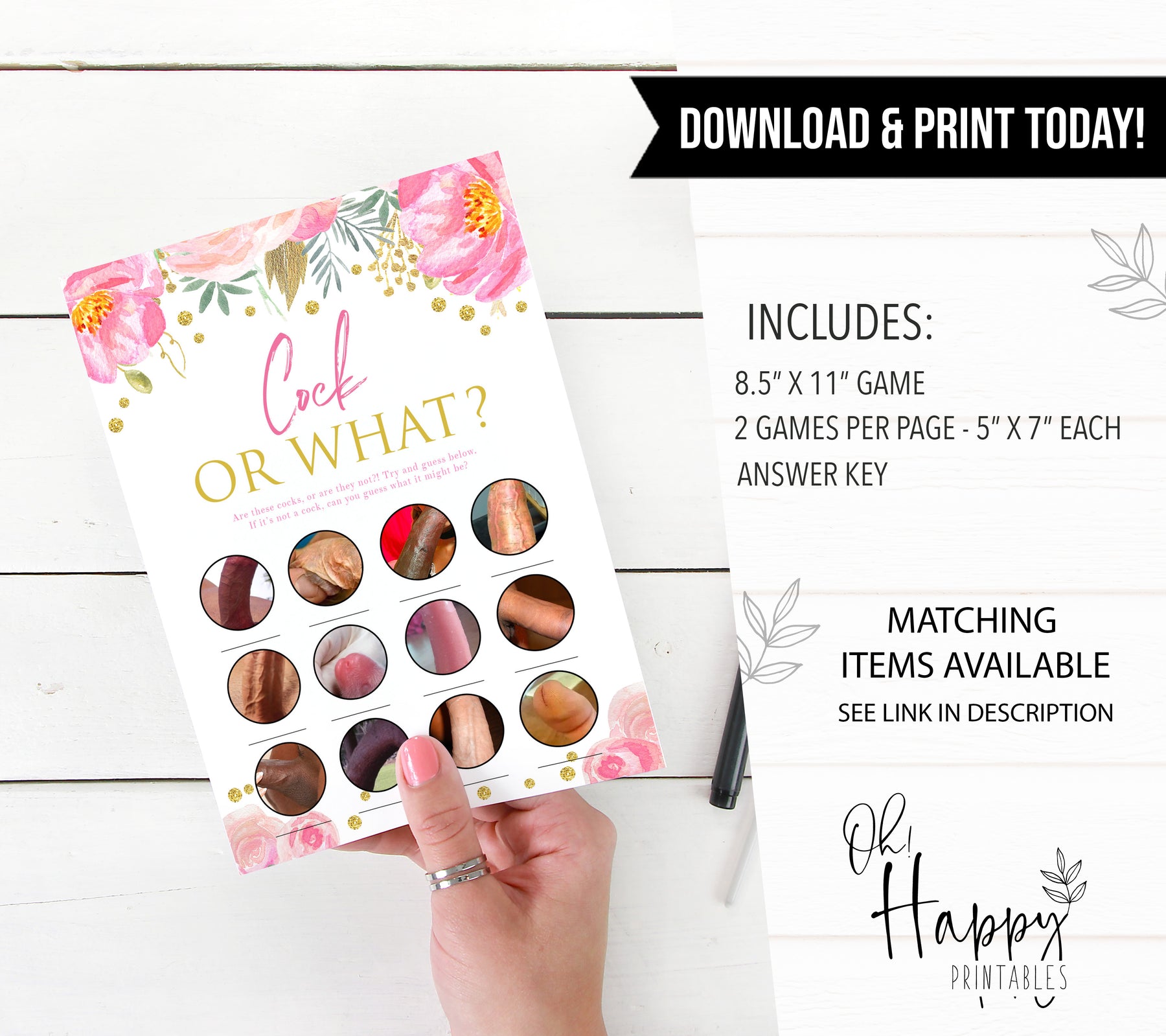 A hilarious bridal shower game that's great for brides who like to have a bit of fun! Guess whether the photo is a cock - or something a little more innocent! This printable game comes with a photo reveal answer key, and is available in two sizes.