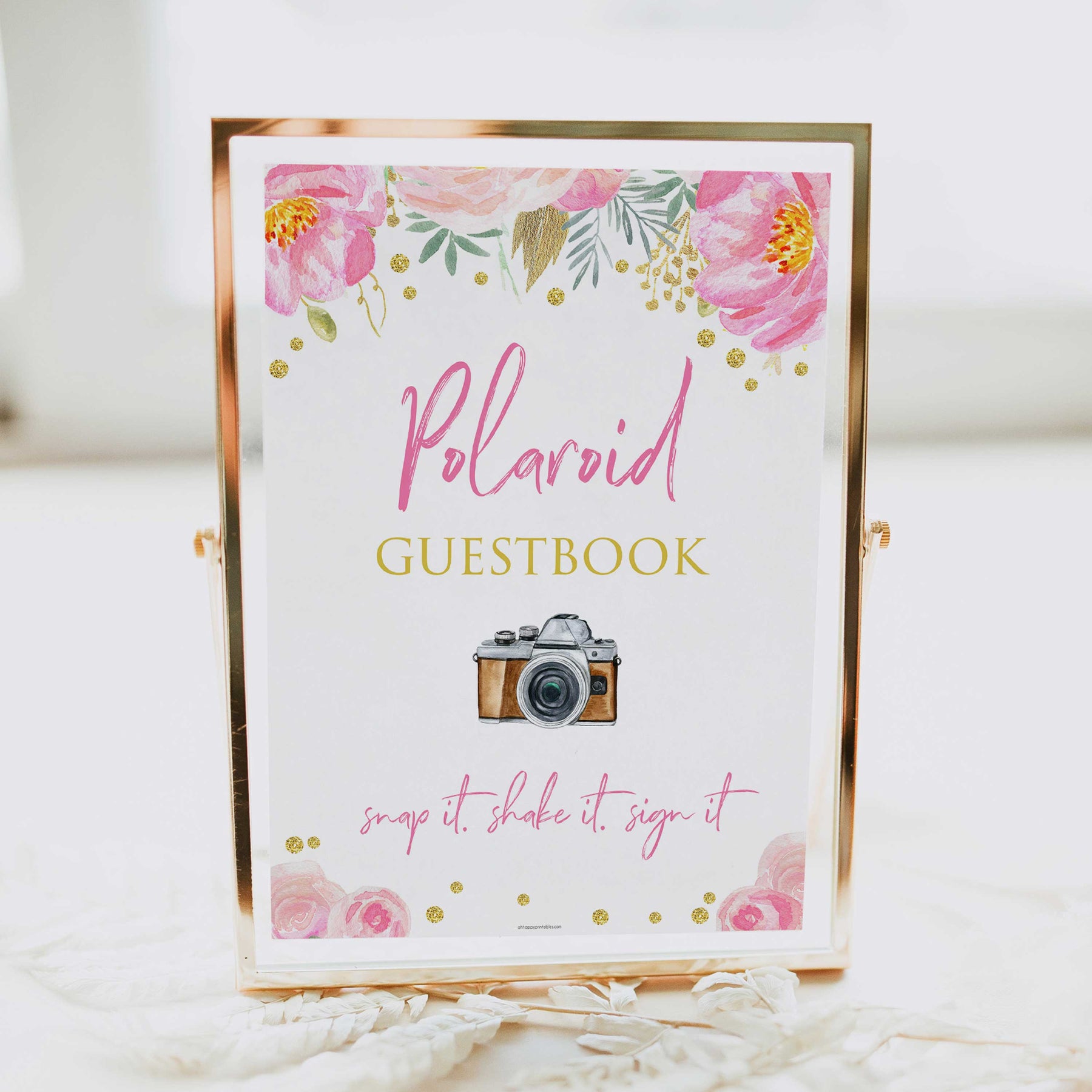 Snap it, shake it, and sign it! Polaroid guestbooks are a unique way to keep special memories alive of your big day. Get your guests to snap a photo of themselves, and you get to keep the photo as a memento. This cute table sign is perfect for putting into a frame for any table display. Download and print at home, it couldn't be easier.