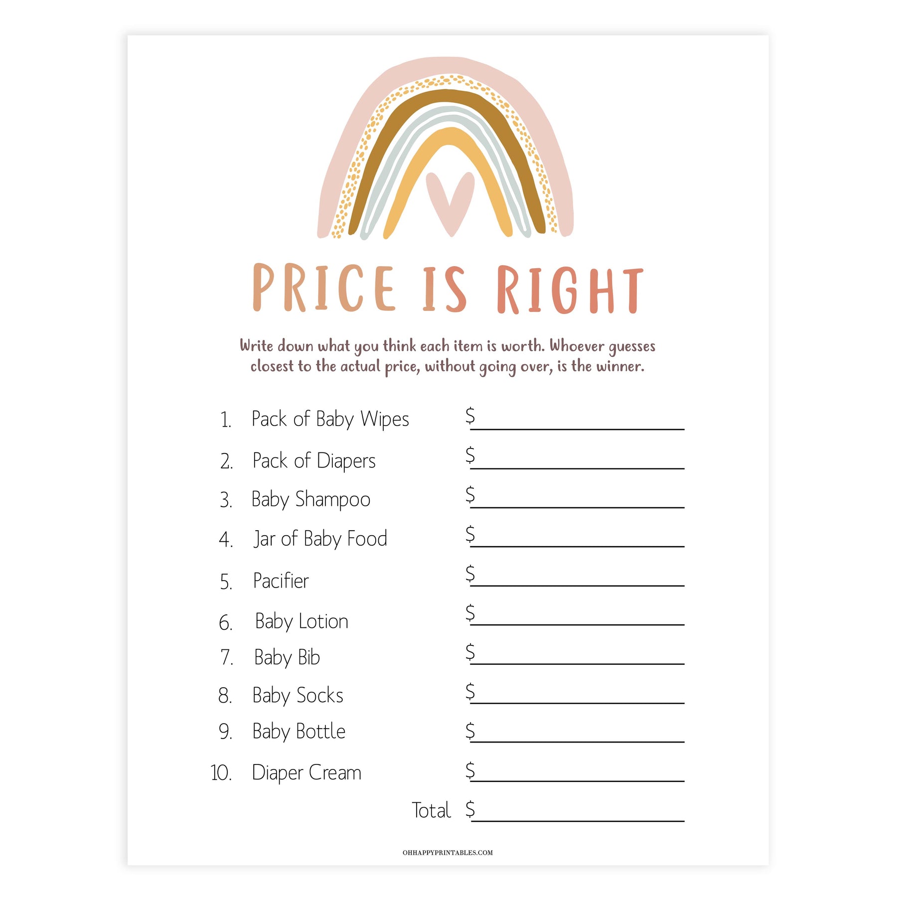 This Baby Shower Price is Right game contains 10 must have baby items. All the guests have to guess what the cost of each item was. The hostess purchases the items prior to the Baby Shower, keeping the receipt. With the products on display, guests fill out their cards and overall total. When everyone is finished, the hostess reveals the individual costs and total from the receipt. The one with the closest answer wins.