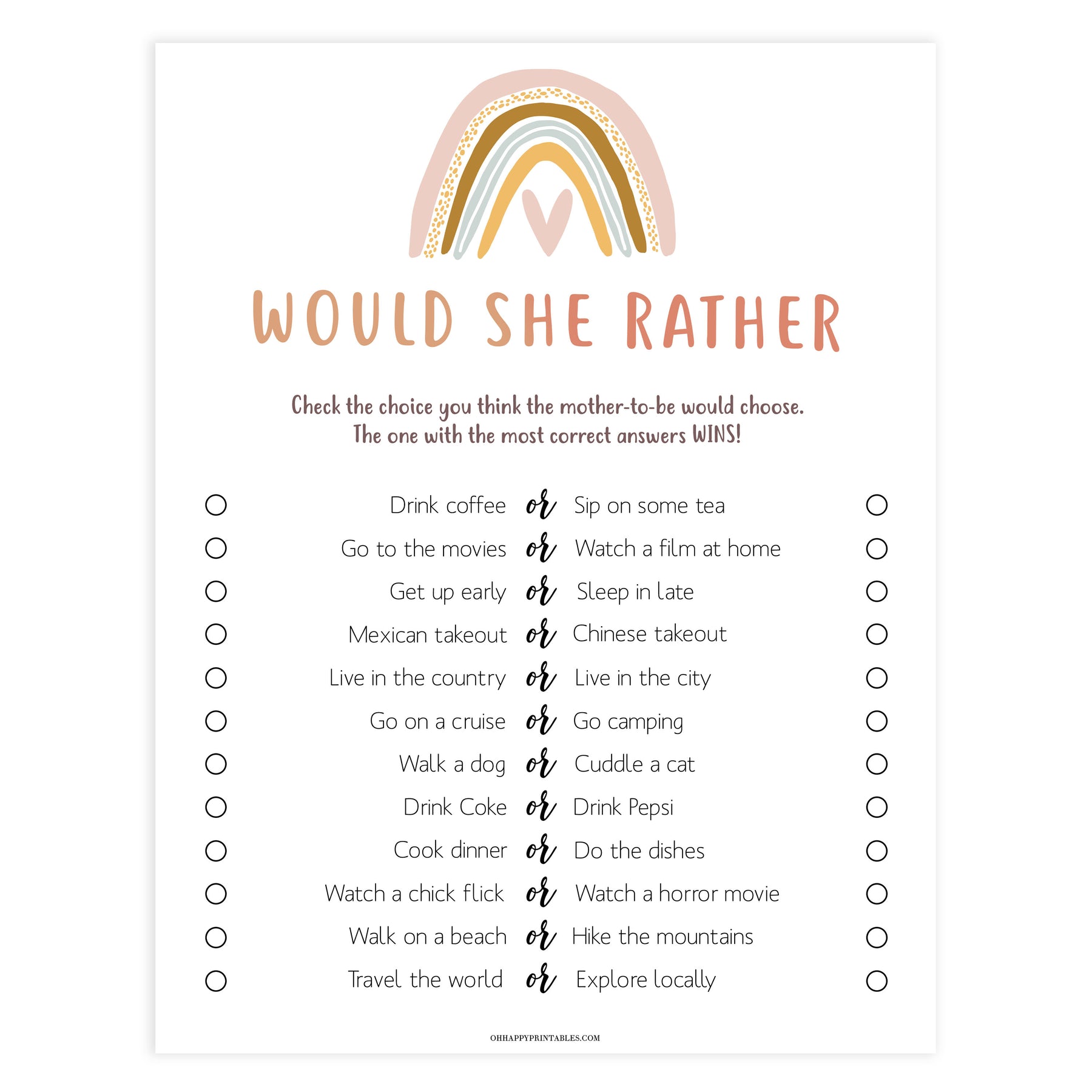 Would She Rather is a popular game that puts the new mother-to-be in the spotlight! Guess what she would do in each of the scenarios! A fun baby shower game that your guests will love to play.