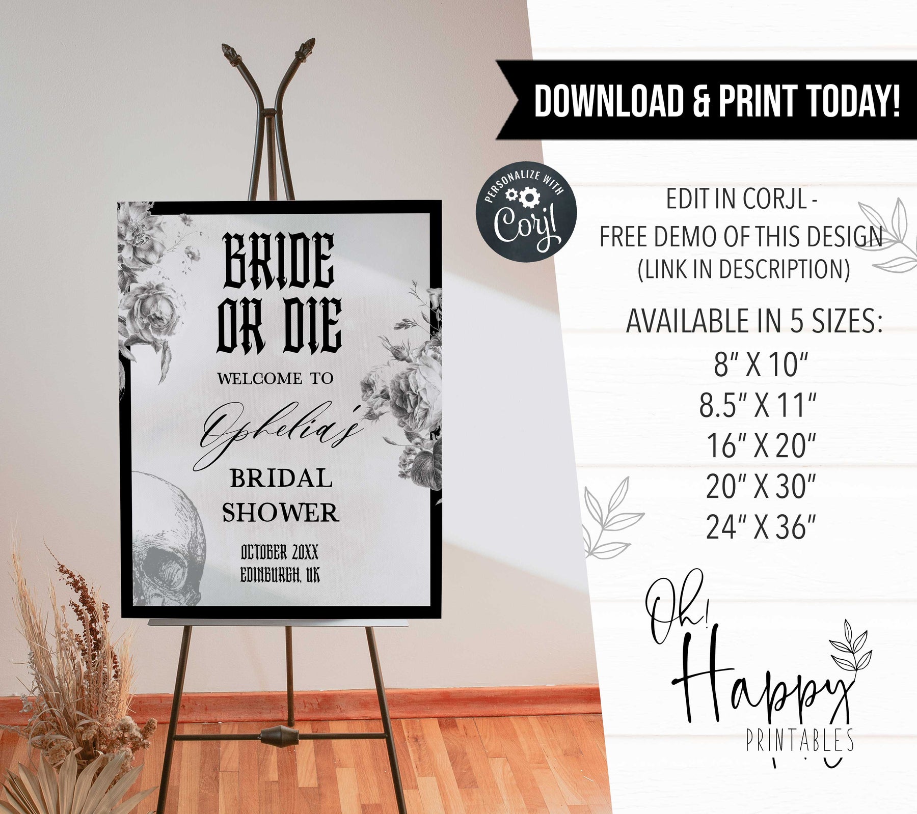 This gothic inspired bridal shower welcome sign adds the perfect finishing touch to your Bride or Die hen party. It's a fully editable template that can be printed at home, or at the print shop of your choice! Find all your hen party games, hen party decor and more in our store 💜