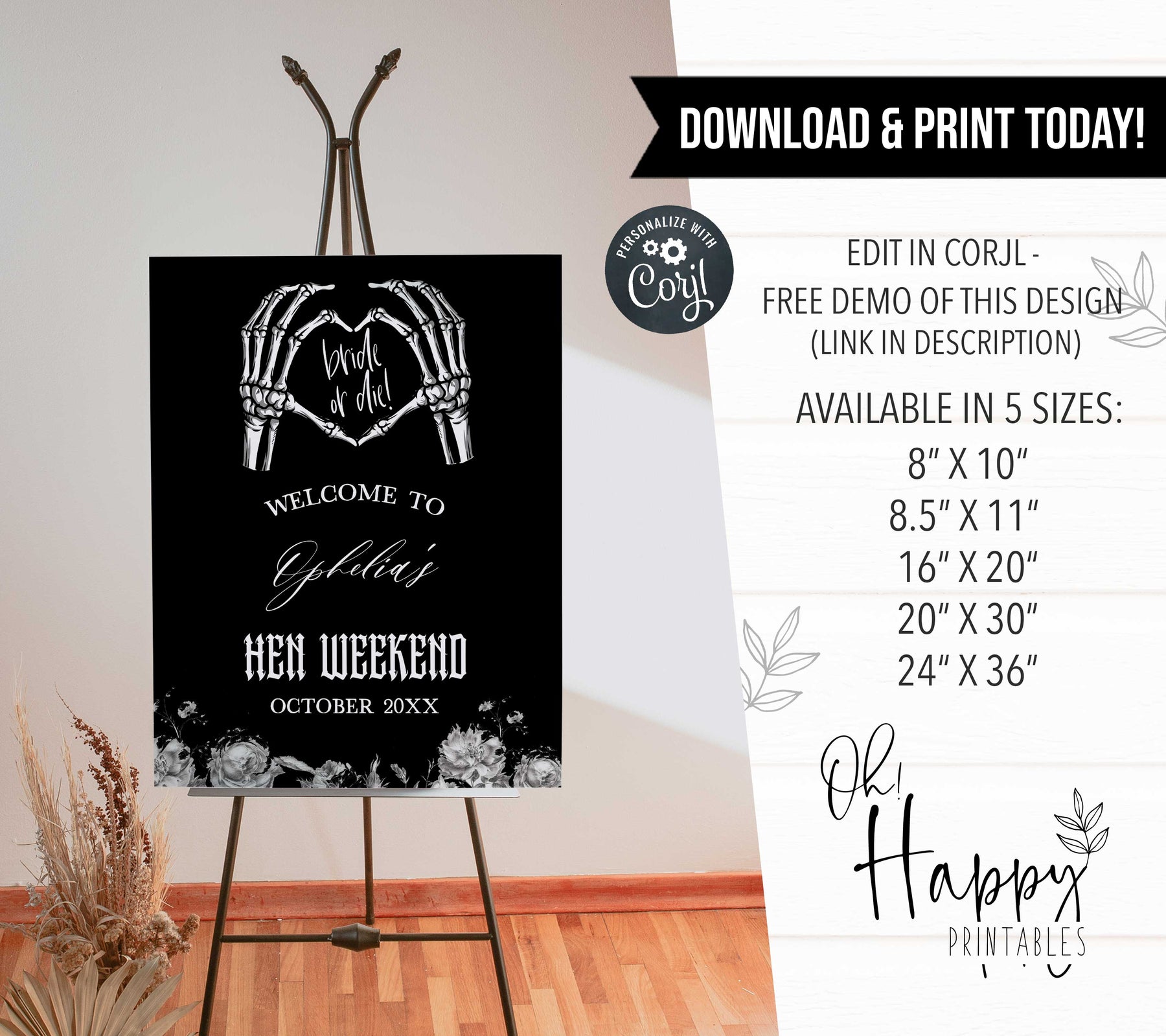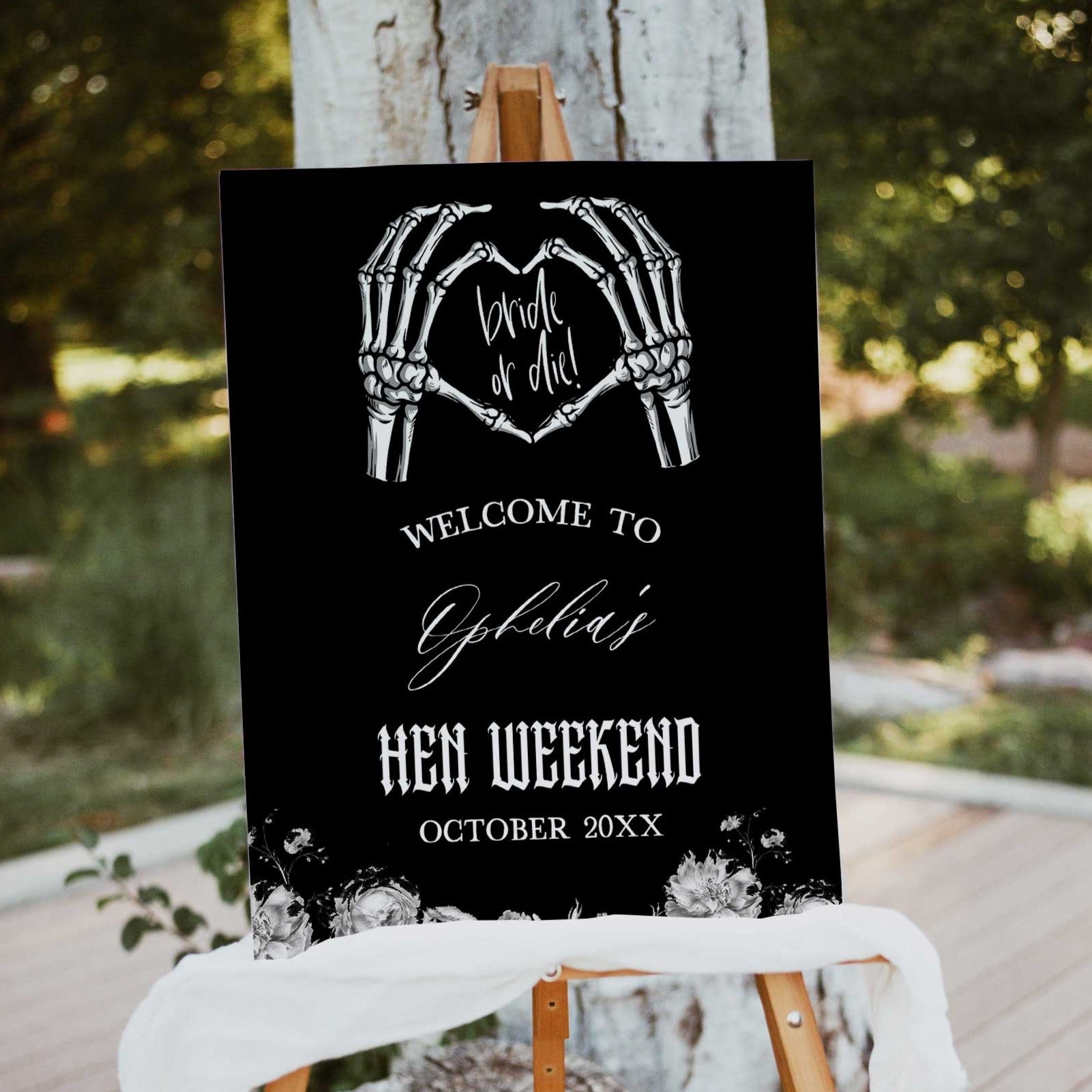 This gothic inspired hen party welcome sign adds the perfect finishing touch to your Bride or Die hen party. It's a fully editable template that can be printed at home, or at the print shop of your choice! Find all your hen party games, hen party decor and more in our store 💜
