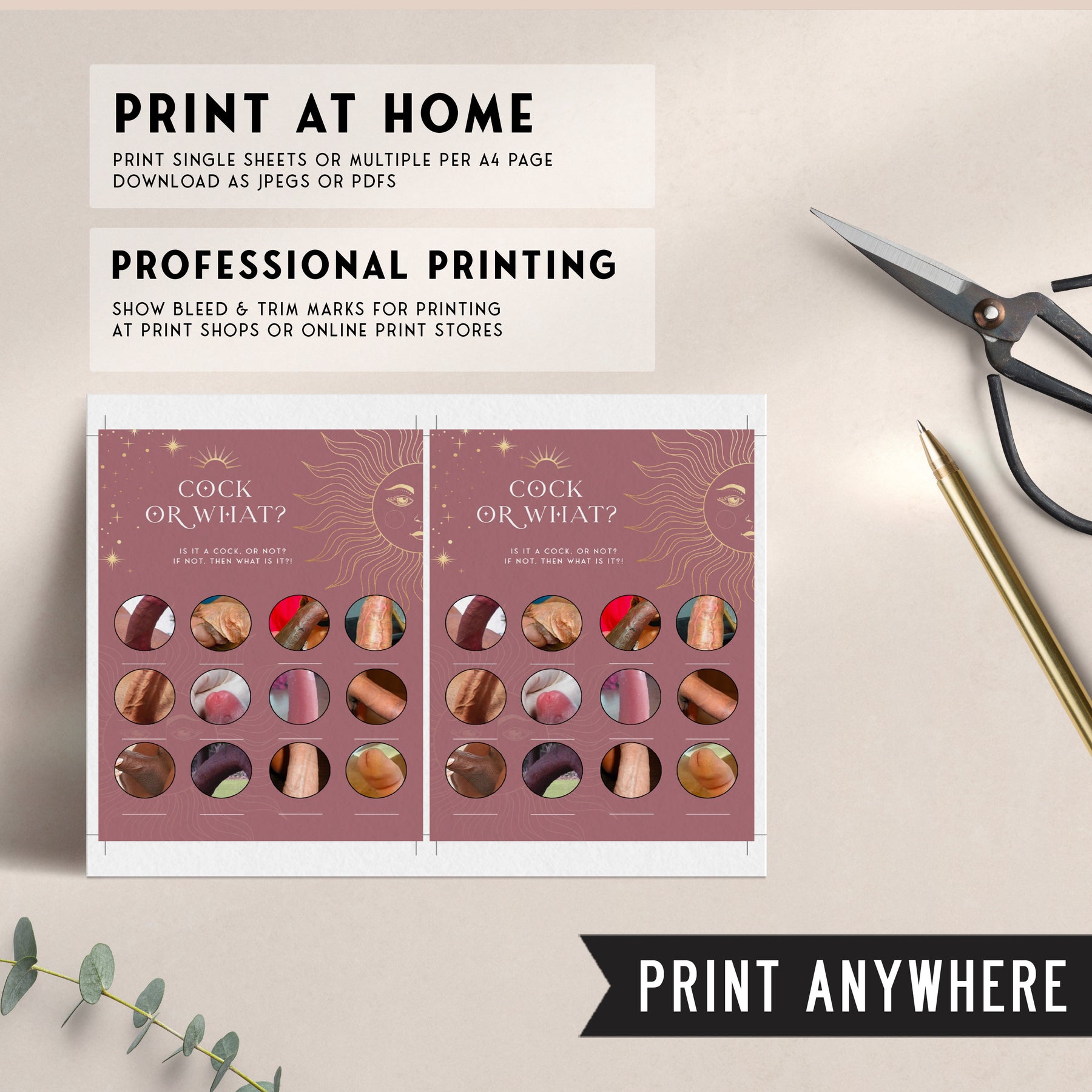 A hilarious bridal shower game that's great for brides who like to have a bit of fun! Guess whether the photo is a cock - or something a little more innocent! This printable game comes with a photo reveal answer key, and is available in two sizes.