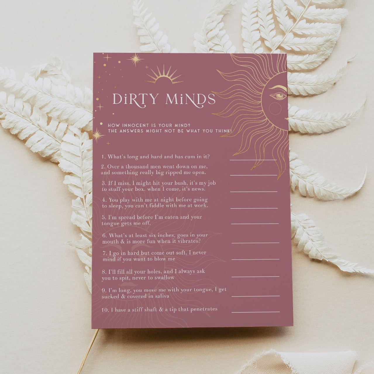 Can you guess the innocent answers from the rather naughty clues? If you have a dirty mind, some of the real answers might be impossible to guess! A hilarious game for a Bachelorette party that will have everyone in stitches.