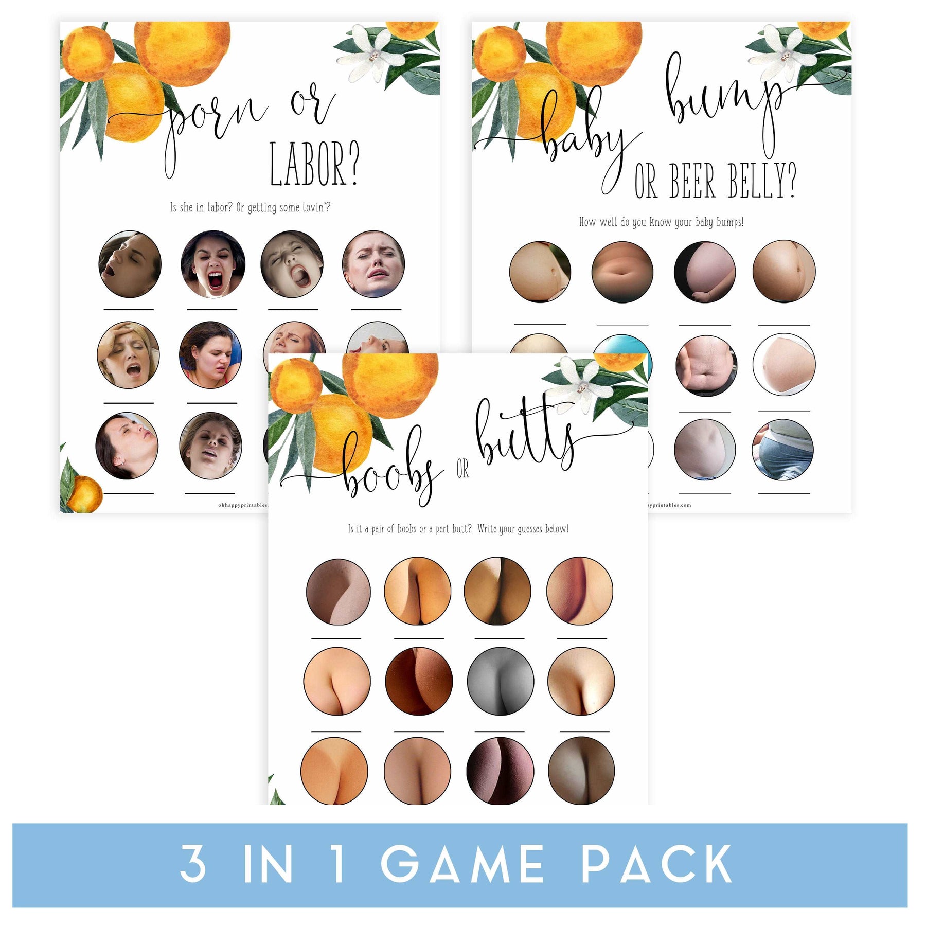 Get three of our most popular baby shower games, Porn or Labor, Baby Bump or Beer Belly, and Boobs or Butts in this amazing triple pack.