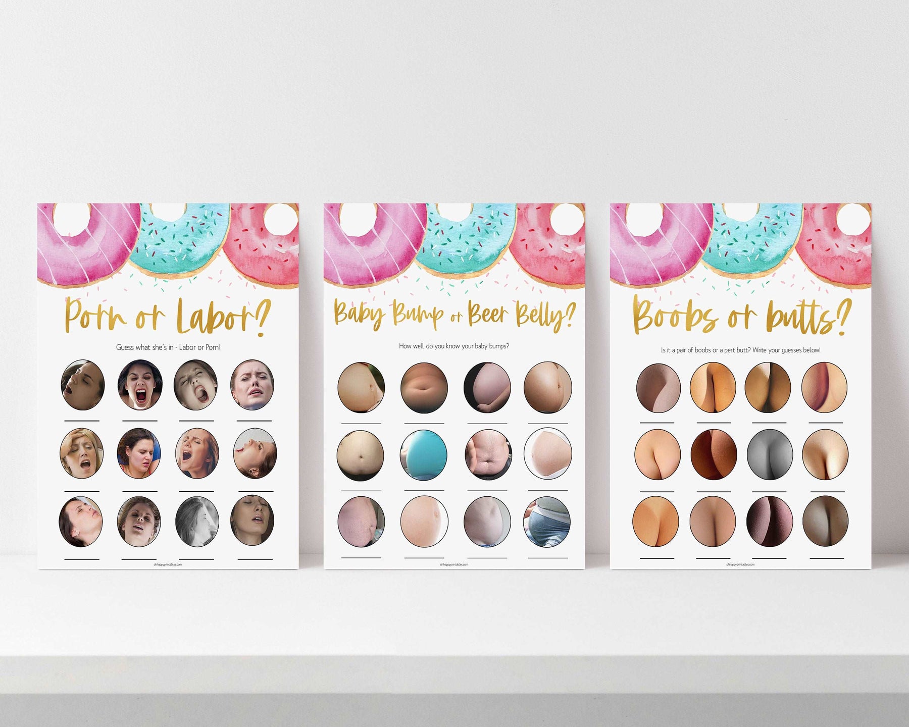 Get three of our most popular baby shower games, Porn or Labor, Baby Bump or Beer Belly, and Boobs or Butts in this amazing triple pack.