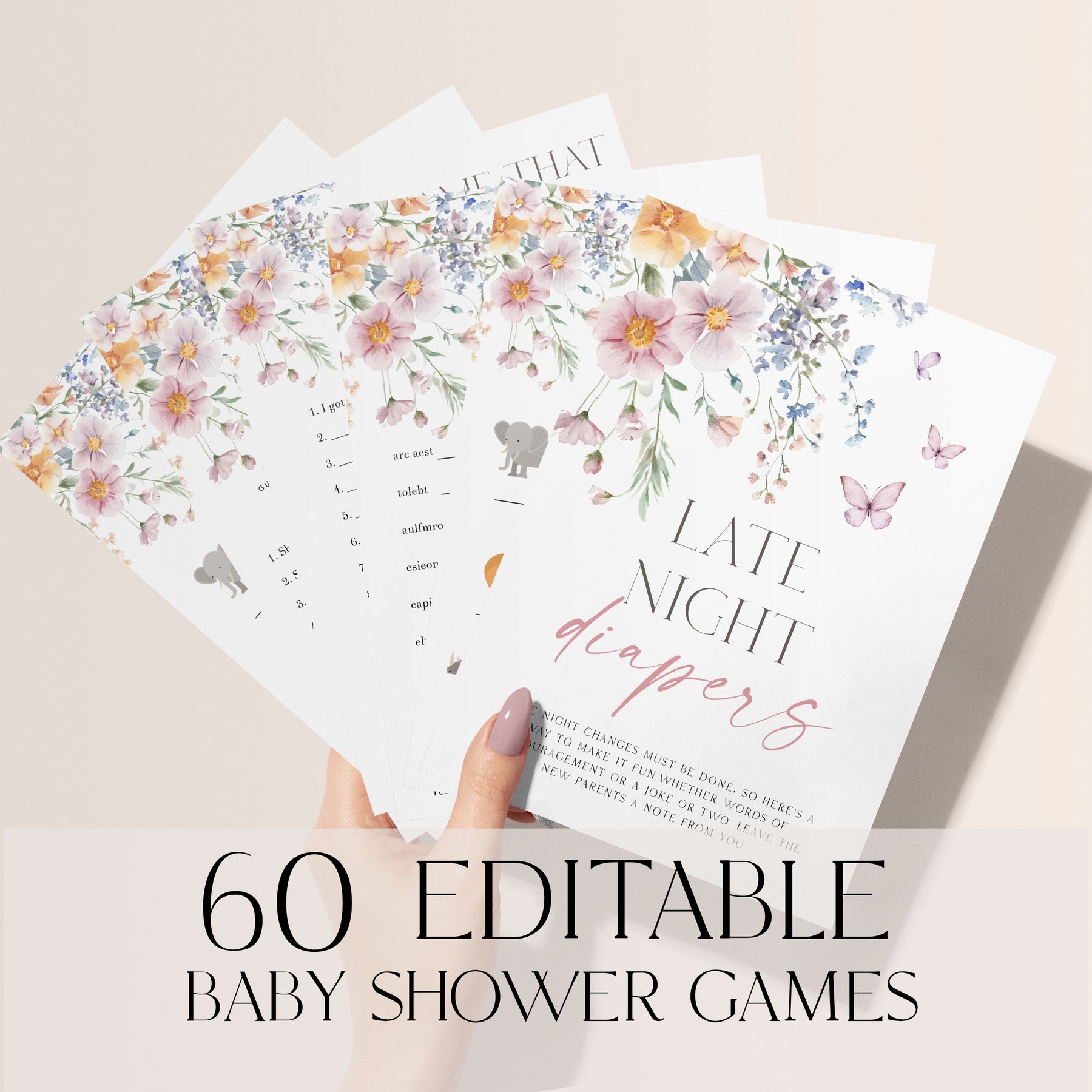 60 of the best and most hilarious baby shower games in one package, in our Baby In Bloom baby shower theme. These are fully editable and available immediately after purchase. Make your Baby In Bloom baby shower party one to remember!
