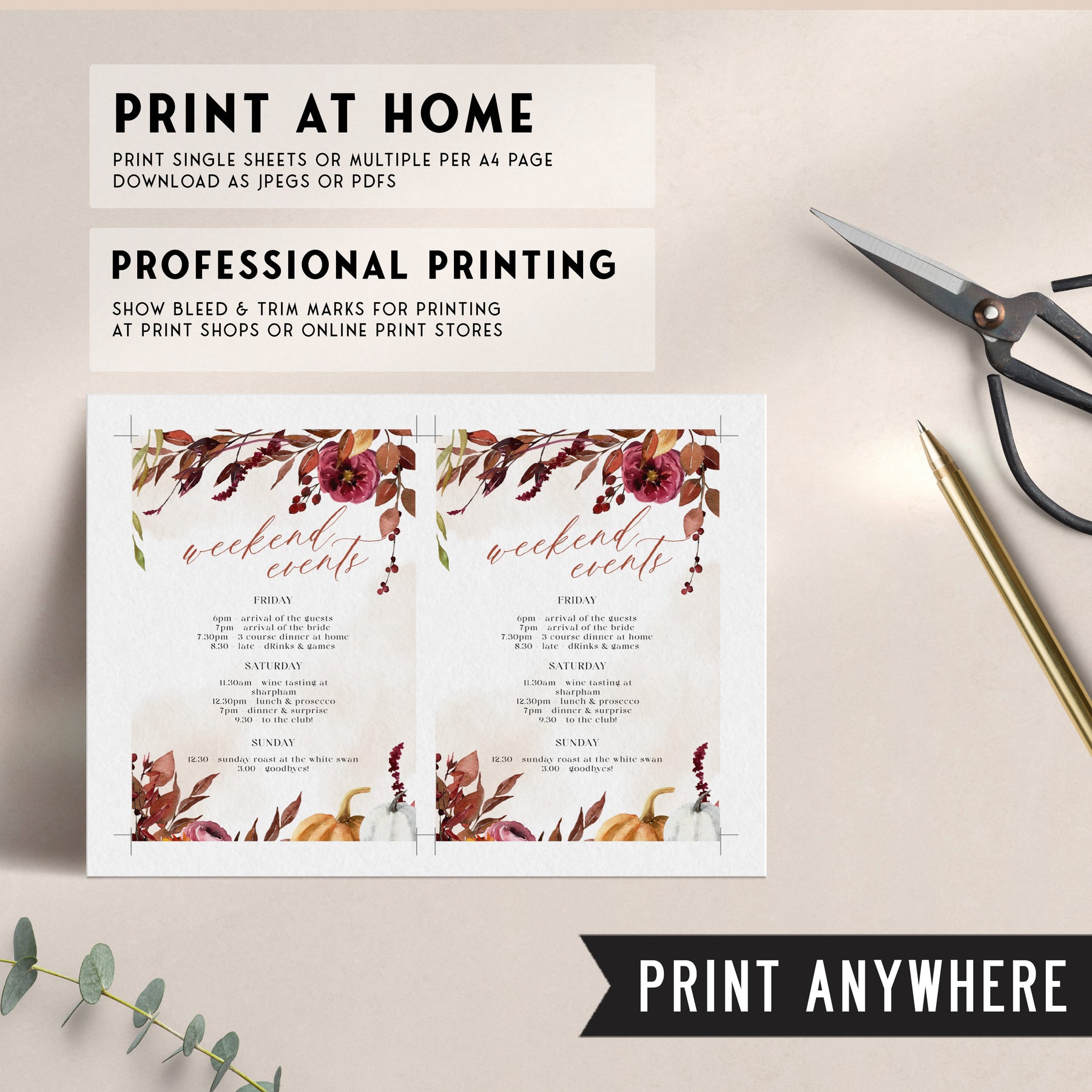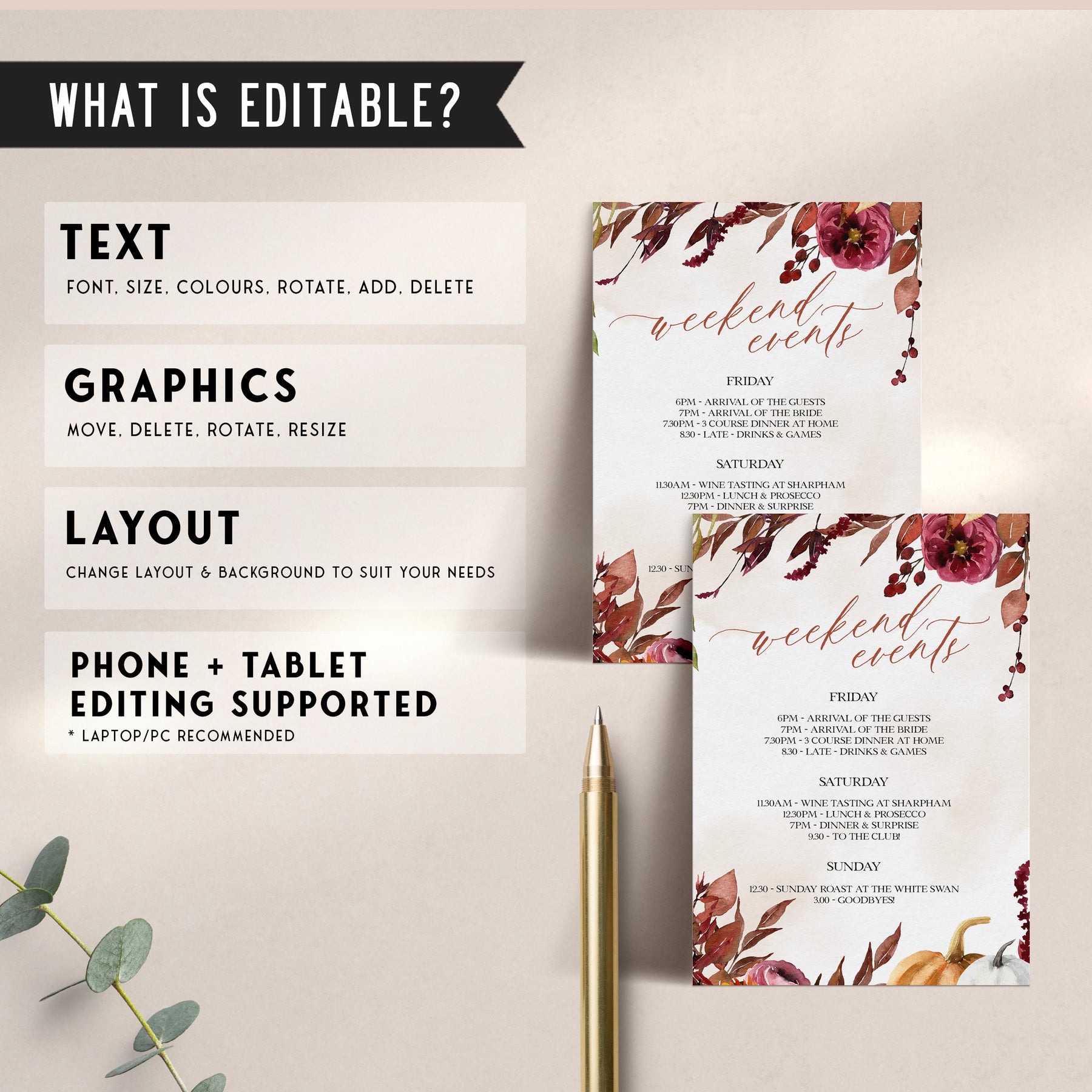 Fully editable and printable itinerary with a Fall design. Perfect for a fall floral bridal shower